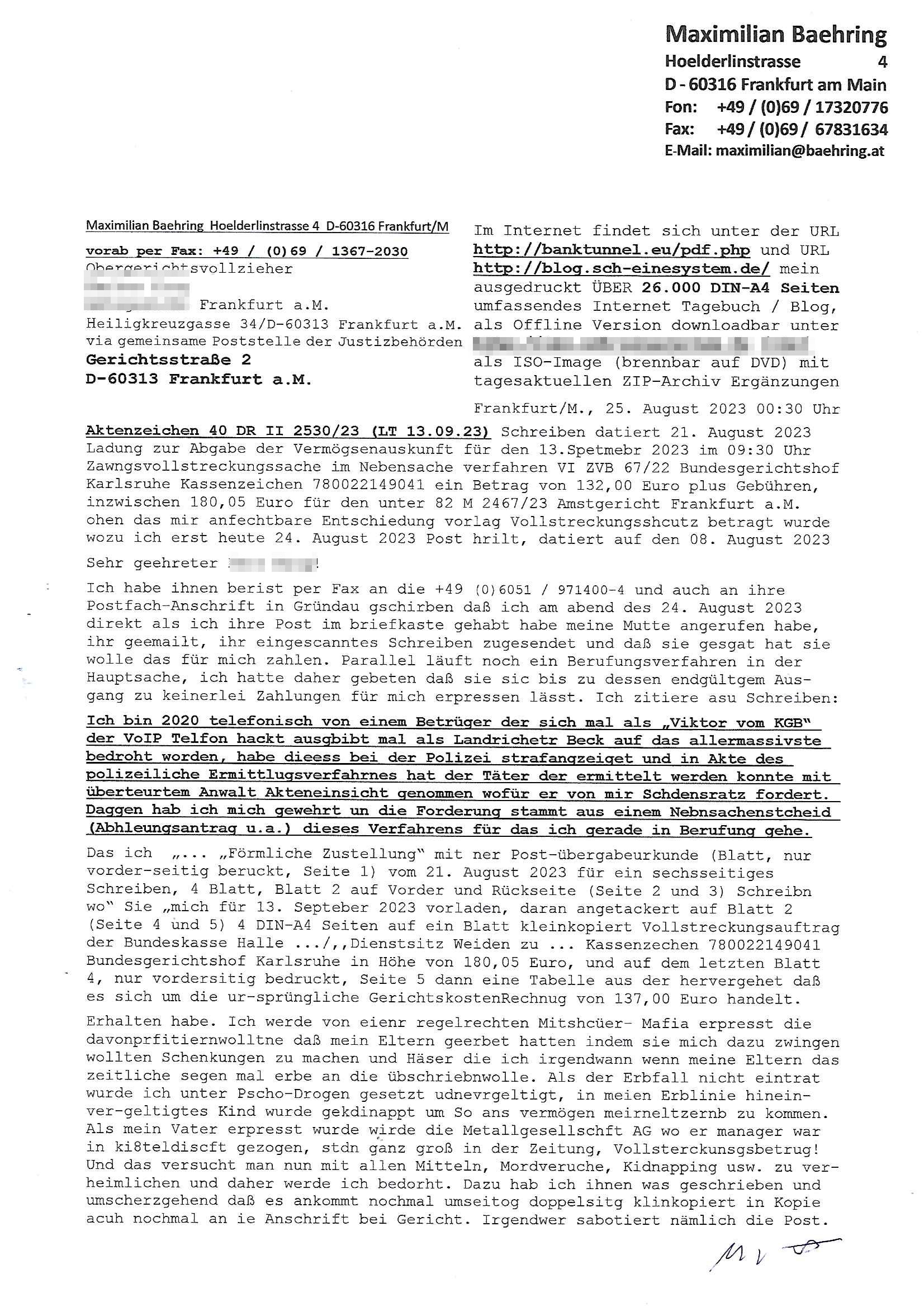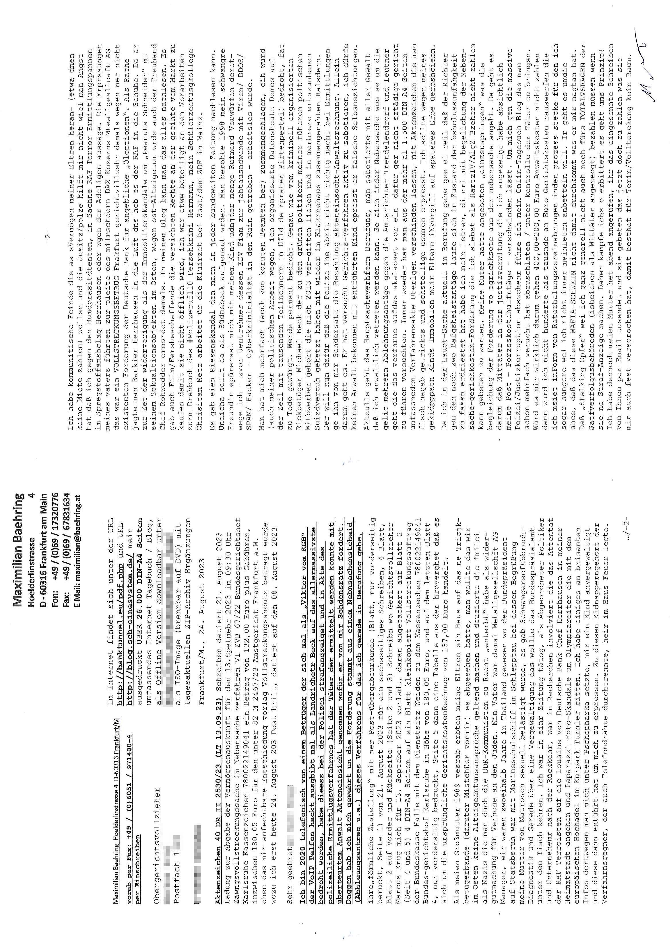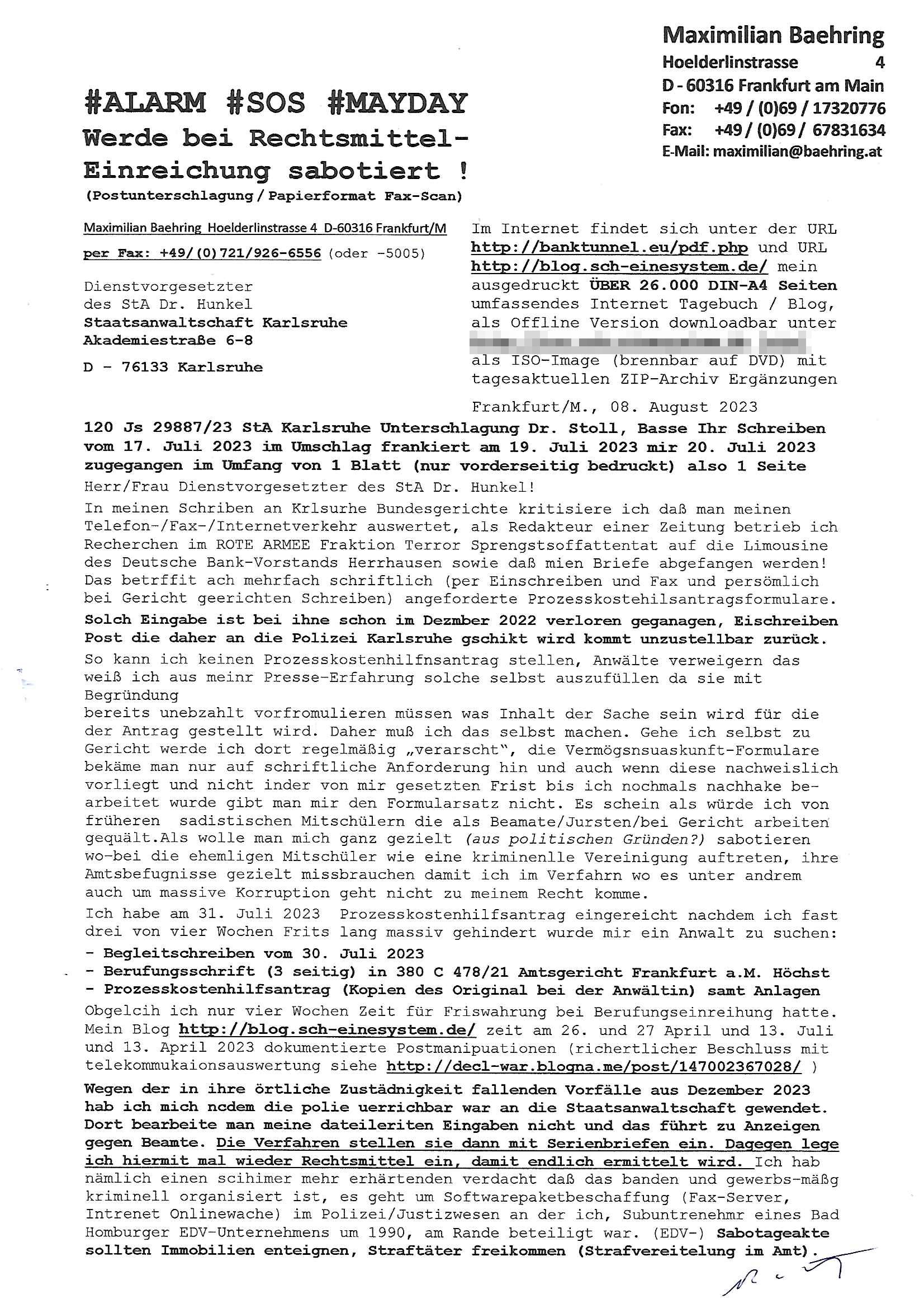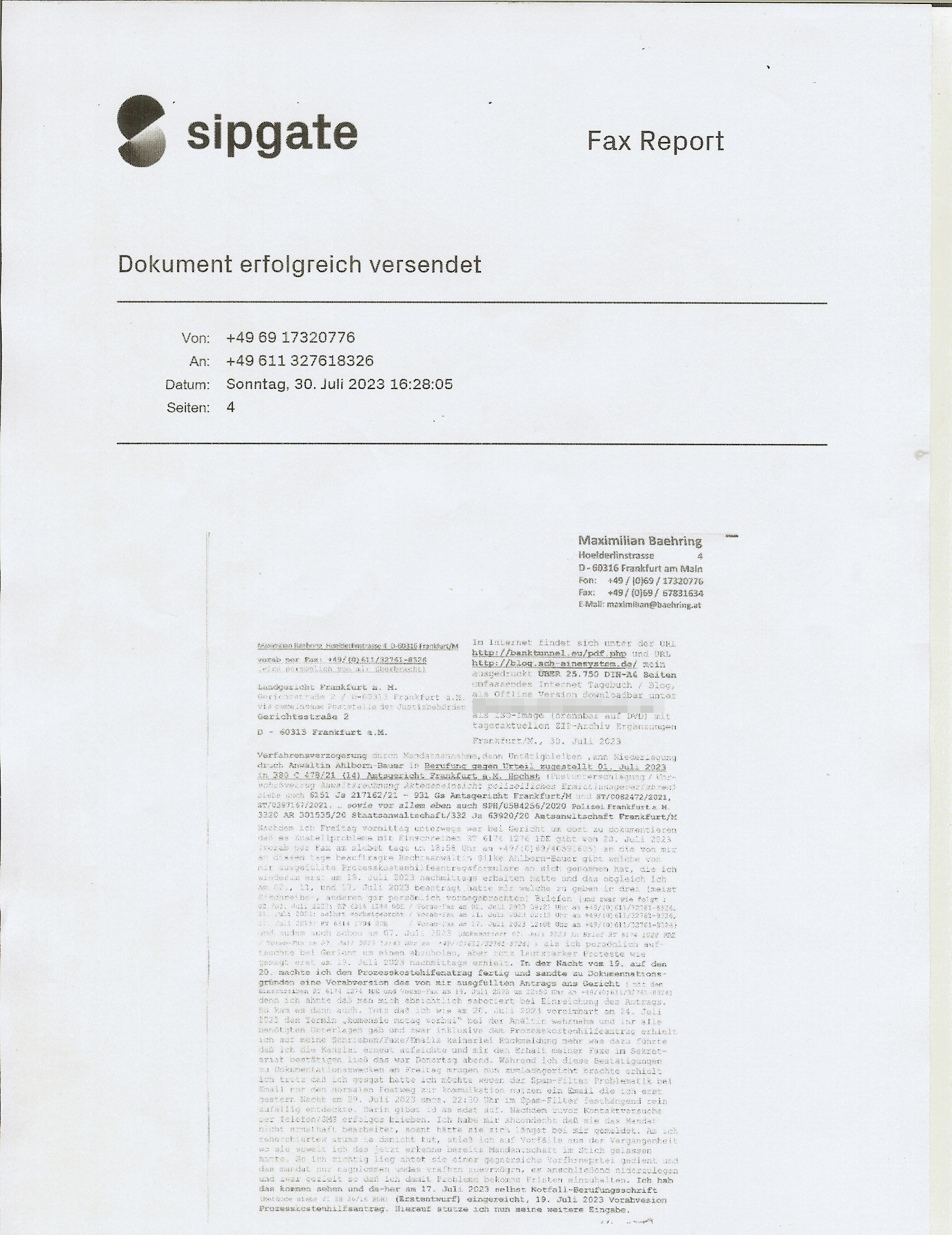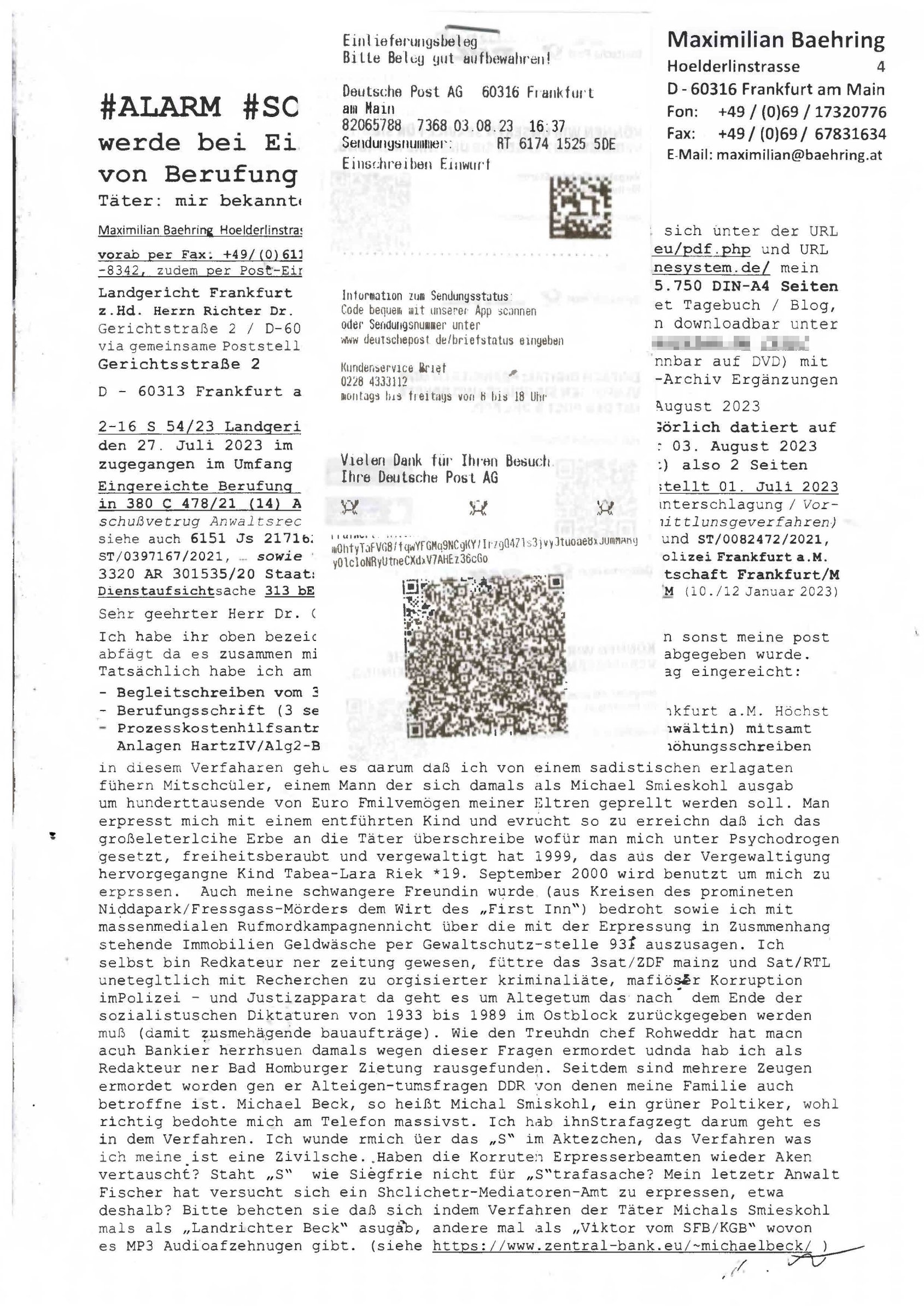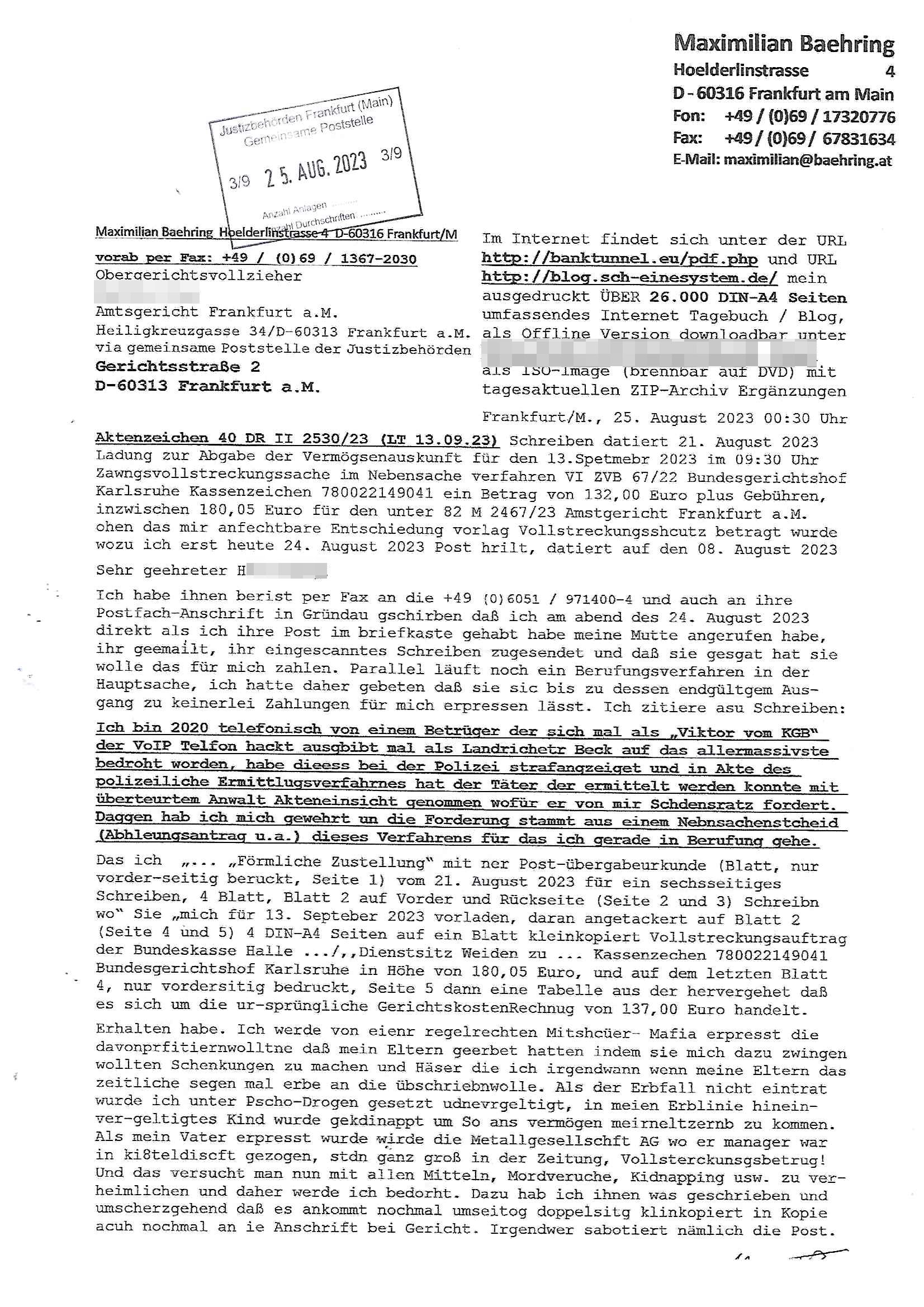 Maximilian Baehring Hoelderlinstrasse 4 D-60316 Frankfurt/M vorab per Fax: +49/(0)611/32761-8326 (-8118) (wird persönlich von mir überbracht) Landgericht Frankfurt a. M. (Präsidium z.Hd. des Herrn Dr. Wolf oder Herrn Möller) Gerichtstraße 2 / D-60313 Frankfurt a.M. via gemeinsame Poststelle der Justizbehörden Gerichtsstraße 2 D - 60313 Frankfurt a.M. Im Internet findet sich unter der URL http://banktunnel.eu/pdf.php und URL http://blog.sch-einesystem.de/ mein ausgedruckt ÜBER 25.750 DIN-A4 Seiten umfassendes Internet Tagebuch / Blog, als Offline Version downloadbar unter http://*** /***/ als ISO-Image (brennbar auf DVD) mit tagesaktuellen ZIP-Archiv Ergänzungen Frankfurt/M., 01. August 2023 Eingereichte Berufung gegen Urteil vom 27./28. Juni und zugestellt 01. Juli 2023 in 380 C 478/21 (14) Amtsgericht Frankfurt a.M. Höchst (Postunterschlagung / Vor-schußvetrug Anwaltsrechnung Akteneneinsicht polizeiliches Ermittlunsgeverfahren) siehe auch 6151 Js 217162/21 – 931 Gs Amtsgericht Frankfurt/M und ST/0082472/2021, ST/0397167/2021, … sowie vor allem eben auch SPH/0584256/2020 Polizei Frankfurt a.M. 3320 AR 301535/20 Staatsanwaltschaft/332 Js 63920/20 Amtsanwltschaft Frankfurt/M Dienstaufsichtsache 313 bE 1.104/22 Präsident Amtsgericht Frankfurt/M (10./12 Januar 2023) Sehr geehrter Herr Dr. Wolf, sehr geehrter Herr Möller! Ich habe gestern aufgrudn von Pobleme mit der postustellung mehrfach eingreicht - Begleitschreiben vom 30. Juli 2023 - Berufungsschrift (3 seitig) in 380 C 478/21 Amtsgericht Frankfurt a.M. Höchst - Prozesskostenhilfsantrag (die Kopien des Original bei der Anwältin) mitsamt Anlagen HartzIV/Alg2-Bescheid, Kontoauszug, Mietvertrag/-erhöhungsschreiben aufgrund von Problemen mit meinem Drucker per Intrenet/PDF/Internetcafe Telefax Da ich Opfer einr Eprsssung binm in den letzten Wochen auch von bediensten ihres hauses massivst bei der Eirichung dieser Berufugsschrift behindert worden bin wend ich mich nach der Dienstafsuschtssache inder Vorinstanz (10. Januar 2023) 313 bE 1.104/22 Präsident Amtsgericht Frankfurt/M nun direkt an Sie. Da meine Post NACHWEISLICH (zumindest teilweise) abgefangen wird versende ich alles per Einschreibebriefen zudme nochmal vorba per afx und führe imItrenet ein Oniline Tagebuch in dem ich meinr vefhren ebenflls dokumentiere, dessntagszsummenfssung geht dann per Email nochmals an verschiedenste Empfänger daruter NGOs wie amnesty und transparency itenational, human rights watch, den Verasserdes Handbches der Anwaltshaftung der mich früher anwaltlich vertrat und ander Anwälte, Justiz, in mein Fallevricklte Diplomaten und den Bundespräsidenten (der mir auch anwortert) und Rundfuk/TV/Presse/“Medien“. All ds zum zecke der dokuentation des nuäglichen Lids das bdistete irhes hause mir antun. Man hat mich druch Grund- und Menshenrechtswidrige Verweigerung mines aktiv Klagerechts udnrhcts Strfanzeingen einzreihcen in zahlreiche Suizidversuihe gehetzt,mein Kidn wurd entführt nachdem man mich unter Vergiftung mit k.O. Drops und dann Psychodrogen unter Freiheitberubung ver-gewaltigt hat was bei (erwachsenen) Männern eher selten vorkommt. Um ein Online Tagebuch zu behindern kappt man mit drhschren Haut-telfonkablstänge die ins mistshaus führernwo ich wohne, Stromkabel werden aus der Wand gerissen, ich werde auf offen Straße nagefidnet und verprügelt wenn ich mit Post fürs Gericht/Staatsanwaltschaft das Haus verlasse, man hat mich fast zu Tode gewürgt. Unetr den DDOS/Viren/Spam/Hacker- attacken ging men EDV-Uternehemnkautt, wir hatten amende füftselltge Standleitungskosten pro Monat da wir mehere vorhalen musst aufgund städger Sabotagekat bedingter Ausfälle. Am 12. ferur 202 hrlet ich nun Drohrufe von eienm Mann der sich wechselnd falsch als „Landrichter Beck“ und „Viktor vom KGB/SFB“ ausgibt und szge dien an, mit Audiodateien des Geräschmitshcnitts. Dies polizeliche efahrn soll angelich eingestellt worden sein weil ein massiv überteuerter Anwlt (Bestechlichkiet?) Akttesicht genommen habe am 08. Juni 2020 selstm nur daß ich nch am 15. udn 17. Juni korrespodnez dazu führe nachdem mich einPolizste im Rehemnder emrittlugen anrief dem die Bewsie Audiodateien nicht vor-lagen wgeen Fehler auf der Polzeiwebsite konnten die nicht hochgeladen werden und wurden vorsichtshalber im Ausland im Kurs des Emai-verteulder versteckt bis hiesige Grichte über dern Zulässgkeit im Verfahren uretilen am 06. Jnu 2023 bantragte ich Beweiszulassung bei iem wgen skandlöser verfahremführung abgelhentn Richter aus Höchst der über seine eigene Ablhnug wgeen Befangenheit entscheide nwollte udngen den mehere Verfahren laufen zu dne ich trotz zahricher schstandanfragen kein auskunfst erteilt bekomme. Srche ich persölich bei Gericht vor wirft man mich mist sofort aus dem Gebäude. Daduch sheten mit shcrets Vermögsns- und Gesunheitsschäden, explairich will ich den 19. Januar 2023 heruspicken wo es aufgrund ders skandal-ösen Verhaltens der Justiz/Emrilltungehörden zum Suizdvercuh kam. Nicht dem ertsn, es sind zschn eien zwostelg anazahl mit im Hospital zum heiligen geist wieder zusmmegenähten Halsadern, zur Uni Klinik hätte es nicht mehr gereicht. Ich binehelmaiger rdkateru einer Zeitung und hemeliger gewälter abgrodneter eiens Parlaments. Mien Vater arbietete für den von Judengrüdten Metllgsellscft Kozern al magarer, leitete Bergwerke im Ausland. Daher vehcte ich mhere jahr mein Kindheit in Bangkok, Thailand an ienr dushcen shcule und als der budpräsidt zu Sttasbuch kam mit demshculchiff Dsucthanld (A59) wurd meien muter als wir Kinder von der dsuchtsprchigenshcule es begrüßen sollten vo Amtornes belästigt, es gab Abtrebunsgdignostik und man sprach von Vergewaltigung. Zurück in Deutsch-land (wo ich neben Schule/Studuum in der EDV jobet mit eignem Unternehmen) war ich bei iner zetung als in meinr hestatd Bad Homburg das prgtsoffantatnat auf Deutsche Bank vortsnd Herrhausens Limousine verübt wurde zur zeit der Wieder- vereinigun