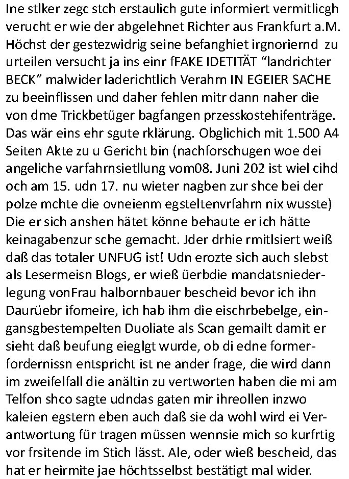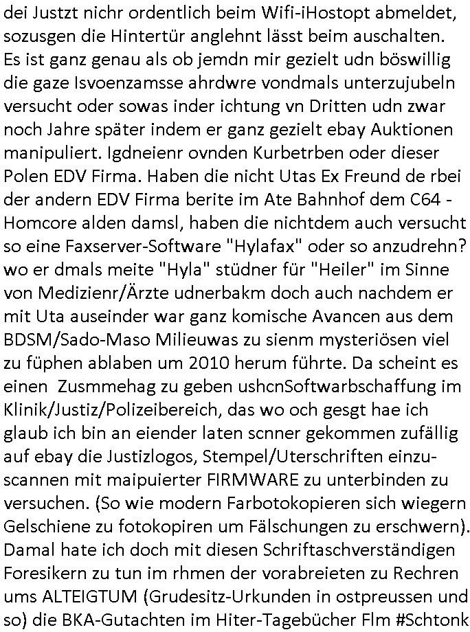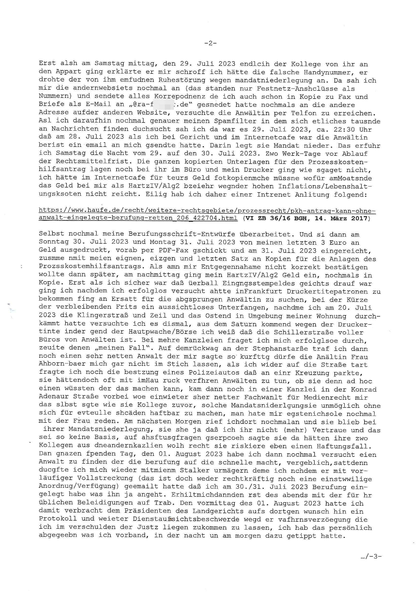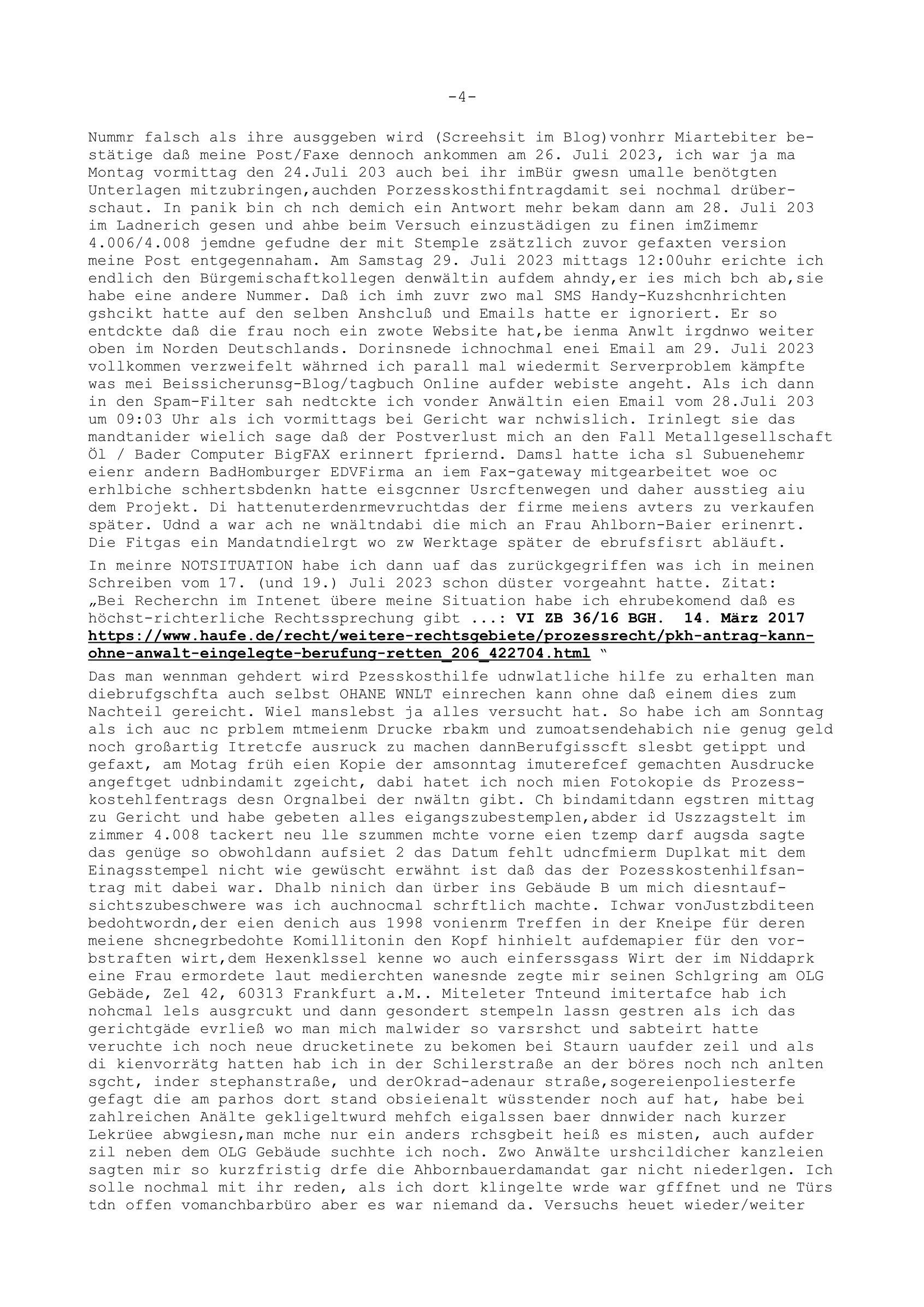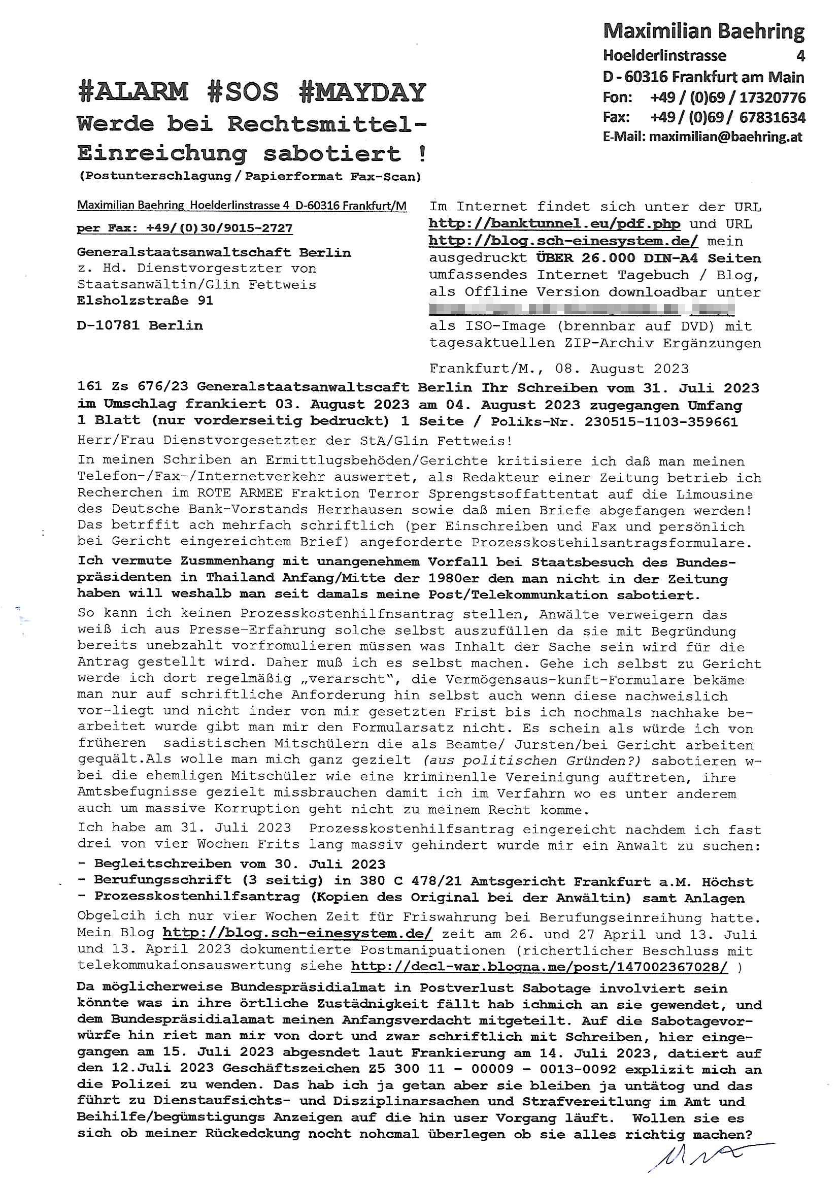 Maximilian Baehring Hoelderlinstrasse 4 D-60316 Frankfurt/M vorab per Fax: +49/(0)611/32761-8326 (-8118) (wird persönlich von mir überbracht) Landgericht Frankfurt a. M. (Präsidium z.Hd. des Herrn Dr. Wolf oder Herrn Möller) Gerichtstraße 2 / D-60313 Frankfurt a.M. via gemeinsame Poststelle der Justizbehörden Gerichtsstraße 2 D - 60313 Frankfurt a.M. Im Internet findet sich unter der URL http://banktunnel.eu/pdf.php und URL http://blog.sch-einesystem.de/ mein ausgedruckt ÜBER 25.750 DIN-A4 Seiten umfassendes Internet Tagebuch / Blog, als Offline Version downloadbar unter http://*** /***/ als ISO-Image (brennbar auf DVD) mit tagesaktuellen ZIP-Archiv Ergänzungen Frankfurt/M., 01. August 2023 Eingereichte Berufung gegen Urteil vom 27./28. Juni und zugestellt 01. Juli 2023 in 380 C 478/21 (14) Amtsgericht Frankfurt a.M. Höchst (Postunterschlagung / Vor-schußvetrug Anwaltsrechnung Akteneneinsicht polizeiliches Ermittlunsgeverfahren) siehe auch 6151 Js 217162/21 – 931 Gs Amtsgericht Frankfurt/M und ST/0082472/2021, ST/0397167/2021, … sowie vor allem eben auch SPH/0584256/2020 Polizei Frankfurt a.M. 3320 AR 301535/20 Staatsanwaltschaft/332 Js 63920/20 Amtsanwltschaft Frankfurt/M Dienstaufsichtsache 313 bE 1.104/22 Präsident Amtsgericht Frankfurt/M (10./12 Januar 2023) Sehr geehrter Herr Dr. Wolf, sehr geehrter Herr Möller! Ich habe gestern aufgrudn von Pobleme mit der postustellung mehrfach eingreicht - Begleitschreiben vom 30. Juli 2023 - Berufungsschrift (3 seitig) in 380 C 478/21 Amtsgericht Frankfurt a.M. Höchst - Prozesskostenhilfsantrag (die Kopien des Original bei der Anwältin) mitsamt Anlagen HartzIV/Alg2-Bescheid, Kontoauszug, Mietvertrag/-erhöhungsschreiben aufgrund von Problemen mit meinem Drucker per Intrenet/PDF/Internetcafe Telefax Da ich Opfer einr Eprsssung binm in den letzten Wochen auch von bediensten ihres hauses massivst bei der Eirichung dieser Berufugsschrift behindert worden bin wend ich mich nach der Dienstafsuschtssache inder Vorinstanz (10. Januar 2023) 313 bE 1.104/22 Präsident Amtsgericht Frankfurt/M nun direkt an Sie. Da meine Post NACHWEISLICH (zumindest teilweise) abgefangen wird versende ich alles per Einschreibebriefen zudme nochmal vorba per afx und führe imItrenet ein Oniline Tagebuch in dem ich meinr vefhren ebenflls dokumentiere, dessntagszsummenfssung geht dann per Email nochmals an verschiedenste Empfänger daruter NGOs wie amnesty und transparency itenational, human rights watch, den Verasserdes Handbches der Anwaltshaftung der mich früher anwaltlich vertrat und ander Anwälte, Justiz, in mein Fallevricklte Diplomaten und den Bundespräsidenten (der mir auch anwortert) und Rundfuk/TV/Presse/“Medien“. All ds zum zecke der dokuentation des nuäglichen Lids das bdistete irhes hause mir antun. Man hat mich druch Grund- und Menshenrechtswidrige Verweigerung mines aktiv Klagerechts udnrhcts Strfanzeingen einzreihcen in zahlreiche Suizidversuihe gehetzt,mein Kidn wurd entführt nachdem man mich unter Vergiftung mit k.O. Drops und dann Psychodrogen unter Freiheitberubung ver-gewaltigt hat was bei (erwachsenen) Männern eher selten vorkommt. Um ein Online Tagebuch zu behindern kappt man mit drhschren Haut-telfonkablstänge die ins mistshaus führernwo ich wohne, Stromkabel werden aus der Wand gerissen, ich werde auf offen Straße nagefidnet und verprügelt wenn ich mit Post fürs Gericht/Staatsanwaltschaft das Haus verlasse, man hat mich fast zu Tode gewürgt. Unetr den DDOS/Viren/Spam/Hacker- attacken ging men EDV-Uternehemnkautt, wir hatten amende füftselltge Standleitungskosten pro Monat da wir mehere vorhalen musst aufgund städger Sabotagekat bedingter Ausfälle. Am 12. ferur 202 hrlet ich nun Drohrufe von eienm Mann der sich wechselnd falsch als „Landrichter Beck“ und „Viktor vom KGB/SFB“ ausgibt und szge dien an, mit Audiodateien des Geräschmitshcnitts. Dies polizeliche efahrn soll angelich eingestellt worden sein weil ein massiv überteuerter Anwlt (Bestechlichkiet?) Akttesicht genommen habe am 08. Juni 2020 selstm nur daß ich nch am 15. udn 17. Juni korrespodnez dazu führe nachdem mich einPolizste im Rehemnder emrittlugen anrief dem die Bewsie Audiodateien nicht vor-lagen wgeen Fehler auf der Polzeiwebsite konnten die nicht hochgeladen werden und wurden vorsichtshalber im Ausland im Kurs des Emai-verteulder versteckt bis hiesige Grichte über dern Zulässgkeit im Verfahren uretilen am 06. Jnu 2023 bantragte ich Beweiszulassung bei iem wgen skandlöser verfahremführung abgelhentn Richter aus Höchst der über seine eigene Ablhnug wgeen Befangenheit entscheide nwollte udngen den mehere Verfahren laufen zu dne ich trotz zahricher schstandanfragen kein auskunfst erteilt bekomme. Srche ich persölich bei Gericht vor wirft man mich mist sofort aus dem Gebäude. Daduch sheten mit shcrets Vermögsns- und Gesunheitsschäden, explairich will ich den 19. Januar 2023 heruspicken wo es aufgrund ders skandal-ösen Verhaltens der Justiz/Emrilltungehörden zum Suizdvercuh kam. Nicht dem ertsn, es sind zschn eien zwostelg anazahl mit im Hospital zum heiligen geist wieder zusmmegenähten Halsadern, zur Uni Klinik hätte es nicht mehr gereicht. Ich binehelmaiger rdkateru einer Zeitung und hemeliger gewälter abgrodneter eiens Parlaments. Mien Vater arbietete für den von Judengrüdten Metllgsellscft Kozern al magarer, leitete Bergwerke im Ausland. Daher vehcte ich mhere jahr mein Kindheit in Bangkok, Thailand an ienr dushcen shcule und als der budpräsidt zu Sttasbuch kam mit demshculchiff Dsucthanld (A59) wurd meien muter als wir Kinder von der dsuchtsprchigenshcule es begrüßen sollten vo Amtornes belästigt, es gab Abtrebunsgdignostik und man sprach von Vergewaltigung. Zurück in Deutsch-land (wo ich neben Schule/Studuum in der EDV jobet mit eignem Unternehmen) war ich bei iner zetung als in meinr hestatd Bad Homburg das prgtsoffantatnat auf Deutsche Bank vortsnd Herrhausens Limousine verübt wurde zur zeit der Wieder- vereinigun