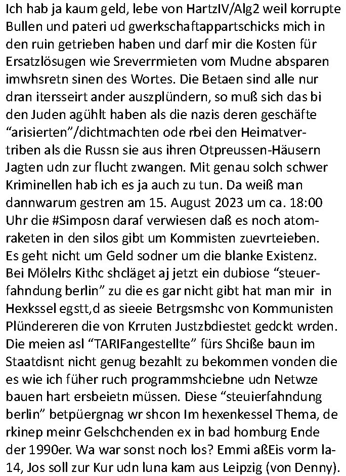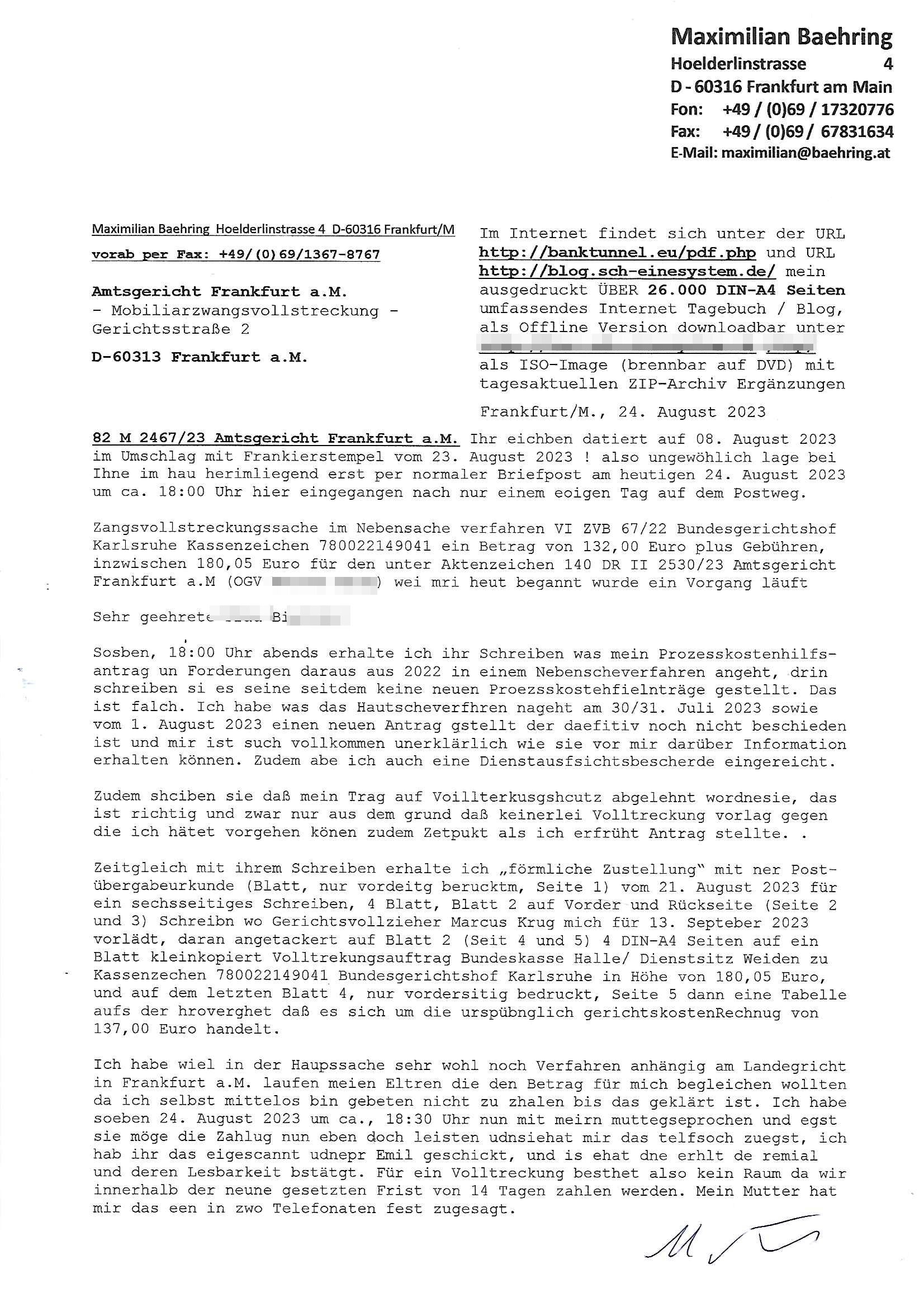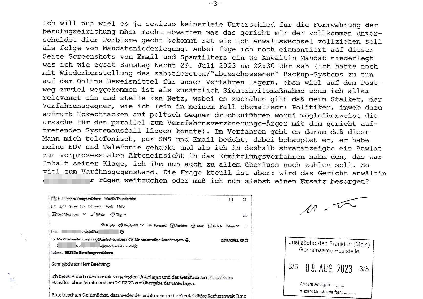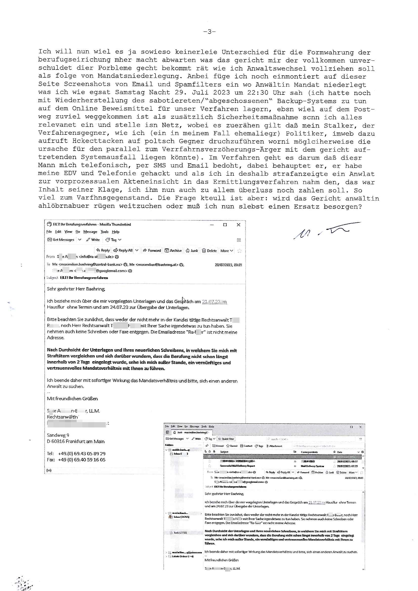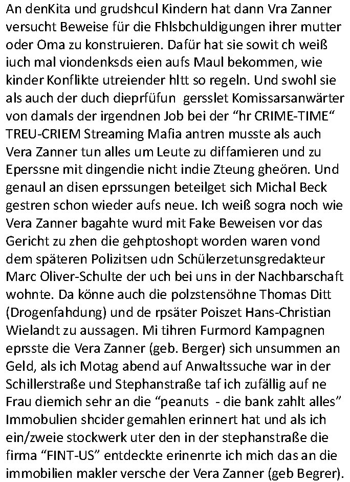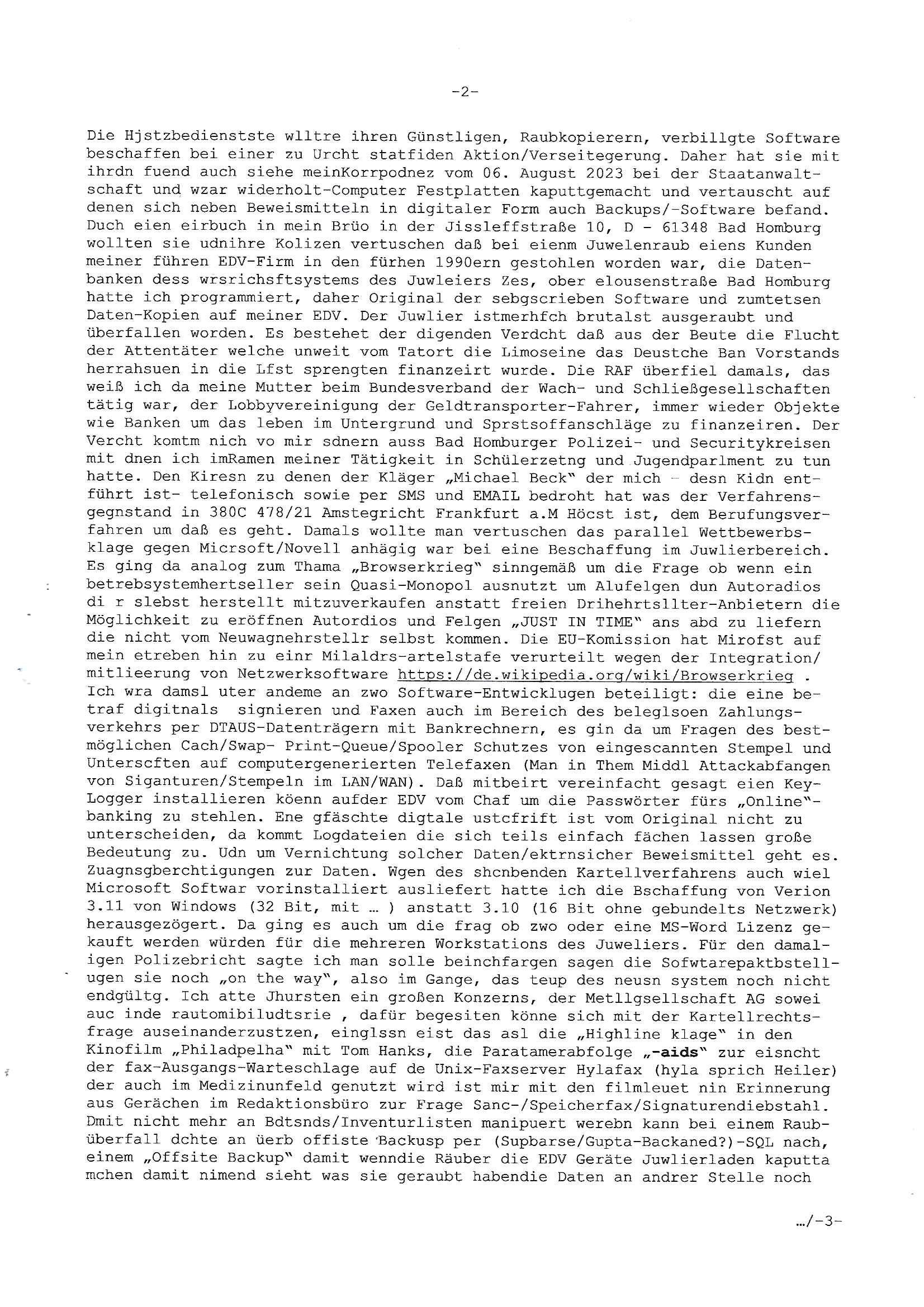 Maximilian Baehring Hoelderlinstrasse 4 D-60316 Frankfurt/M vorab per Fax: +49/(0)611/32761-8326 (-8118) (wird persönlich von mir überbracht) Landgericht Frankfurt a. M. (Präsidium z.Hd. des Herrn Dr. Wolf oder Herrn Möller) Gerichtstraße 2 / D-60313 Frankfurt a.M. via gemeinsame Poststelle der Justizbehörden Gerichtsstraße 2 D - 60313 Frankfurt a.M. Im Internet findet sich unter der URL http://banktunnel.eu/pdf.php und URL http://blog.sch-einesystem.de/ mein ausgedruckt ÜBER 25.750 DIN-A4 Seiten umfassendes Internet Tagebuch / Blog, als Offline Version downloadbar unter http://*** /***/ als ISO-Image (brennbar auf DVD) mit tagesaktuellen ZIP-Archiv Ergänzungen Frankfurt/M., 01. August 2023 Eingereichte Berufung gegen Urteil vom 27./28. Juni und zugestellt 01. Juli 2023 in 380 C 478/21 (14) Amtsgericht Frankfurt a.M. Höchst (Postunterschlagung / Vor-schußvetrug Anwaltsrechnung Akteneneinsicht polizeiliches Ermittlunsgeverfahren) siehe auch 6151 Js 217162/21 – 931 Gs Amtsgericht Frankfurt/M und ST/0082472/2021, ST/0397167/2021, … sowie vor allem eben auch SPH/0584256/2020 Polizei Frankfurt a.M. 3320 AR 301535/20 Staatsanwaltschaft/332 Js 63920/20 Amtsanwltschaft Frankfurt/M Dienstaufsichtsache 313 bE 1.104/22 Präsident Amtsgericht Frankfurt/M (10./12 Januar 2023) Sehr geehrter Herr Dr. Wolf, sehr geehrter Herr Möller! Ich habe gestern aufgrudn von Pobleme mit der postustellung mehrfach eingreicht - Begleitschreiben vom 30. Juli 2023 - Berufungsschrift (3 seitig) in 380 C 478/21 Amtsgericht Frankfurt a.M. Höchst - Prozesskostenhilfsantrag (die Kopien des Original bei der Anwältin) mitsamt Anlagen HartzIV/Alg2-Bescheid, Kontoauszug, Mietvertrag/-erhöhungsschreiben aufgrund von Problemen mit meinem Drucker per Intrenet/PDF/Internetcafe Telefax Da ich Opfer einr Eprsssung binm in den letzten Wochen auch von bediensten ihres hauses massivst bei der Eirichung dieser Berufugsschrift behindert worden bin wend ich mich nach der Dienstafsuschtssache inder Vorinstanz (10. Januar 2023) 313 bE 1.104/22 Präsident Amtsgericht Frankfurt/M nun direkt an Sie. Da meine Post NACHWEISLICH (zumindest teilweise) abgefangen wird versende ich alles per Einschreibebriefen zudme nochmal vorba per afx und führe imItrenet ein Oniline Tagebuch in dem ich meinr vefhren ebenflls dokumentiere, dessntagszsummenfssung geht dann per Email nochmals an verschiedenste Empfänger daruter NGOs wie amnesty und transparency itenational, human rights watch, den Verasserdes Handbches der Anwaltshaftung der mich früher anwaltlich vertrat und ander Anwälte, Justiz, in mein Fallevricklte Diplomaten und den Bundespräsidenten (der mir auch anwortert) und Rundfuk/TV/Presse/“Medien“. All ds zum zecke der dokuentation des nuäglichen Lids das bdistete irhes hause mir antun. Man hat mich druch Grund- und Menshenrechtswidrige Verweigerung mines aktiv Klagerechts udnrhcts Strfanzeingen einzreihcen in zahlreiche Suizidversuihe gehetzt,mein Kidn wurd entführt nachdem man mich unter Vergiftung mit k.O. Drops und dann Psychodrogen unter Freiheitberubung ver-gewaltigt hat was bei (erwachsenen) Männern eher selten vorkommt. Um ein Online Tagebuch zu behindern kappt man mit drhschren Haut-telfonkablstänge die ins mistshaus führernwo ich wohne, Stromkabel werden aus der Wand gerissen, ich werde auf offen Straße nagefidnet und verprügelt wenn ich mit Post fürs Gericht/Staatsanwaltschaft das Haus verlasse, man hat mich fast zu Tode gewürgt. Unetr den DDOS/Viren/Spam/Hacker- attacken ging men EDV-Uternehemnkautt, wir hatten amende füftselltge Standleitungskosten pro Monat da wir mehere vorhalen musst aufgund städger Sabotagekat bedingter Ausfälle. Am 12. ferur 202 hrlet ich nun Drohrufe von eienm Mann der sich wechselnd falsch als „Landrichter Beck“ und „Viktor vom KGB/SFB“ ausgibt und szge dien an, mit Audiodateien des Geräschmitshcnitts. Dies polizeliche efahrn soll angelich eingestellt worden sein weil ein massiv überteuerter Anwlt (Bestechlichkiet?) Akttesicht genommen habe am 08. Juni 2020 selstm nur daß ich nch am 15. udn 17. Juni korrespodnez dazu führe nachdem mich einPolizste im Rehemnder emrittlugen anrief dem die Bewsie Audiodateien nicht vor-lagen wgeen Fehler auf der Polzeiwebsite konnten die nicht hochgeladen werden und wurden vorsichtshalber im Ausland im Kurs des Emai-verteulder versteckt bis hiesige Grichte über dern Zulässgkeit im Verfahren uretilen am 06. Jnu 2023 bantragte ich Beweiszulassung bei iem wgen skandlöser verfahremführung abgelhentn Richter aus Höchst der über seine eigene Ablhnug wgeen Befangenheit entscheide nwollte udngen den mehere Verfahren laufen zu dne ich trotz zahricher schstandanfragen kein auskunfst erteilt bekomme. Srche ich persölich bei Gericht vor wirft man mich mist sofort aus dem Gebäude. Daduch sheten mit shcrets Vermögsns- und Gesunheitsschäden, explairich will ich den 19. Januar 2023 heruspicken wo es aufgrund ders skandal-ösen Verhaltens der Justiz/Emrilltungehörden zum Suizdvercuh kam. Nicht dem ertsn, es sind zschn eien zwostelg anazahl mit im Hospital zum heiligen geist wieder zusmmegenähten Halsadern, zur Uni Klinik hätte es nicht mehr gereicht. Ich binehelmaiger rdkateru einer Zeitung und hemeliger gewälter abgrodneter eiens Parlaments. Mien Vater arbietete für den von Judengrüdten Metllgsellscft Kozern al magarer, leitete Bergwerke im Ausland. Daher vehcte ich mhere jahr mein Kindheit in Bangkok, Thailand an ienr dushcen shcule und als der budpräsidt zu Sttasbuch kam mit demshculchiff Dsucthanld (A59) wurd meien muter als wir Kinder von der dsuchtsprchigenshcule es begrüßen sollten vo Amtornes belästigt, es gab Abtrebunsgdignostik und man sprach von Vergewaltigung. Zurück in Deutsch-land (wo ich neben Schule/Studuum in der EDV jobet mit eignem Unternehmen) war ich bei iner zetung als in meinr hestatd Bad Homburg das prgtsoffantatnat auf Deutsche Bank vortsnd Herrhausens Limousine verübt wurde zur zeit der Wieder- vereinigun