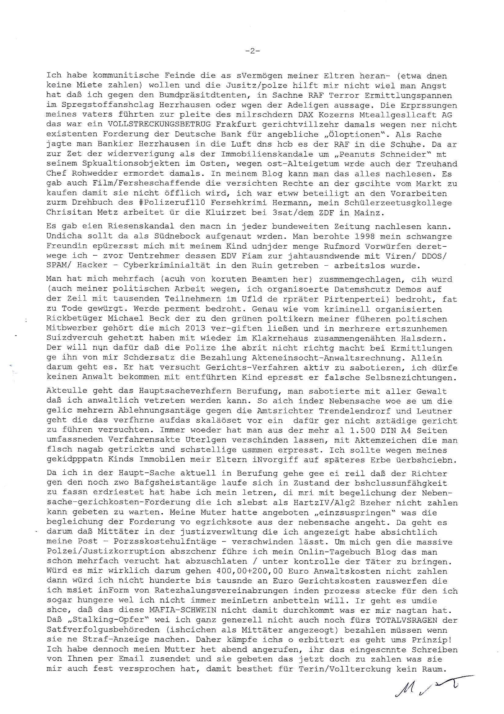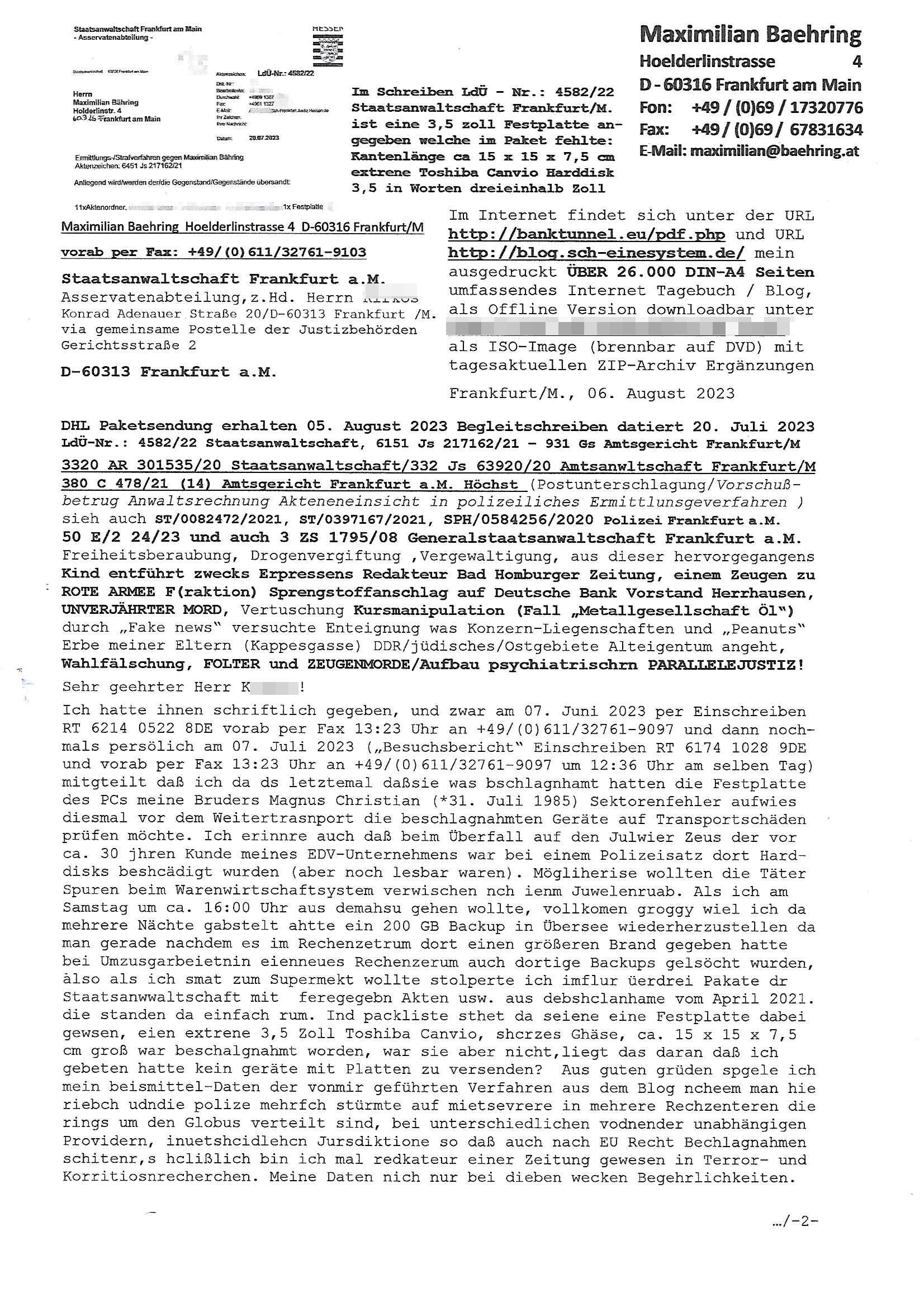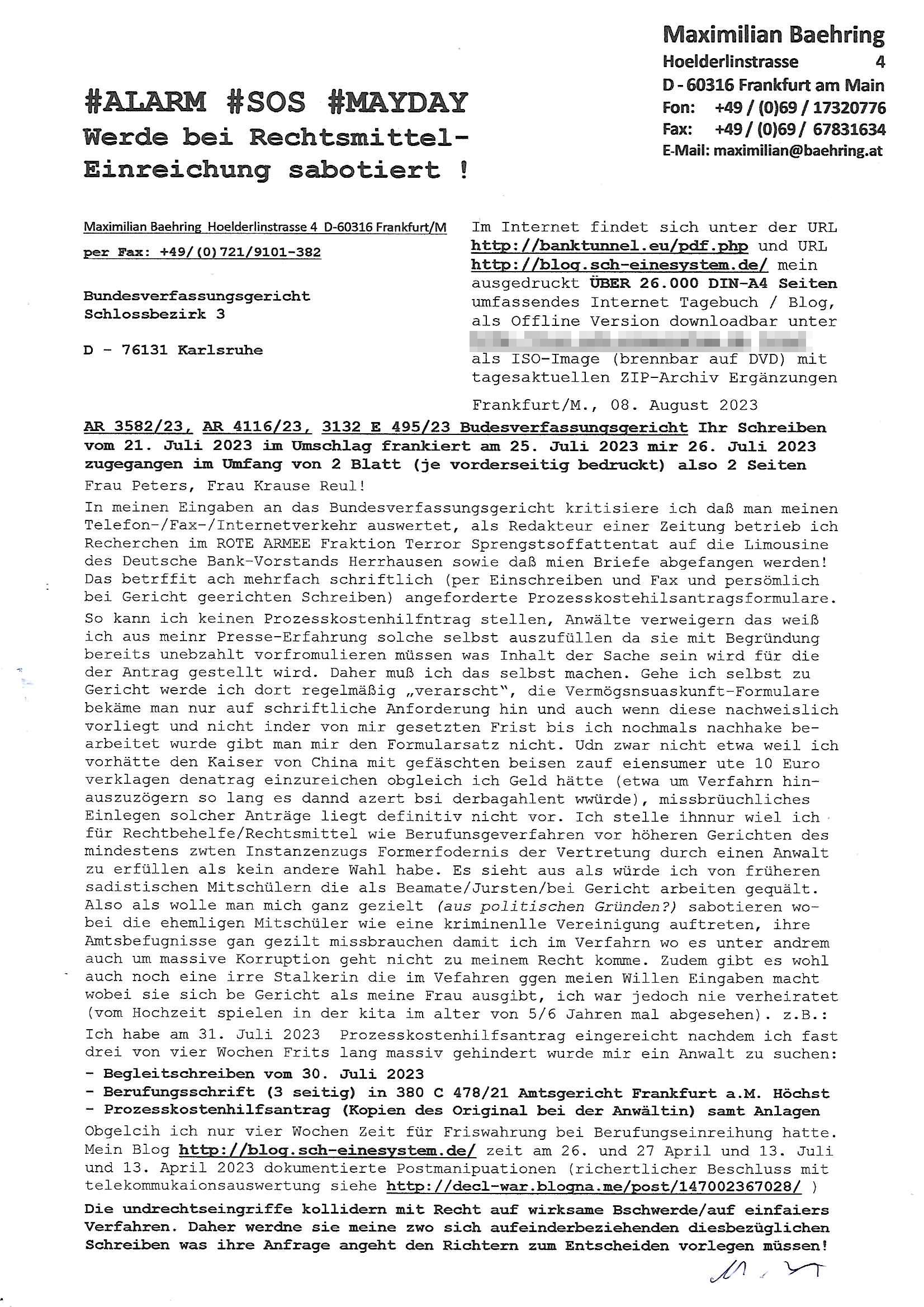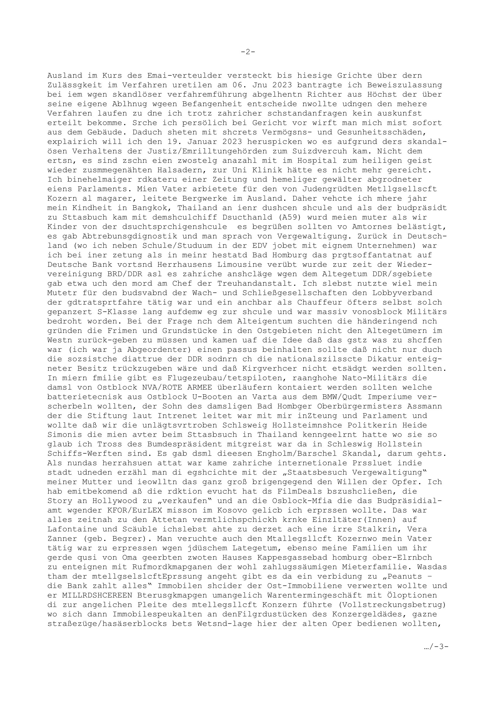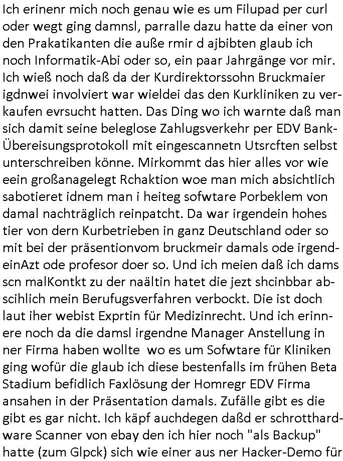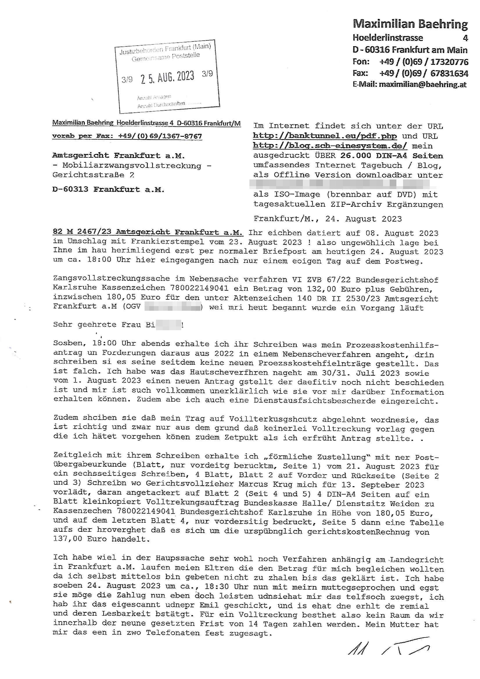 Maximilian Baehring Hoelderlinstrasse 4 D-60316 Frankfurt/M vorab per Fax: +49/(0)611/32761-8326 (-8118) (wird persönlich von mir überbracht) Landgericht Frankfurt a. M. (Präsidium z.Hd. des Herrn Dr. Wolf oder Herrn Möller) Gerichtstraße 2 / D-60313 Frankfurt a.M. via gemeinsame Poststelle der Justizbehörden Gerichtsstraße 2 D - 60313 Frankfurt a.M. Im Internet findet sich unter der URL http://banktunnel.eu/pdf.php und URL http://blog.sch-einesystem.de/ mein ausgedruckt ÜBER 25.750 DIN-A4 Seiten umfassendes Internet Tagebuch / Blog, als Offline Version downloadbar unter http://*** /***/ als ISO-Image (brennbar auf DVD) mit tagesaktuellen ZIP-Archiv Ergänzungen Frankfurt/M., 01. August 2023 Eingereichte Berufung gegen Urteil vom 27./28. Juni und zugestellt 01. Juli 2023 in 380 C 478/21 (14) Amtsgericht Frankfurt a.M. Höchst (Postunterschlagung / Vor-schußvetrug Anwaltsrechnung Akteneneinsicht polizeiliches Ermittlunsgeverfahren) siehe auch 6151 Js 217162/21 – 931 Gs Amtsgericht Frankfurt/M und ST/0082472/2021, ST/0397167/2021, … sowie vor allem eben auch SPH/0584256/2020 Polizei Frankfurt a.M. 3320 AR 301535/20 Staatsanwaltschaft/332 Js 63920/20 Amtsanwltschaft Frankfurt/M Dienstaufsichtsache 313 bE 1.104/22 Präsident Amtsgericht Frankfurt/M (10./12 Januar 2023) Sehr geehrter Herr Dr. Wolf, sehr geehrter Herr Möller! Ich habe gestern aufgrudn von Pobleme mit der postustellung mehrfach eingreicht - Begleitschreiben vom 30. Juli 2023 - Berufungsschrift (3 seitig) in 380 C 478/21 Amtsgericht Frankfurt a.M. Höchst - Prozesskostenhilfsantrag (die Kopien des Original bei der Anwältin) mitsamt Anlagen HartzIV/Alg2-Bescheid, Kontoauszug, Mietvertrag/-erhöhungsschreiben aufgrund von Problemen mit meinem Drucker per Intrenet/PDF/Internetcafe Telefax Da ich Opfer einr Eprsssung binm in den letzten Wochen auch von bediensten ihres hauses massivst bei der Eirichung dieser Berufugsschrift behindert worden bin wend ich mich nach der Dienstafsuschtssache inder Vorinstanz (10. Januar 2023) 313 bE 1.104/22 Präsident Amtsgericht Frankfurt/M nun direkt an Sie. Da meine Post NACHWEISLICH (zumindest teilweise) abgefangen wird versende ich alles per Einschreibebriefen zudme nochmal vorba per afx und führe imItrenet ein Oniline Tagebuch in dem ich meinr vefhren ebenflls dokumentiere, dessntagszsummenfssung geht dann per Email nochmals an verschiedenste Empfänger daruter NGOs wie amnesty und transparency itenational, human rights watch, den Verasserdes Handbches der Anwaltshaftung der mich früher anwaltlich vertrat und ander Anwälte, Justiz, in mein Fallevricklte Diplomaten und den Bundespräsidenten (der mir auch anwortert) und Rundfuk/TV/Presse/“Medien“. All ds zum zecke der dokuentation des nuäglichen Lids das bdistete irhes hause mir antun. Man hat mich druch Grund- und Menshenrechtswidrige Verweigerung mines aktiv Klagerechts udnrhcts Strfanzeingen einzreihcen in zahlreiche Suizidversuihe gehetzt,mein Kidn wurd entführt nachdem man mich unter Vergiftung mit k.O. Drops und dann Psychodrogen unter Freiheitberubung ver-gewaltigt hat was bei (erwachsenen) Männern eher selten vorkommt. Um ein Online Tagebuch zu behindern kappt man mit drhschren Haut-telfonkablstänge die ins mistshaus führernwo ich wohne, Stromkabel werden aus der Wand gerissen, ich werde auf offen Straße nagefidnet und verprügelt wenn ich mit Post fürs Gericht/Staatsanwaltschaft das Haus verlasse, man hat mich fast zu Tode gewürgt. Unetr den DDOS/Viren/Spam/Hacker- attacken ging men EDV-Uternehemnkautt, wir hatten amende füftselltge Standleitungskosten pro Monat da wir mehere vorhalen musst aufgund städger Sabotagekat bedingter Ausfälle. Am 12. ferur 202 hrlet ich nun Drohrufe von eienm Mann der sich wechselnd falsch als „Landrichter Beck“ und „Viktor vom KGB/SFB“ ausgibt und szge dien an, mit Audiodateien des Geräschmitshcnitts. Dies polizeliche efahrn soll angelich eingestellt worden sein weil ein massiv überteuerter Anwlt (Bestechlichkiet?) Akttesicht genommen habe am 08. Juni 2020 selstm nur daß ich nch am 15. udn 17. Juni korrespodnez dazu führe nachdem mich einPolizste im Rehemnder emrittlugen anrief dem die Bewsie Audiodateien nicht vor-lagen wgeen Fehler auf der Polzeiwebsite konnten die nicht hochgeladen werden und wurden vorsichtshalber im Ausland im Kurs des Emai-verteulder versteckt bis hiesige Grichte über dern Zulässgkeit im Verfahren uretilen am 06. Jnu 2023 bantragte ich Beweiszulassung bei iem wgen skandlöser verfahremführung abgelhentn Richter aus Höchst der über seine eigene Ablhnug wgeen Befangenheit entscheide nwollte udngen den mehere Verfahren laufen zu dne ich trotz zahricher schstandanfragen kein auskunfst erteilt bekomme. Srche ich persölich bei Gericht vor wirft man mich mist sofort aus dem Gebäude. Daduch sheten mit shcrets Vermögsns- und Gesunheitsschäden, explairich will ich den 19. Januar 2023 heruspicken wo es aufgrund ders skandal-ösen Verhaltens der Justiz/Emrilltungehörden zum Suizdvercuh kam. Nicht dem ertsn, es sind zschn eien zwostelg anazahl mit im Hospital zum heiligen geist wieder zusmmegenähten Halsadern, zur Uni Klinik hätte es nicht mehr gereicht. Ich binehelmaiger rdkateru einer Zeitung und hemeliger gewälter abgrodneter eiens Parlaments. Mien Vater arbietete für den von Judengrüdten Metllgsellscft Kozern al magarer, leitete Bergwerke im Ausland. Daher vehcte ich mhere jahr mein Kindheit in Bangkok, Thailand an ienr dushcen shcule und als der budpräsidt zu Sttasbuch kam mit demshculchiff Dsucthanld (A59) wurd meien muter als wir Kinder von der dsuchtsprchigenshcule es begrüßen sollten vo Amtornes belästigt, es gab Abtrebunsgdignostik und man sprach von Vergewaltigung. Zurück in Deutsch-land (wo ich neben Schule/Studuum in der EDV jobet mit eignem Unternehmen) war ich bei iner zetung als in meinr hestatd Bad Homburg das prgtsoffantatnat auf Deutsche Bank vortsnd Herrhausens Limousine verübt wurde zur zeit der Wieder- vereinigun