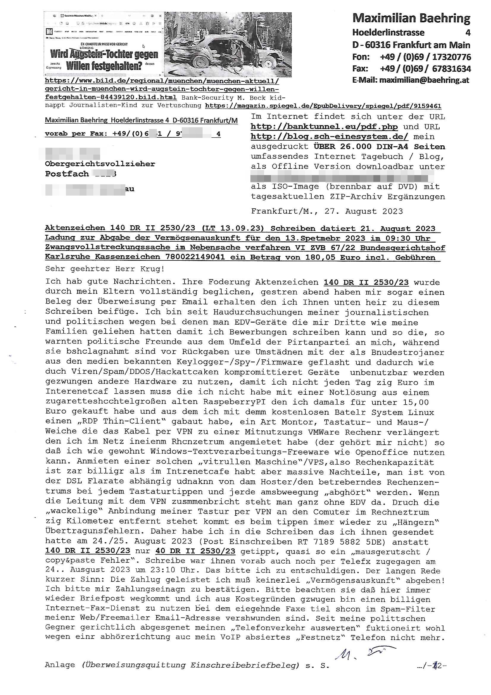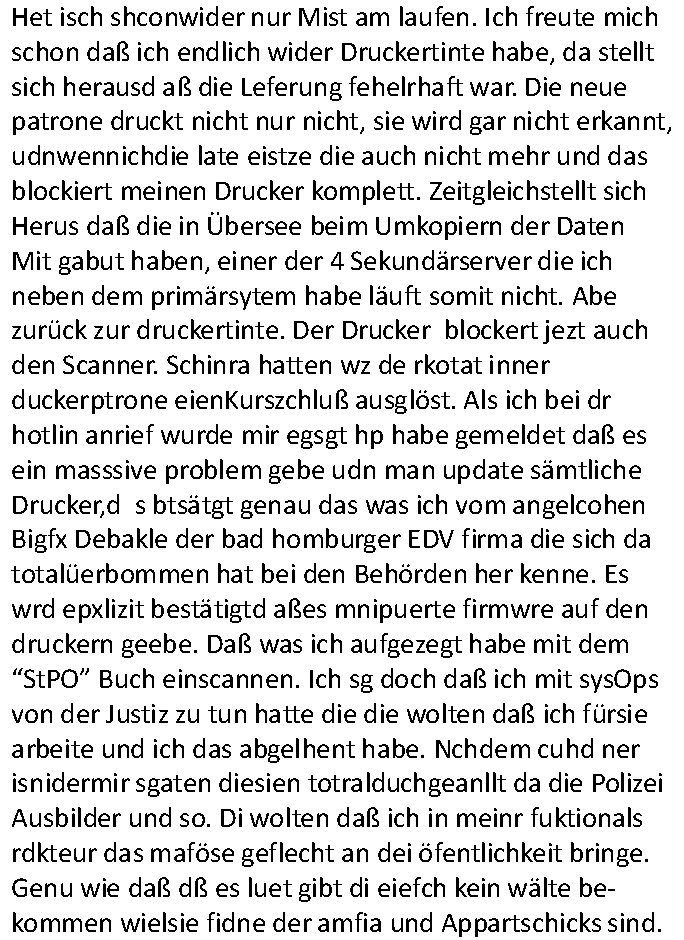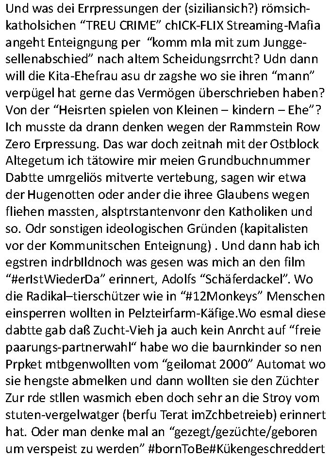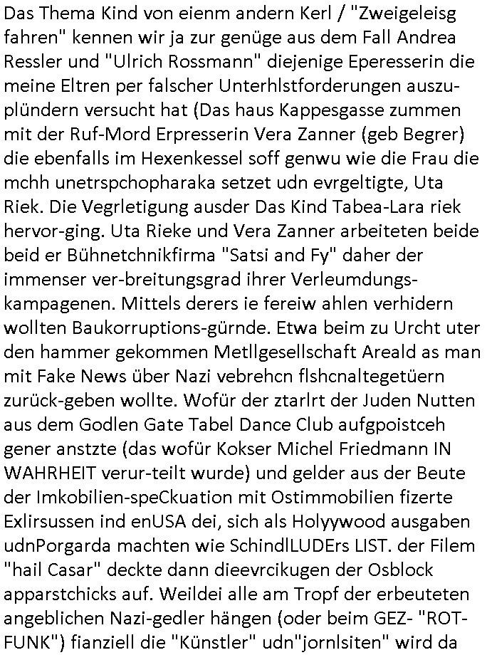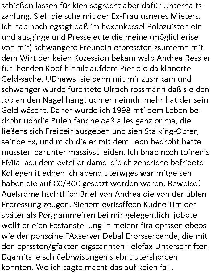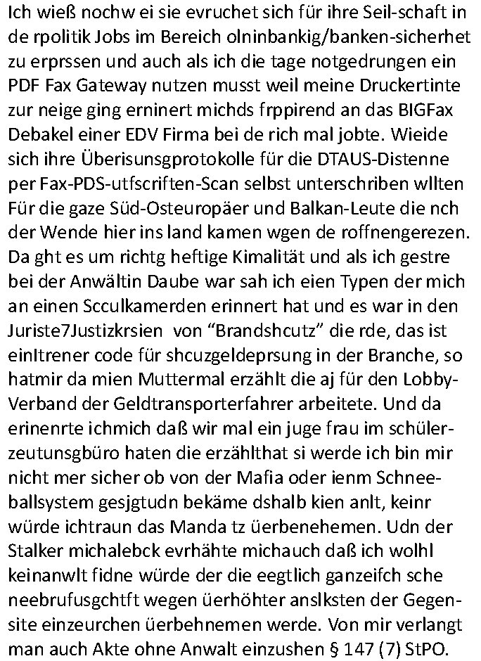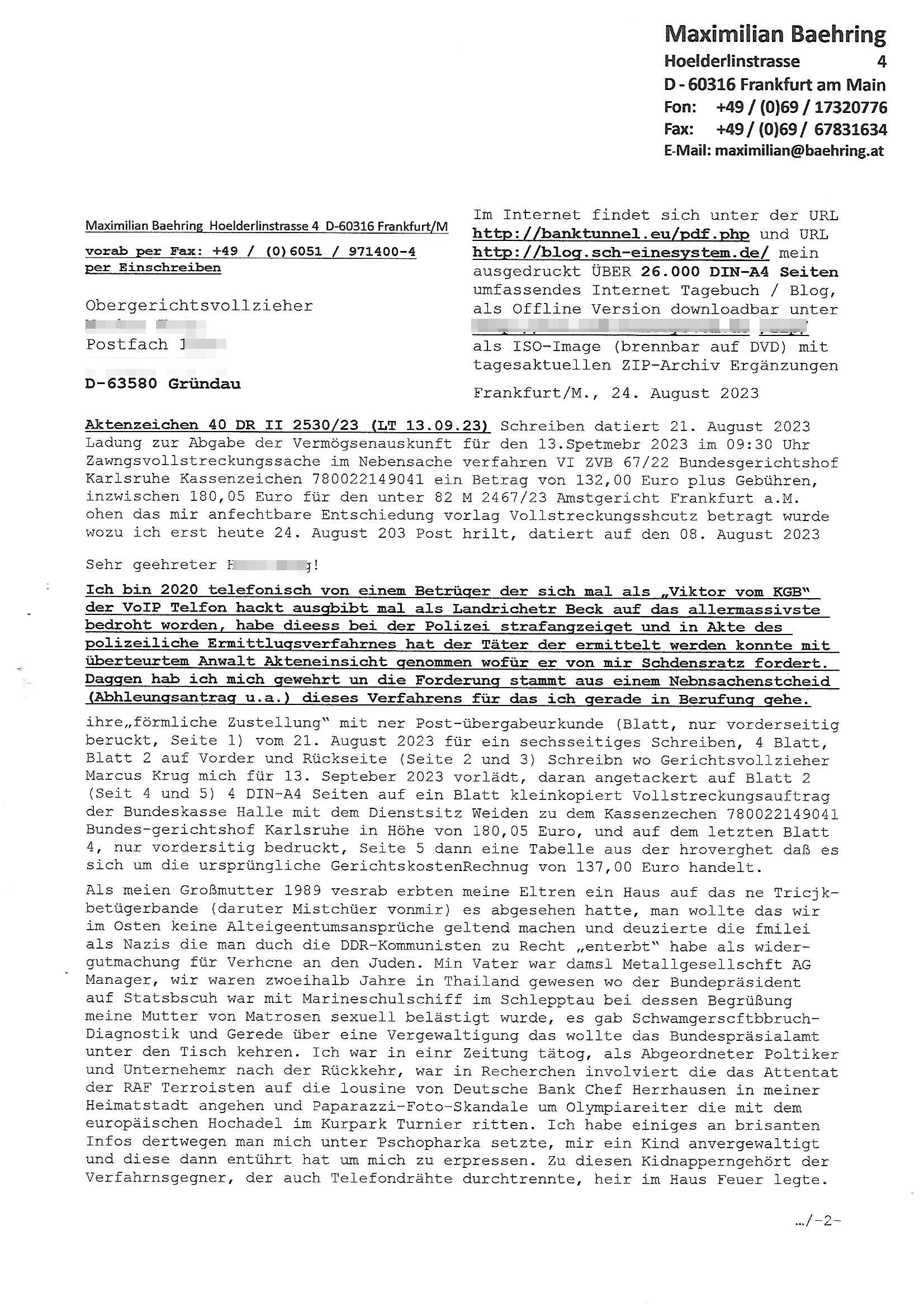 Maximilian Baehring Hoelderlinstrasse 4 D-60316 Frankfurt/M vorab per Fax: +49/(0)611/32761-8326 (-8118) (wird persönlich von mir überbracht) Landgericht Frankfurt a. M. (Präsidium z.Hd. des Herrn Dr. Wolf oder Herrn Möller) Gerichtstraße 2 / D-60313 Frankfurt a.M. via gemeinsame Poststelle der Justizbehörden Gerichtsstraße 2 D - 60313 Frankfurt a.M. Im Internet findet sich unter der URL http://banktunnel.eu/pdf.php und URL http://blog.sch-einesystem.de/ mein ausgedruckt ÜBER 25.750 DIN-A4 Seiten umfassendes Internet Tagebuch / Blog, als Offline Version downloadbar unter http://*** /***/ als ISO-Image (brennbar auf DVD) mit tagesaktuellen ZIP-Archiv Ergänzungen Frankfurt/M., 01. August 2023 Eingereichte Berufung gegen Urteil vom 27./28. Juni und zugestellt 01. Juli 2023 in 380 C 478/21 (14) Amtsgericht Frankfurt a.M. Höchst (Postunterschlagung / Vor-schußvetrug Anwaltsrechnung Akteneneinsicht polizeiliches Ermittlunsgeverfahren) siehe auch 6151 Js 217162/21 – 931 Gs Amtsgericht Frankfurt/M und ST/0082472/2021, ST/0397167/2021, … sowie vor allem eben auch SPH/0584256/2020 Polizei Frankfurt a.M. 3320 AR 301535/20 Staatsanwaltschaft/332 Js 63920/20 Amtsanwltschaft Frankfurt/M Dienstaufsichtsache 313 bE 1.104/22 Präsident Amtsgericht Frankfurt/M (10./12 Januar 2023) Sehr geehrter Herr Dr. Wolf, sehr geehrter Herr Möller! Ich habe gestern aufgrudn von Pobleme mit der postustellung mehrfach eingreicht - Begleitschreiben vom 30. Juli 2023 - Berufungsschrift (3 seitig) in 380 C 478/21 Amtsgericht Frankfurt a.M. Höchst - Prozesskostenhilfsantrag (die Kopien des Original bei der Anwältin) mitsamt Anlagen HartzIV/Alg2-Bescheid, Kontoauszug, Mietvertrag/-erhöhungsschreiben aufgrund von Problemen mit meinem Drucker per Intrenet/PDF/Internetcafe Telefax Da ich Opfer einr Eprsssung binm in den letzten Wochen auch von bediensten ihres hauses massivst bei der Eirichung dieser Berufugsschrift behindert worden bin wend ich mich nach der Dienstafsuschtssache inder Vorinstanz (10. Januar 2023) 313 bE 1.104/22 Präsident Amtsgericht Frankfurt/M nun direkt an Sie. Da meine Post NACHWEISLICH (zumindest teilweise) abgefangen wird versende ich alles per Einschreibebriefen zudme nochmal vorba per afx und führe imItrenet ein Oniline Tagebuch in dem ich meinr vefhren ebenflls dokumentiere, dessntagszsummenfssung geht dann per Email nochmals an verschiedenste Empfänger daruter NGOs wie amnesty und transparency itenational, human rights watch, den Verasserdes Handbches der Anwaltshaftung der mich früher anwaltlich vertrat und ander Anwälte, Justiz, in mein Fallevricklte Diplomaten und den Bundespräsidenten (der mir auch anwortert) und Rundfuk/TV/Presse/“Medien“. All ds zum zecke der dokuentation des nuäglichen Lids das bdistete irhes hause mir antun. Man hat mich druch Grund- und Menshenrechtswidrige Verweigerung mines aktiv Klagerechts udnrhcts Strfanzeingen einzreihcen in zahlreiche Suizidversuihe gehetzt,mein Kidn wurd entführt nachdem man mich unter Vergiftung mit k.O. Drops und dann Psychodrogen unter Freiheitberubung ver-gewaltigt hat was bei (erwachsenen) Männern eher selten vorkommt. Um ein Online Tagebuch zu behindern kappt man mit drhschren Haut-telfonkablstänge die ins mistshaus führernwo ich wohne, Stromkabel werden aus der Wand gerissen, ich werde auf offen Straße nagefidnet und verprügelt wenn ich mit Post fürs Gericht/Staatsanwaltschaft das Haus verlasse, man hat mich fast zu Tode gewürgt. Unetr den DDOS/Viren/Spam/Hacker- attacken ging men EDV-Uternehemnkautt, wir hatten amende füftselltge Standleitungskosten pro Monat da wir mehere vorhalen musst aufgund städger Sabotagekat bedingter Ausfälle. Am 12. ferur 202 hrlet ich nun Drohrufe von eienm Mann der sich wechselnd falsch als „Landrichter Beck“ und „Viktor vom KGB/SFB“ ausgibt und szge dien an, mit Audiodateien des Geräschmitshcnitts. Dies polizeliche efahrn soll angelich eingestellt worden sein weil ein massiv überteuerter Anwlt (Bestechlichkiet?) Akttesicht genommen habe am 08. Juni 2020 selstm nur daß ich nch am 15. udn 17. Juni korrespodnez dazu führe nachdem mich einPolizste im Rehemnder emrittlugen anrief dem die Bewsie Audiodateien nicht vor-lagen wgeen Fehler auf der Polzeiwebsite konnten die nicht hochgeladen werden und wurden vorsichtshalber im Ausland im Kurs des Emai-verteulder versteckt bis hiesige Grichte über dern Zulässgkeit im Verfahren uretilen am 06. Jnu 2023 bantragte ich Beweiszulassung bei iem wgen skandlöser verfahremführung abgelhentn Richter aus Höchst der über seine eigene Ablhnug wgeen Befangenheit entscheide nwollte udngen den mehere Verfahren laufen zu dne ich trotz zahricher schstandanfragen kein auskunfst erteilt bekomme. Srche ich persölich bei Gericht vor wirft man mich mist sofort aus dem Gebäude. Daduch sheten mit shcrets Vermögsns- und Gesunheitsschäden, explairich will ich den 19. Januar 2023 heruspicken wo es aufgrund ders skandal-ösen Verhaltens der Justiz/Emrilltungehörden zum Suizdvercuh kam. Nicht dem ertsn, es sind zschn eien zwostelg anazahl mit im Hospital zum heiligen geist wieder zusmmegenähten Halsadern, zur Uni Klinik hätte es nicht mehr gereicht. Ich binehelmaiger rdkateru einer Zeitung und hemeliger gewälter abgrodneter eiens Parlaments. Mien Vater arbietete für den von Judengrüdten Metllgsellscft Kozern al magarer, leitete Bergwerke im Ausland. Daher vehcte ich mhere jahr mein Kindheit in Bangkok, Thailand an ienr dushcen shcule und als der budpräsidt zu Sttasbuch kam mit demshculchiff Dsucthanld (A59) wurd meien muter als wir Kinder von der dsuchtsprchigenshcule es begrüßen sollten vo Amtornes belästigt, es gab Abtrebunsgdignostik und man sprach von Vergewaltigung. Zurück in Deutsch-land (wo ich neben Schule/Studuum in der EDV jobet mit eignem Unternehmen) war ich bei iner zetung als in meinr hestatd Bad Homburg das prgtsoffantatnat auf Deutsche Bank vortsnd Herrhausens Limousine verübt wurde zur zeit der Wieder- vereinigun