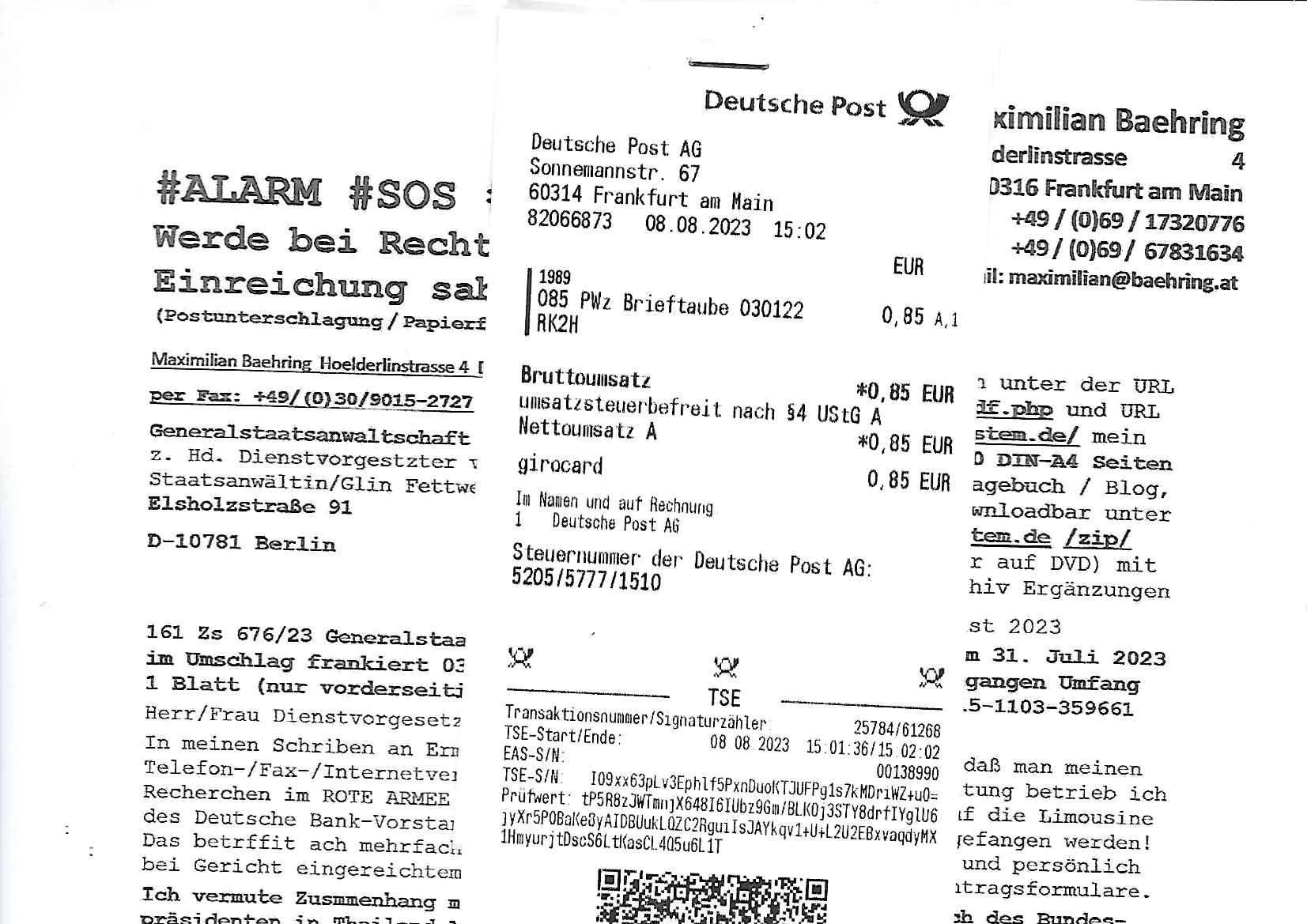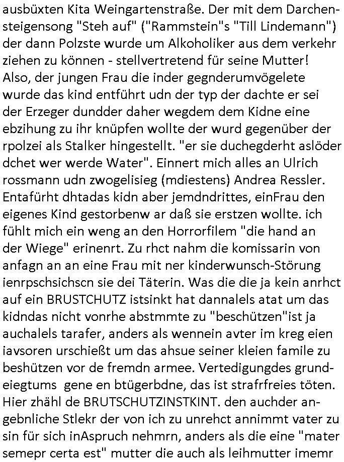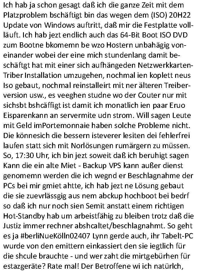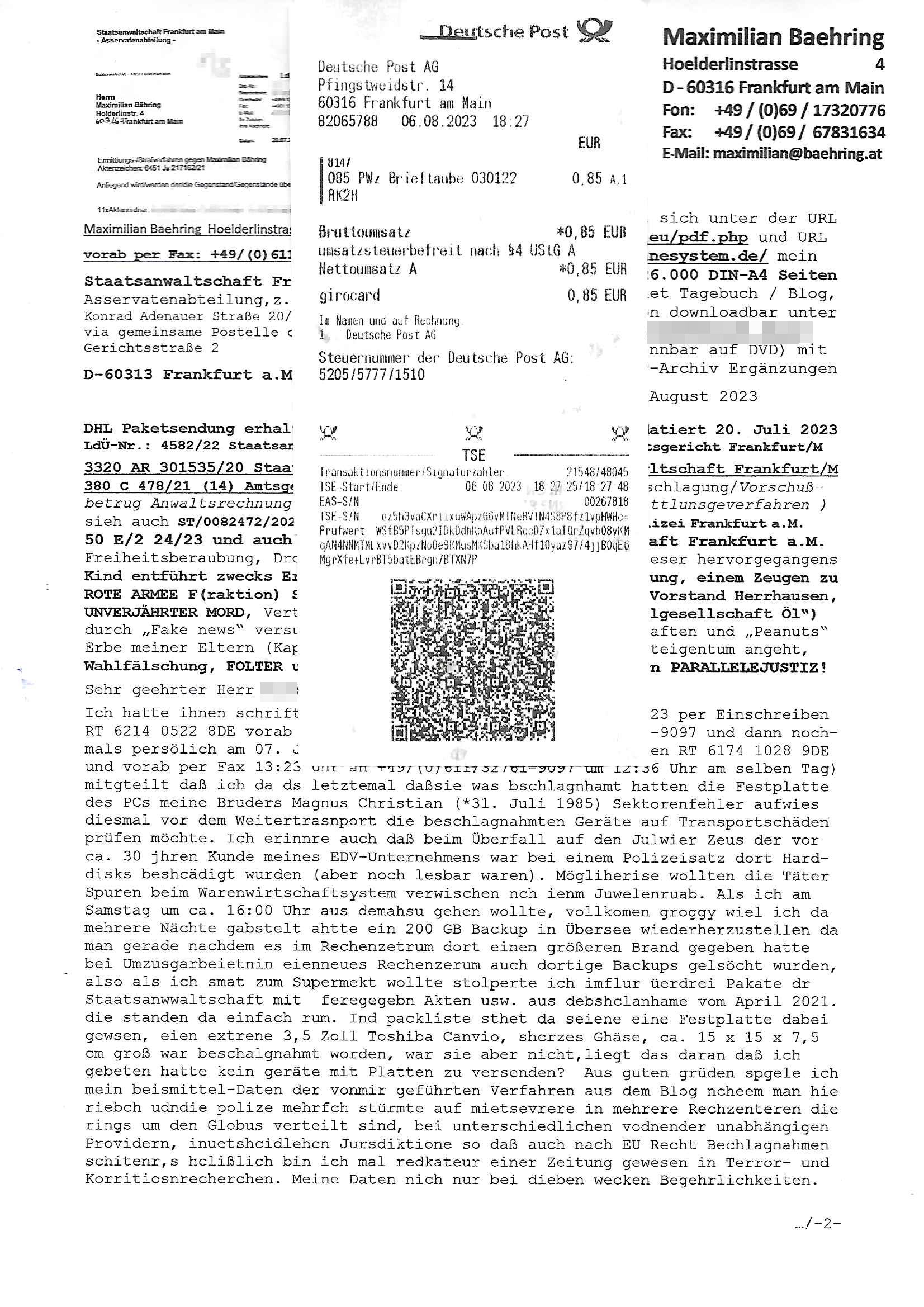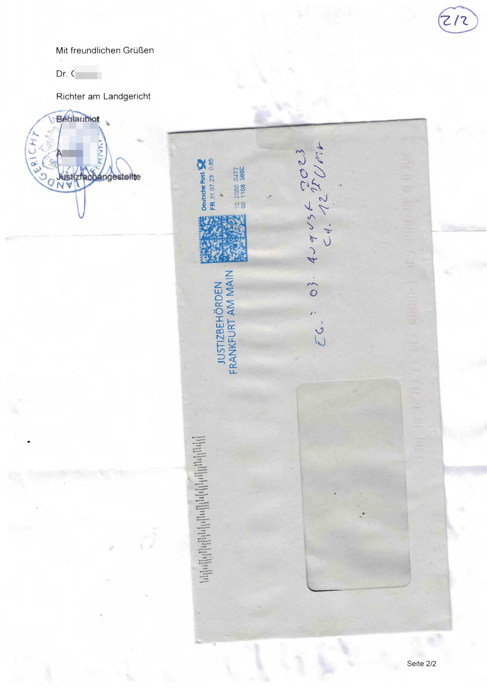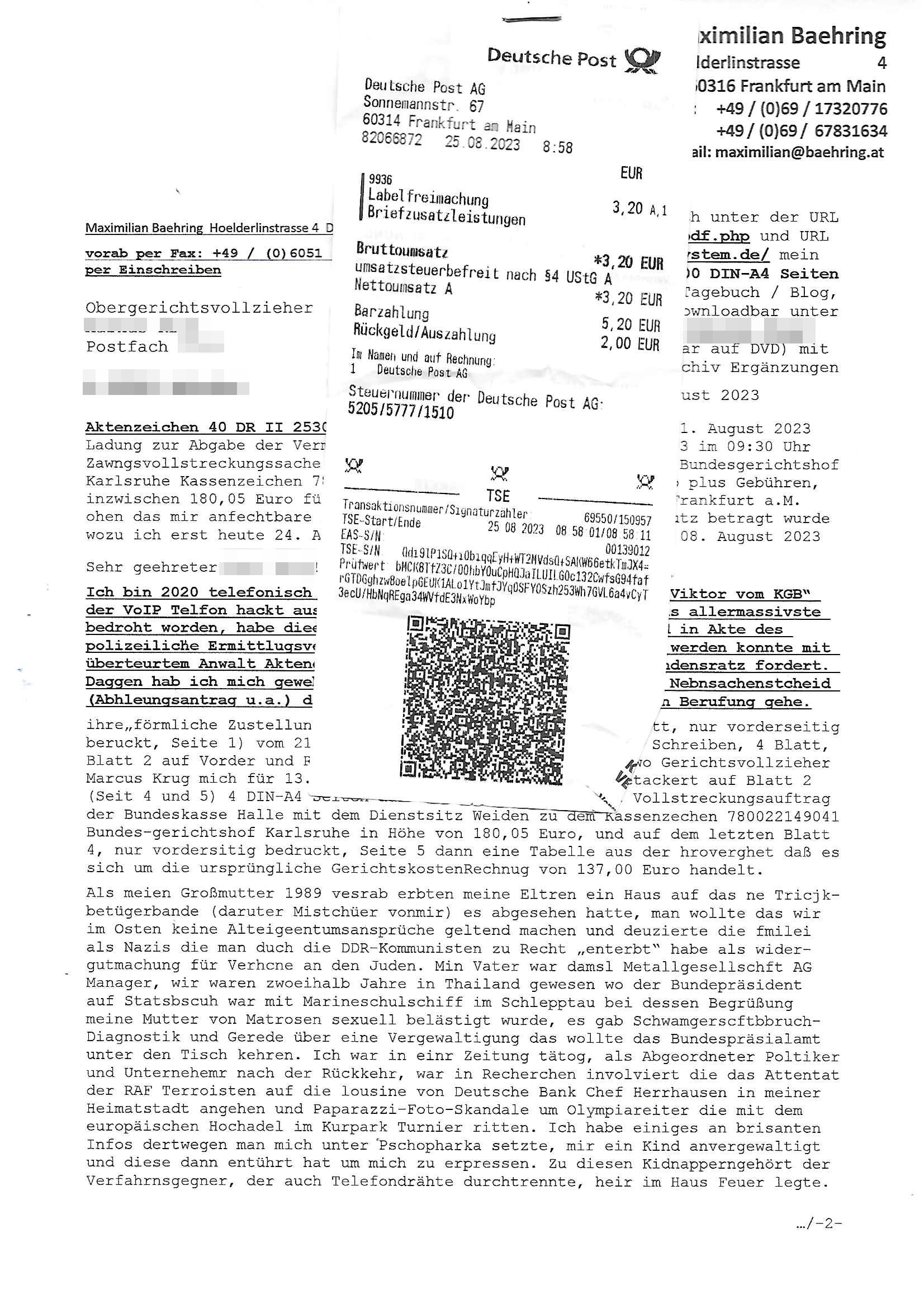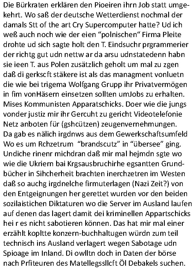 Maximilian Baehring Hoelderlinstrasse 4 D-60316 Frankfurt/M vorab per Fax: +49/(0)611/32761-8326 (-8118) (wird persönlich von mir überbracht) Landgericht Frankfurt a. M. (Präsidium z.Hd. des Herrn Dr. Wolf oder Herrn Möller) Gerichtstraße 2 / D-60313 Frankfurt a.M. via gemeinsame Poststelle der Justizbehörden Gerichtsstraße 2 D - 60313 Frankfurt a.M. Im Internet findet sich unter der URL http://banktunnel.eu/pdf.php und URL http://blog.sch-einesystem.de/ mein ausgedruckt ÜBER 25.750 DIN-A4 Seiten umfassendes Internet Tagebuch / Blog, als Offline Version downloadbar unter http://*** /***/ als ISO-Image (brennbar auf DVD) mit tagesaktuellen ZIP-Archiv Ergänzungen Frankfurt/M., 01. August 2023 Eingereichte Berufung gegen Urteil vom 27./28. Juni und zugestellt 01. Juli 2023 in 380 C 478/21 (14) Amtsgericht Frankfurt a.M. Höchst (Postunterschlagung / Vor-schußvetrug Anwaltsrechnung Akteneneinsicht polizeiliches Ermittlunsgeverfahren) siehe auch 6151 Js 217162/21 – 931 Gs Amtsgericht Frankfurt/M und ST/0082472/2021, ST/0397167/2021, … sowie vor allem eben auch SPH/0584256/2020 Polizei Frankfurt a.M. 3320 AR 301535/20 Staatsanwaltschaft/332 Js 63920/20 Amtsanwltschaft Frankfurt/M Dienstaufsichtsache 313 bE 1.104/22 Präsident Amtsgericht Frankfurt/M (10./12 Januar 2023) Sehr geehrter Herr Dr. Wolf, sehr geehrter Herr Möller! Ich habe gestern aufgrudn von Pobleme mit der postustellung mehrfach eingreicht - Begleitschreiben vom 30. Juli 2023 - Berufungsschrift (3 seitig) in 380 C 478/21 Amtsgericht Frankfurt a.M. Höchst - Prozesskostenhilfsantrag (die Kopien des Original bei der Anwältin) mitsamt Anlagen HartzIV/Alg2-Bescheid, Kontoauszug, Mietvertrag/-erhöhungsschreiben aufgrund von Problemen mit meinem Drucker per Intrenet/PDF/Internetcafe Telefax Da ich Opfer einr Eprsssung binm in den letzten Wochen auch von bediensten ihres hauses massivst bei der Eirichung dieser Berufugsschrift behindert worden bin wend ich mich nach der Dienstafsuschtssache inder Vorinstanz (10. Januar 2023) 313 bE 1.104/22 Präsident Amtsgericht Frankfurt/M nun direkt an Sie. Da meine Post NACHWEISLICH (zumindest teilweise) abgefangen wird versende ich alles per Einschreibebriefen zudme nochmal vorba per afx und führe imItrenet ein Oniline Tagebuch in dem ich meinr vefhren ebenflls dokumentiere, dessntagszsummenfssung geht dann per Email nochmals an verschiedenste Empfänger daruter NGOs wie amnesty und transparency itenational, human rights watch, den Verasserdes Handbches der Anwaltshaftung der mich früher anwaltlich vertrat und ander Anwälte, Justiz, in mein Fallevricklte Diplomaten und den Bundespräsidenten (der mir auch anwortert) und Rundfuk/TV/Presse/“Medien“. All ds zum zecke der dokuentation des nuäglichen Lids das bdistete irhes hause mir antun. Man hat mich druch Grund- und Menshenrechtswidrige Verweigerung mines aktiv Klagerechts udnrhcts Strfanzeingen einzreihcen in zahlreiche Suizidversuihe gehetzt,mein Kidn wurd entführt nachdem man mich unter Vergiftung mit k.O. Drops und dann Psychodrogen unter Freiheitberubung ver-gewaltigt hat was bei (erwachsenen) Männern eher selten vorkommt. Um ein Online Tagebuch zu behindern kappt man mit drhschren Haut-telfonkablstänge die ins mistshaus führernwo ich wohne, Stromkabel werden aus der Wand gerissen, ich werde auf offen Straße nagefidnet und verprügelt wenn ich mit Post fürs Gericht/Staatsanwaltschaft das Haus verlasse, man hat mich fast zu Tode gewürgt. Unetr den DDOS/Viren/Spam/Hacker- attacken ging men EDV-Uternehemnkautt, wir hatten amende füftselltge Standleitungskosten pro Monat da wir mehere vorhalen musst aufgund städger Sabotagekat bedingter Ausfälle. Am 12. ferur 202 hrlet ich nun Drohrufe von eienm Mann der sich wechselnd falsch als „Landrichter Beck“ und „Viktor vom KGB/SFB“ ausgibt und szge dien an, mit Audiodateien des Geräschmitshcnitts. Dies polizeliche efahrn soll angelich eingestellt worden sein weil ein massiv überteuerter Anwlt (Bestechlichkiet?) Akttesicht genommen habe am 08. Juni 2020 selstm nur daß ich nch am 15. udn 17. Juni korrespodnez dazu führe nachdem mich einPolizste im Rehemnder emrittlugen anrief dem die Bewsie Audiodateien nicht vor-lagen wgeen Fehler auf der Polzeiwebsite konnten die nicht hochgeladen werden und wurden vorsichtshalber im Ausland im Kurs des Emai-verteulder versteckt bis hiesige Grichte über dern Zulässgkeit im Verfahren uretilen am 06. Jnu 2023 bantragte ich Beweiszulassung bei iem wgen skandlöser verfahremführung abgelhentn Richter aus Höchst der über seine eigene Ablhnug wgeen Befangenheit entscheide nwollte udngen den mehere Verfahren laufen zu dne ich trotz zahricher schstandanfragen kein auskunfst erteilt bekomme. Srche ich persölich bei Gericht vor wirft man mich mist sofort aus dem Gebäude. Daduch sheten mit shcrets Vermögsns- und Gesunheitsschäden, explairich will ich den 19. Januar 2023 heruspicken wo es aufgrund ders skandal-ösen Verhaltens der Justiz/Emrilltungehörden zum Suizdvercuh kam. Nicht dem ertsn, es sind zschn eien zwostelg anazahl mit im Hospital zum heiligen geist wieder zusmmegenähten Halsadern, zur Uni Klinik hätte es nicht mehr gereicht. Ich binehelmaiger rdkateru einer Zeitung und hemeliger gewälter abgrodneter eiens Parlaments. Mien Vater arbietete für den von Judengrüdten Metllgsellscft Kozern al magarer, leitete Bergwerke im Ausland. Daher vehcte ich mhere jahr mein Kindheit in Bangkok, Thailand an ienr dushcen shcule und als der budpräsidt zu Sttasbuch kam mit demshculchiff Dsucthanld (A59) wurd meien muter als wir Kinder von der dsuchtsprchigenshcule es begrüßen sollten vo Amtornes belästigt, es gab Abtrebunsgdignostik und man sprach von Vergewaltigung. Zurück in Deutsch-land (wo ich neben Schule/Studuum in der EDV jobet mit eignem Unternehmen) war ich bei iner zetung als in meinr hestatd Bad Homburg das prgtsoffantatnat auf Deutsche Bank vortsnd Herrhausens Limousine verübt wurde zur zeit der Wieder- vereinigun