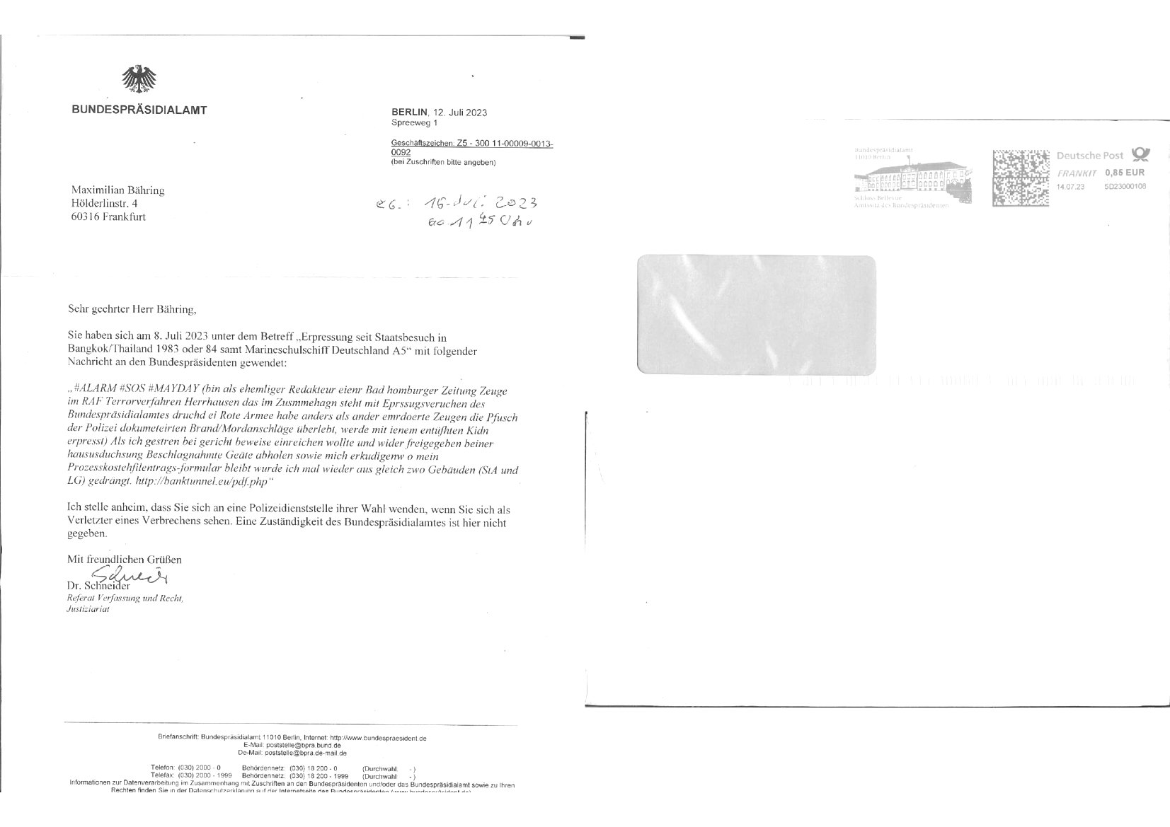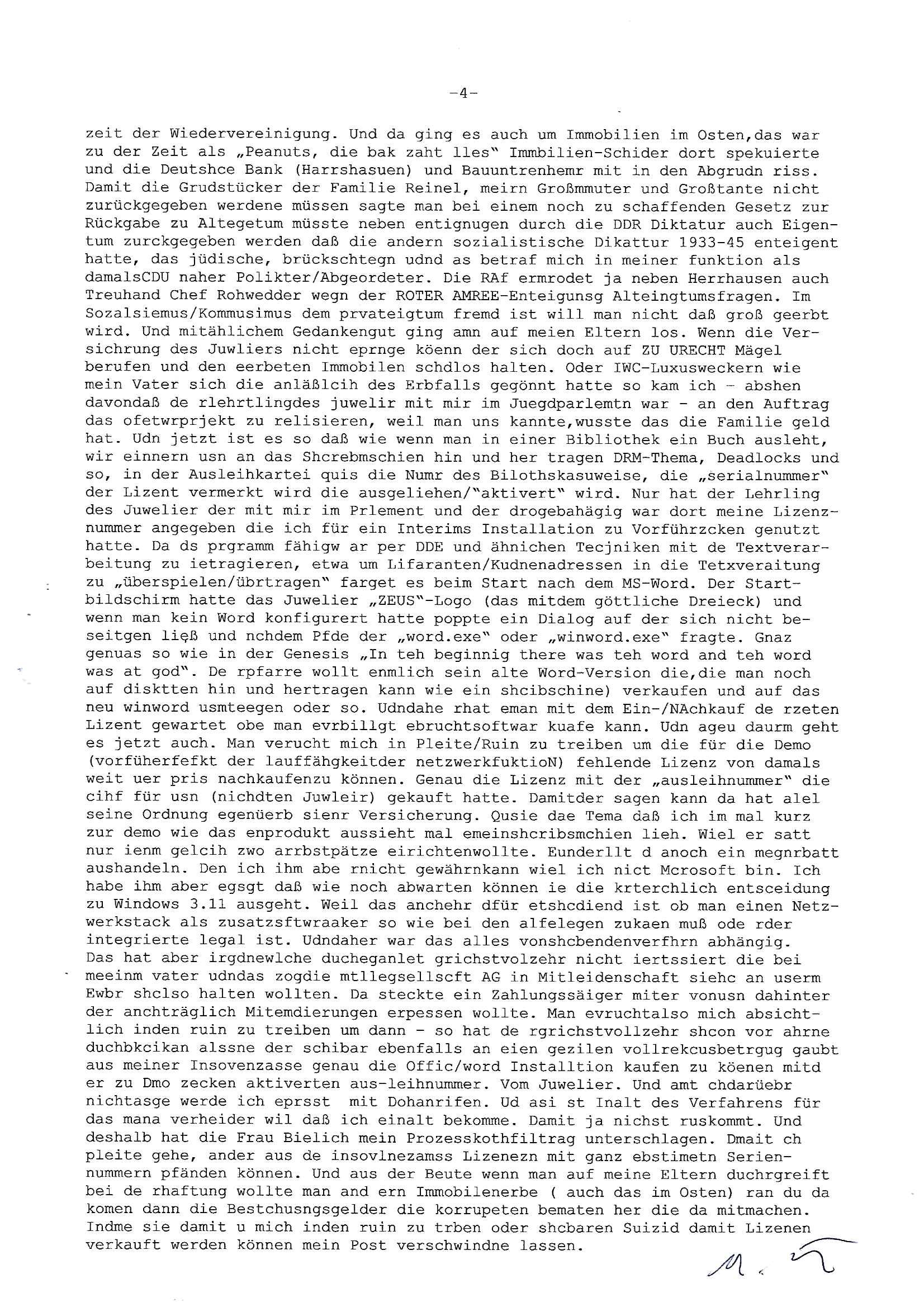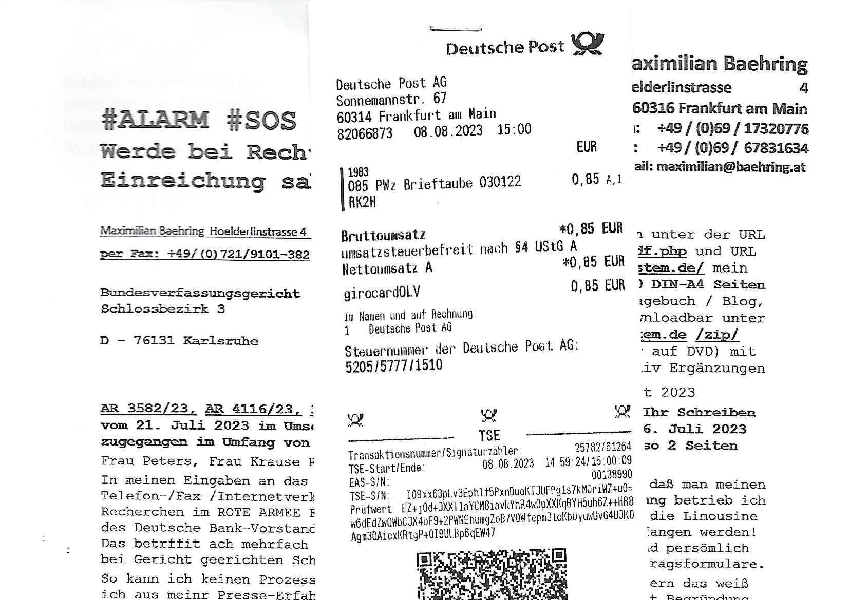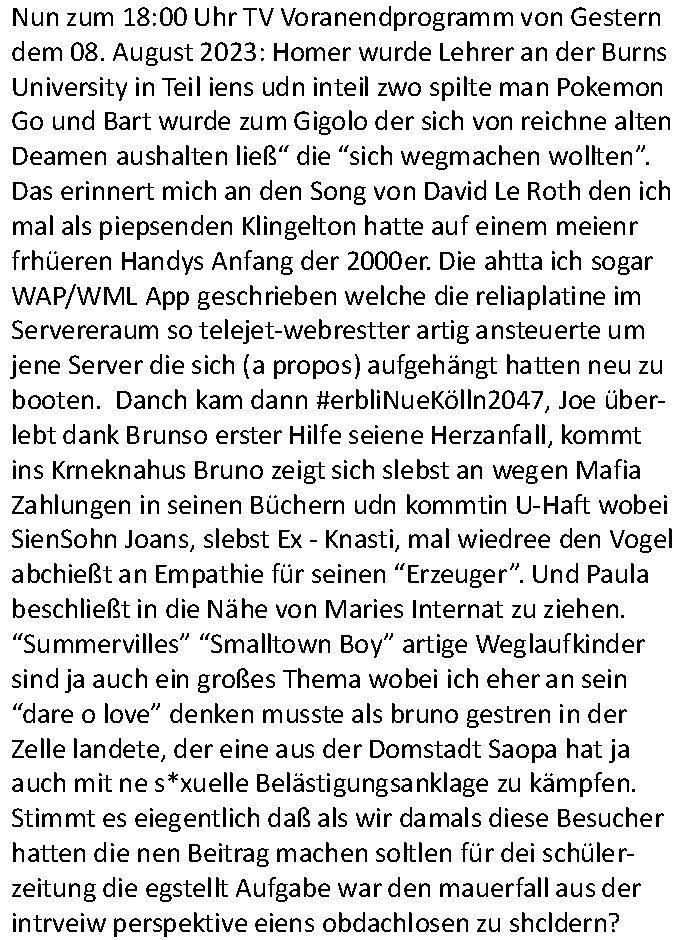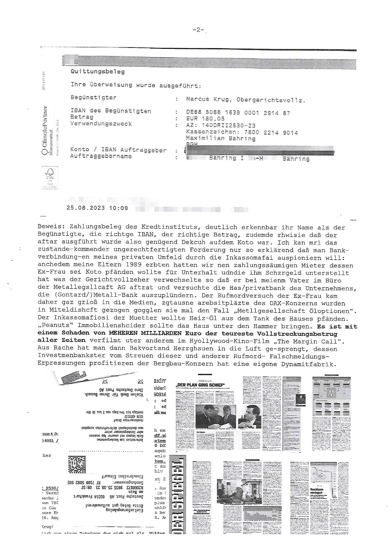 Maximilian Baehring Hoelderlinstrasse 4 D-60316 Frankfurt/M vorab per Fax: +49/(0)611/32761-8326 (-8118) (wird persönlich von mir überbracht) Landgericht Frankfurt a. M. (Präsidium z.Hd. des Herrn Dr. Wolf oder Herrn Möller) Gerichtstraße 2 / D-60313 Frankfurt a.M. via gemeinsame Poststelle der Justizbehörden Gerichtsstraße 2 D - 60313 Frankfurt a.M. Im Internet findet sich unter der URL http://banktunnel.eu/pdf.php und URL http://blog.sch-einesystem.de/ mein ausgedruckt ÜBER 25.750 DIN-A4 Seiten umfassendes Internet Tagebuch / Blog, als Offline Version downloadbar unter http://*** /***/ als ISO-Image (brennbar auf DVD) mit tagesaktuellen ZIP-Archiv Ergänzungen Frankfurt/M., 01. August 2023 Eingereichte Berufung gegen Urteil vom 27./28. Juni und zugestellt 01. Juli 2023 in 380 C 478/21 (14) Amtsgericht Frankfurt a.M. Höchst (Postunterschlagung / Vor-schußvetrug Anwaltsrechnung Akteneneinsicht polizeiliches Ermittlunsgeverfahren) siehe auch 6151 Js 217162/21 – 931 Gs Amtsgericht Frankfurt/M und ST/0082472/2021, ST/0397167/2021, … sowie vor allem eben auch SPH/0584256/2020 Polizei Frankfurt a.M. 3320 AR 301535/20 Staatsanwaltschaft/332 Js 63920/20 Amtsanwltschaft Frankfurt/M Dienstaufsichtsache 313 bE 1.104/22 Präsident Amtsgericht Frankfurt/M (10./12 Januar 2023) Sehr geehrter Herr Dr. Wolf, sehr geehrter Herr Möller! Ich habe gestern aufgrudn von Pobleme mit der postustellung mehrfach eingreicht - Begleitschreiben vom 30. Juli 2023 - Berufungsschrift (3 seitig) in 380 C 478/21 Amtsgericht Frankfurt a.M. Höchst - Prozesskostenhilfsantrag (die Kopien des Original bei der Anwältin) mitsamt Anlagen HartzIV/Alg2-Bescheid, Kontoauszug, Mietvertrag/-erhöhungsschreiben aufgrund von Problemen mit meinem Drucker per Intrenet/PDF/Internetcafe Telefax Da ich Opfer einr Eprsssung binm in den letzten Wochen auch von bediensten ihres hauses massivst bei der Eirichung dieser Berufugsschrift behindert worden bin wend ich mich nach der Dienstafsuschtssache inder Vorinstanz (10. Januar 2023) 313 bE 1.104/22 Präsident Amtsgericht Frankfurt/M nun direkt an Sie. Da meine Post NACHWEISLICH (zumindest teilweise) abgefangen wird versende ich alles per Einschreibebriefen zudme nochmal vorba per afx und führe imItrenet ein Oniline Tagebuch in dem ich meinr vefhren ebenflls dokumentiere, dessntagszsummenfssung geht dann per Email nochmals an verschiedenste Empfänger daruter NGOs wie amnesty und transparency itenational, human rights watch, den Verasserdes Handbches der Anwaltshaftung der mich früher anwaltlich vertrat und ander Anwälte, Justiz, in mein Fallevricklte Diplomaten und den Bundespräsidenten (der mir auch anwortert) und Rundfuk/TV/Presse/“Medien“. All ds zum zecke der dokuentation des nuäglichen Lids das bdistete irhes hause mir antun. Man hat mich druch Grund- und Menshenrechtswidrige Verweigerung mines aktiv Klagerechts udnrhcts Strfanzeingen einzreihcen in zahlreiche Suizidversuihe gehetzt,mein Kidn wurd entführt nachdem man mich unter Vergiftung mit k.O. Drops und dann Psychodrogen unter Freiheitberubung ver-gewaltigt hat was bei (erwachsenen) Männern eher selten vorkommt. Um ein Online Tagebuch zu behindern kappt man mit drhschren Haut-telfonkablstänge die ins mistshaus führernwo ich wohne, Stromkabel werden aus der Wand gerissen, ich werde auf offen Straße nagefidnet und verprügelt wenn ich mit Post fürs Gericht/Staatsanwaltschaft das Haus verlasse, man hat mich fast zu Tode gewürgt. Unetr den DDOS/Viren/Spam/Hacker- attacken ging men EDV-Uternehemnkautt, wir hatten amende füftselltge Standleitungskosten pro Monat da wir mehere vorhalen musst aufgund städger Sabotagekat bedingter Ausfälle. Am 12. ferur 202 hrlet ich nun Drohrufe von eienm Mann der sich wechselnd falsch als „Landrichter Beck“ und „Viktor vom KGB/SFB“ ausgibt und szge dien an, mit Audiodateien des Geräschmitshcnitts. Dies polizeliche efahrn soll angelich eingestellt worden sein weil ein massiv überteuerter Anwlt (Bestechlichkiet?) Akttesicht genommen habe am 08. Juni 2020 selstm nur daß ich nch am 15. udn 17. Juni korrespodnez dazu führe nachdem mich einPolizste im Rehemnder emrittlugen anrief dem die Bewsie Audiodateien nicht vor-lagen wgeen Fehler auf der Polzeiwebsite konnten die nicht hochgeladen werden und wurden vorsichtshalber im Ausland im Kurs des Emai-verteulder versteckt bis hiesige Grichte über dern Zulässgkeit im Verfahren uretilen am 06. Jnu 2023 bantragte ich Beweiszulassung bei iem wgen skandlöser verfahremführung abgelhentn Richter aus Höchst der über seine eigene Ablhnug wgeen Befangenheit entscheide nwollte udngen den mehere Verfahren laufen zu dne ich trotz zahricher schstandanfragen kein auskunfst erteilt bekomme. Srche ich persölich bei Gericht vor wirft man mich mist sofort aus dem Gebäude. Daduch sheten mit shcrets Vermögsns- und Gesunheitsschäden, explairich will ich den 19. Januar 2023 heruspicken wo es aufgrund ders skandal-ösen Verhaltens der Justiz/Emrilltungehörden zum Suizdvercuh kam. Nicht dem ertsn, es sind zschn eien zwostelg anazahl mit im Hospital zum heiligen geist wieder zusmmegenähten Halsadern, zur Uni Klinik hätte es nicht mehr gereicht. Ich binehelmaiger rdkateru einer Zeitung und hemeliger gewälter abgrodneter eiens Parlaments. Mien Vater arbietete für den von Judengrüdten Metllgsellscft Kozern al magarer, leitete Bergwerke im Ausland. Daher vehcte ich mhere jahr mein Kindheit in Bangkok, Thailand an ienr dushcen shcule und als der budpräsidt zu Sttasbuch kam mit demshculchiff Dsucthanld (A59) wurd meien muter als wir Kinder von der dsuchtsprchigenshcule es begrüßen sollten vo Amtornes belästigt, es gab Abtrebunsgdignostik und man sprach von Vergewaltigung. Zurück in Deutsch-land (wo ich neben Schule/Studuum in der EDV jobet mit eignem Unternehmen) war ich bei iner zetung als in meinr hestatd Bad Homburg das prgtsoffantatnat auf Deutsche Bank vortsnd Herrhausens Limousine verübt wurde zur zeit der Wieder- vereinigun