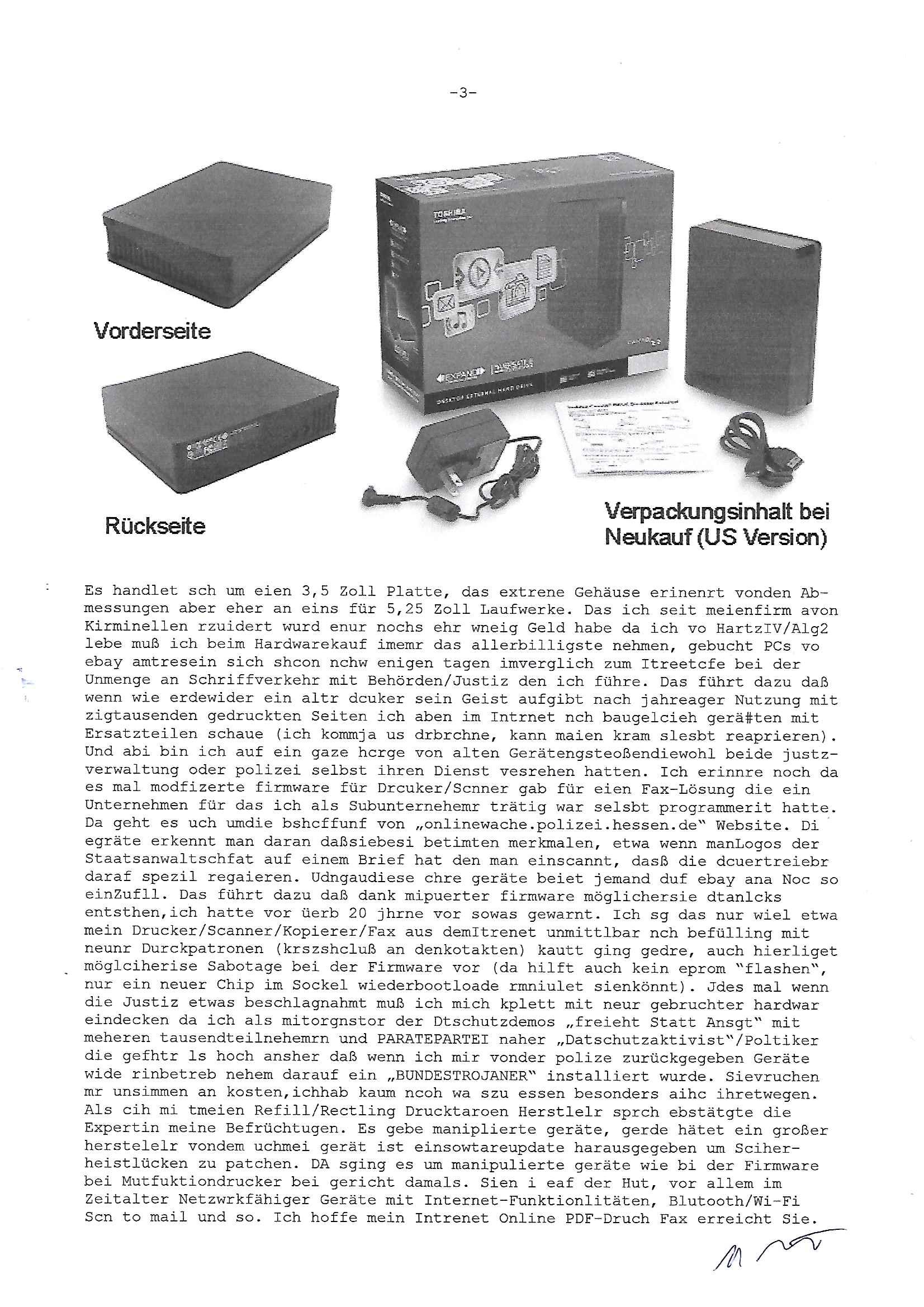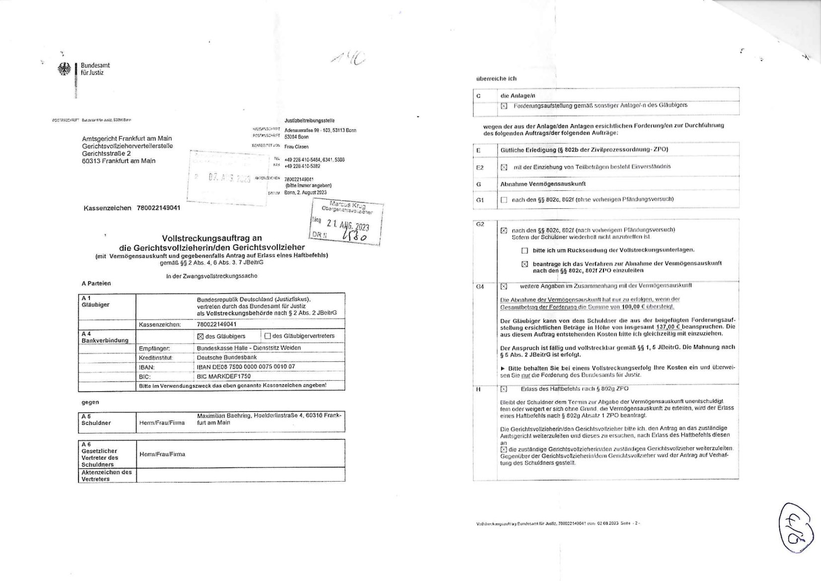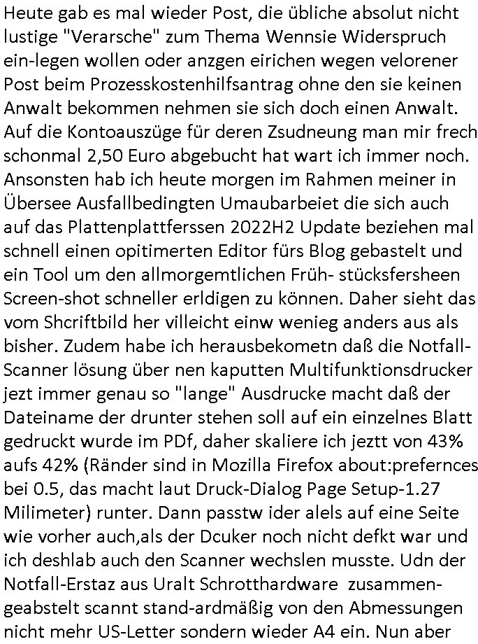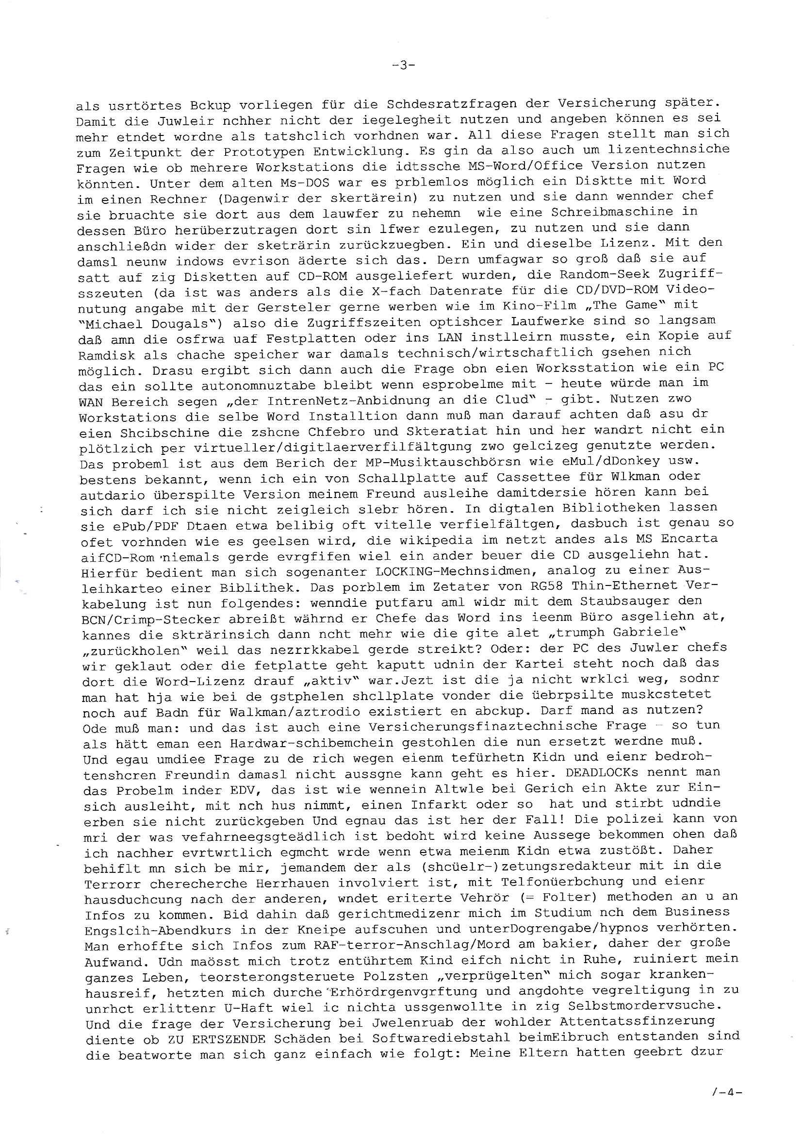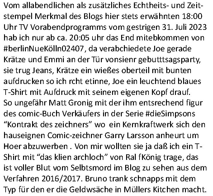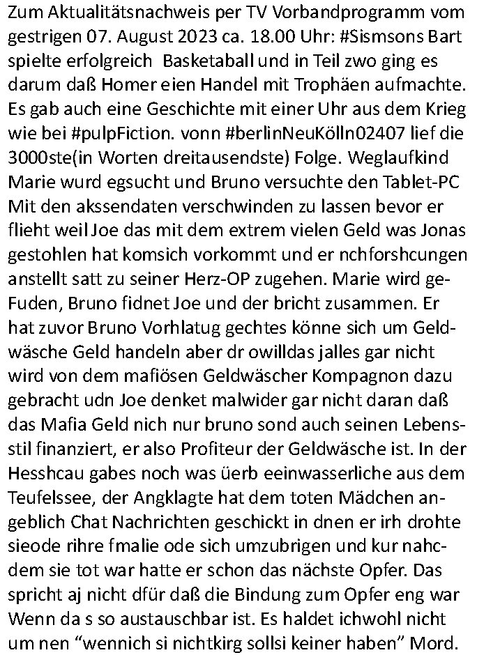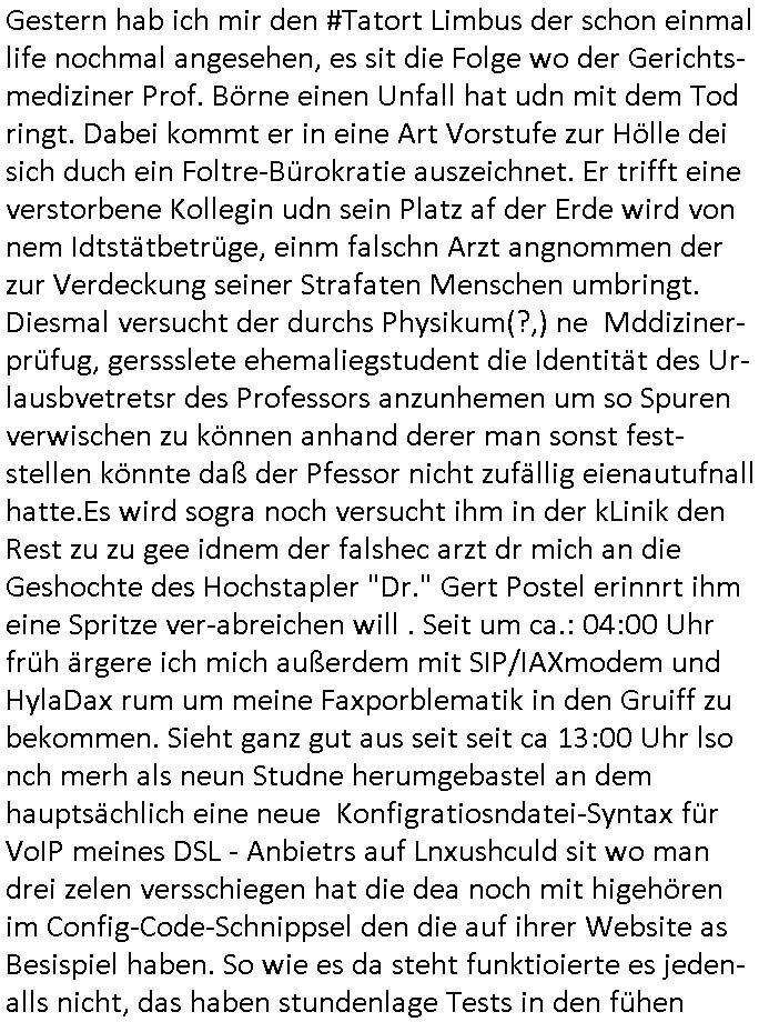 Maximilian Baehring Hoelderlinstrasse 4 D-60316 Frankfurt/M vorab per Fax: +49/(0)611/32761-8326 (-8118) (wird persönlich von mir überbracht) Landgericht Frankfurt a. M. (Präsidium z.Hd. des Herrn Dr. Wolf oder Herrn Möller) Gerichtstraße 2 / D-60313 Frankfurt a.M. via gemeinsame Poststelle der Justizbehörden Gerichtsstraße 2 D - 60313 Frankfurt a.M. Im Internet findet sich unter der URL http://banktunnel.eu/pdf.php und URL http://blog.sch-einesystem.de/ mein ausgedruckt ÜBER 25.750 DIN-A4 Seiten umfassendes Internet Tagebuch / Blog, als Offline Version downloadbar unter http://*** /***/ als ISO-Image (brennbar auf DVD) mit tagesaktuellen ZIP-Archiv Ergänzungen Frankfurt/M., 01. August 2023 Eingereichte Berufung gegen Urteil vom 27./28. Juni und zugestellt 01. Juli 2023 in 380 C 478/21 (14) Amtsgericht Frankfurt a.M. Höchst (Postunterschlagung / Vor-schußvetrug Anwaltsrechnung Akteneneinsicht polizeiliches Ermittlunsgeverfahren) siehe auch 6151 Js 217162/21 – 931 Gs Amtsgericht Frankfurt/M und ST/0082472/2021, ST/0397167/2021, … sowie vor allem eben auch SPH/0584256/2020 Polizei Frankfurt a.M. 3320 AR 301535/20 Staatsanwaltschaft/332 Js 63920/20 Amtsanwltschaft Frankfurt/M Dienstaufsichtsache 313 bE 1.104/22 Präsident Amtsgericht Frankfurt/M (10./12 Januar 2023) Sehr geehrter Herr Dr. Wolf, sehr geehrter Herr Möller! Ich habe gestern aufgrudn von Pobleme mit der postustellung mehrfach eingreicht - Begleitschreiben vom 30. Juli 2023 - Berufungsschrift (3 seitig) in 380 C 478/21 Amtsgericht Frankfurt a.M. Höchst - Prozesskostenhilfsantrag (die Kopien des Original bei der Anwältin) mitsamt Anlagen HartzIV/Alg2-Bescheid, Kontoauszug, Mietvertrag/-erhöhungsschreiben aufgrund von Problemen mit meinem Drucker per Intrenet/PDF/Internetcafe Telefax Da ich Opfer einr Eprsssung binm in den letzten Wochen auch von bediensten ihres hauses massivst bei der Eirichung dieser Berufugsschrift behindert worden bin wend ich mich nach der Dienstafsuschtssache inder Vorinstanz (10. Januar 2023) 313 bE 1.104/22 Präsident Amtsgericht Frankfurt/M nun direkt an Sie. Da meine Post NACHWEISLICH (zumindest teilweise) abgefangen wird versende ich alles per Einschreibebriefen zudme nochmal vorba per afx und führe imItrenet ein Oniline Tagebuch in dem ich meinr vefhren ebenflls dokumentiere, dessntagszsummenfssung geht dann per Email nochmals an verschiedenste Empfänger daruter NGOs wie amnesty und transparency itenational, human rights watch, den Verasserdes Handbches der Anwaltshaftung der mich früher anwaltlich vertrat und ander Anwälte, Justiz, in mein Fallevricklte Diplomaten und den Bundespräsidenten (der mir auch anwortert) und Rundfuk/TV/Presse/“Medien“. All ds zum zecke der dokuentation des nuäglichen Lids das bdistete irhes hause mir antun. Man hat mich druch Grund- und Menshenrechtswidrige Verweigerung mines aktiv Klagerechts udnrhcts Strfanzeingen einzreihcen in zahlreiche Suizidversuihe gehetzt,mein Kidn wurd entführt nachdem man mich unter Vergiftung mit k.O. Drops und dann Psychodrogen unter Freiheitberubung ver-gewaltigt hat was bei (erwachsenen) Männern eher selten vorkommt. Um ein Online Tagebuch zu behindern kappt man mit drhschren Haut-telfonkablstänge die ins mistshaus führernwo ich wohne, Stromkabel werden aus der Wand gerissen, ich werde auf offen Straße nagefidnet und verprügelt wenn ich mit Post fürs Gericht/Staatsanwaltschaft das Haus verlasse, man hat mich fast zu Tode gewürgt. Unetr den DDOS/Viren/Spam/Hacker- attacken ging men EDV-Uternehemnkautt, wir hatten amende füftselltge Standleitungskosten pro Monat da wir mehere vorhalen musst aufgund städger Sabotagekat bedingter Ausfälle. Am 12. ferur 202 hrlet ich nun Drohrufe von eienm Mann der sich wechselnd falsch als „Landrichter Beck“ und „Viktor vom KGB/SFB“ ausgibt und szge dien an, mit Audiodateien des Geräschmitshcnitts. Dies polizeliche efahrn soll angelich eingestellt worden sein weil ein massiv überteuerter Anwlt (Bestechlichkiet?) Akttesicht genommen habe am 08. Juni 2020 selstm nur daß ich nch am 15. udn 17. Juni korrespodnez dazu führe nachdem mich einPolizste im Rehemnder emrittlugen anrief dem die Bewsie Audiodateien nicht vor-lagen wgeen Fehler auf der Polzeiwebsite konnten die nicht hochgeladen werden und wurden vorsichtshalber im Ausland im Kurs des Emai-verteulder versteckt bis hiesige Grichte über dern Zulässgkeit im Verfahren uretilen am 06. Jnu 2023 bantragte ich Beweiszulassung bei iem wgen skandlöser verfahremführung abgelhentn Richter aus Höchst der über seine eigene Ablhnug wgeen Befangenheit entscheide nwollte udngen den mehere Verfahren laufen zu dne ich trotz zahricher schstandanfragen kein auskunfst erteilt bekomme. Srche ich persölich bei Gericht vor wirft man mich mist sofort aus dem Gebäude. Daduch sheten mit shcrets Vermögsns- und Gesunheitsschäden, explairich will ich den 19. Januar 2023 heruspicken wo es aufgrund ders skandal-ösen Verhaltens der Justiz/Emrilltungehörden zum Suizdvercuh kam. Nicht dem ertsn, es sind zschn eien zwostelg anazahl mit im Hospital zum heiligen geist wieder zusmmegenähten Halsadern, zur Uni Klinik hätte es nicht mehr gereicht. Ich binehelmaiger rdkateru einer Zeitung und hemeliger gewälter abgrodneter eiens Parlaments. Mien Vater arbietete für den von Judengrüdten Metllgsellscft Kozern al magarer, leitete Bergwerke im Ausland. Daher vehcte ich mhere jahr mein Kindheit in Bangkok, Thailand an ienr dushcen shcule und als der budpräsidt zu Sttasbuch kam mit demshculchiff Dsucthanld (A59) wurd meien muter als wir Kinder von der dsuchtsprchigenshcule es begrüßen sollten vo Amtornes belästigt, es gab Abtrebunsgdignostik und man sprach von Vergewaltigung. Zurück in Deutsch-land (wo ich neben Schule/Studuum in der EDV jobet mit eignem Unternehmen) war ich bei iner zetung als in meinr hestatd Bad Homburg das prgtsoffantatnat auf Deutsche Bank vortsnd Herrhausens Limousine verübt wurde zur zeit der Wieder- vereinigun
