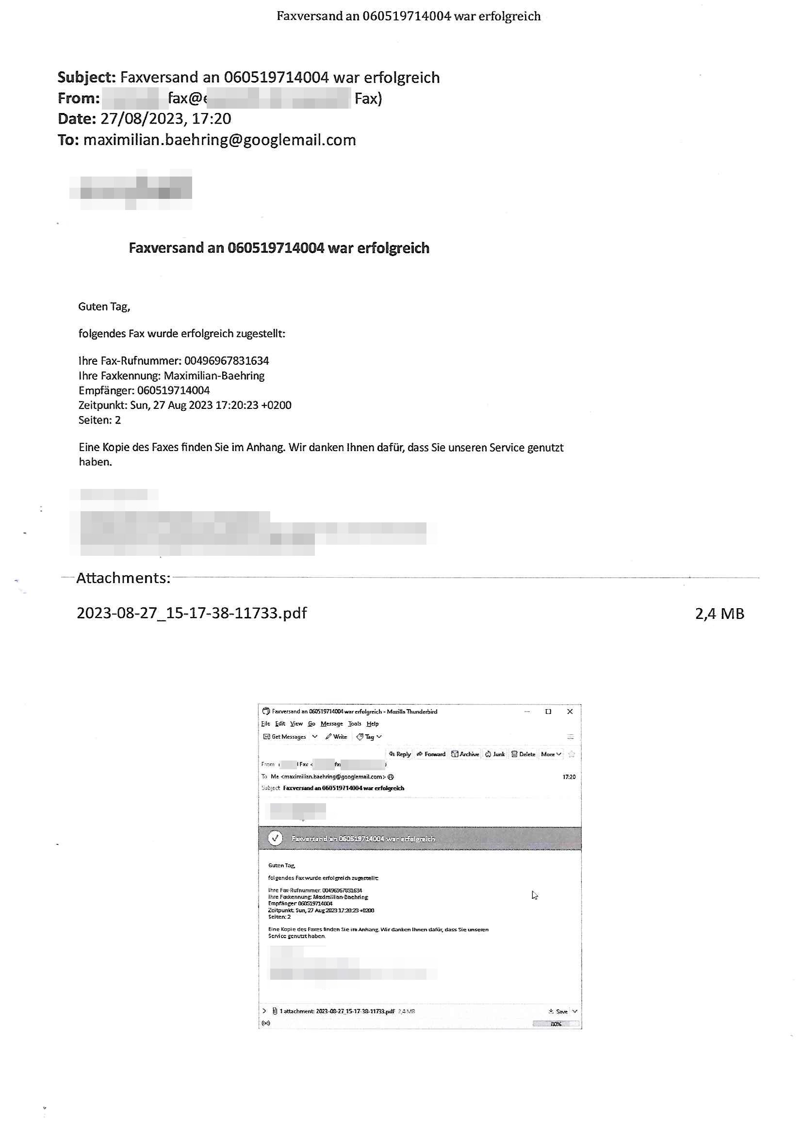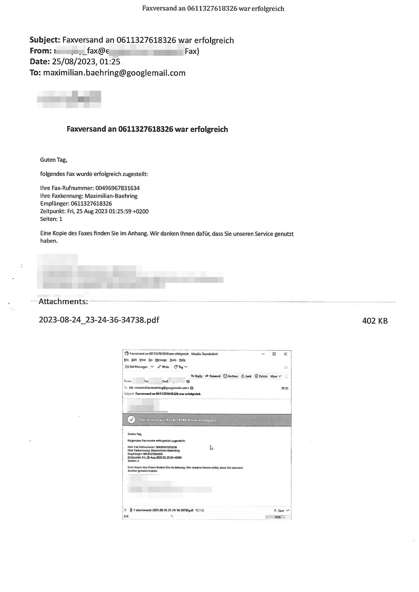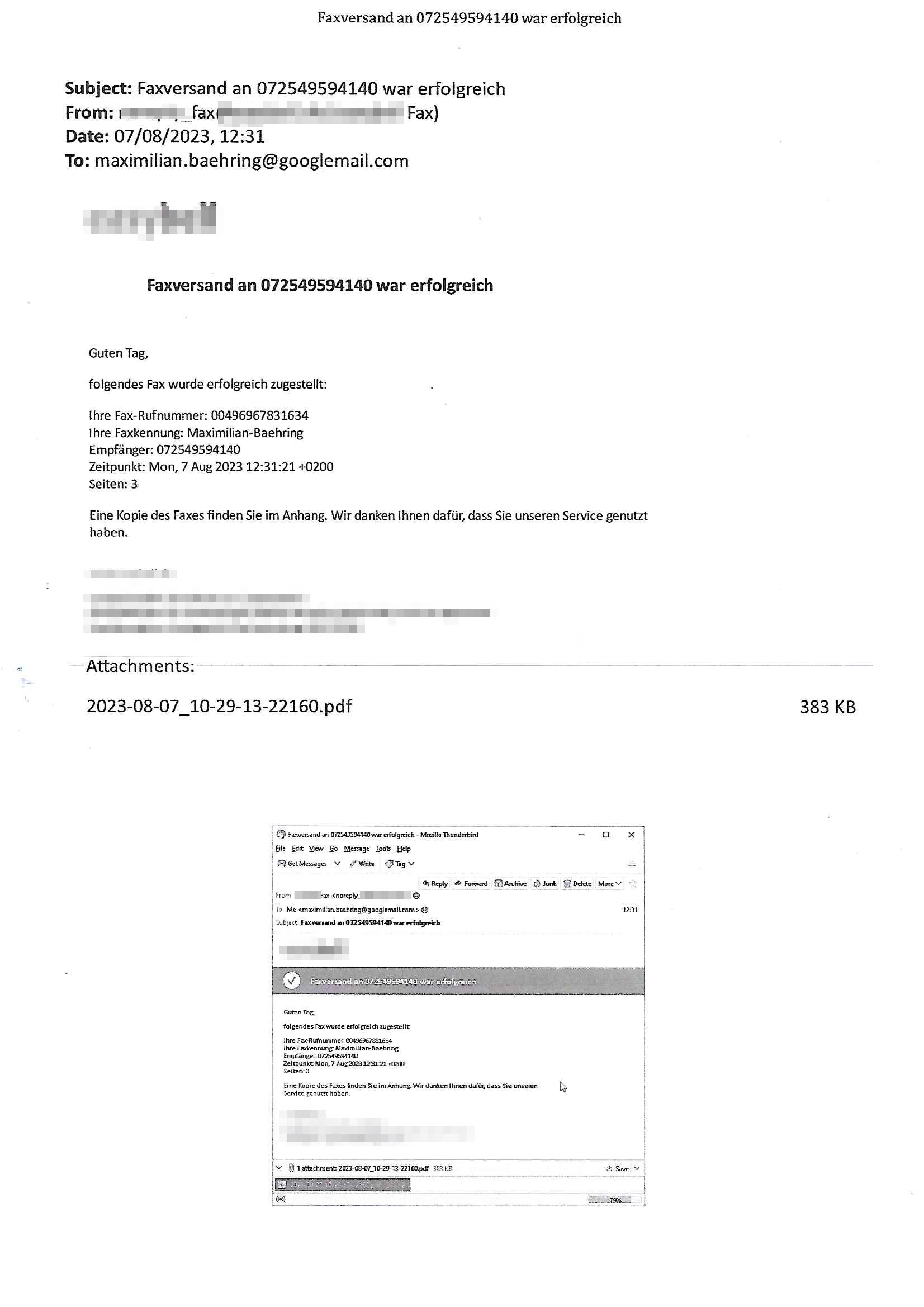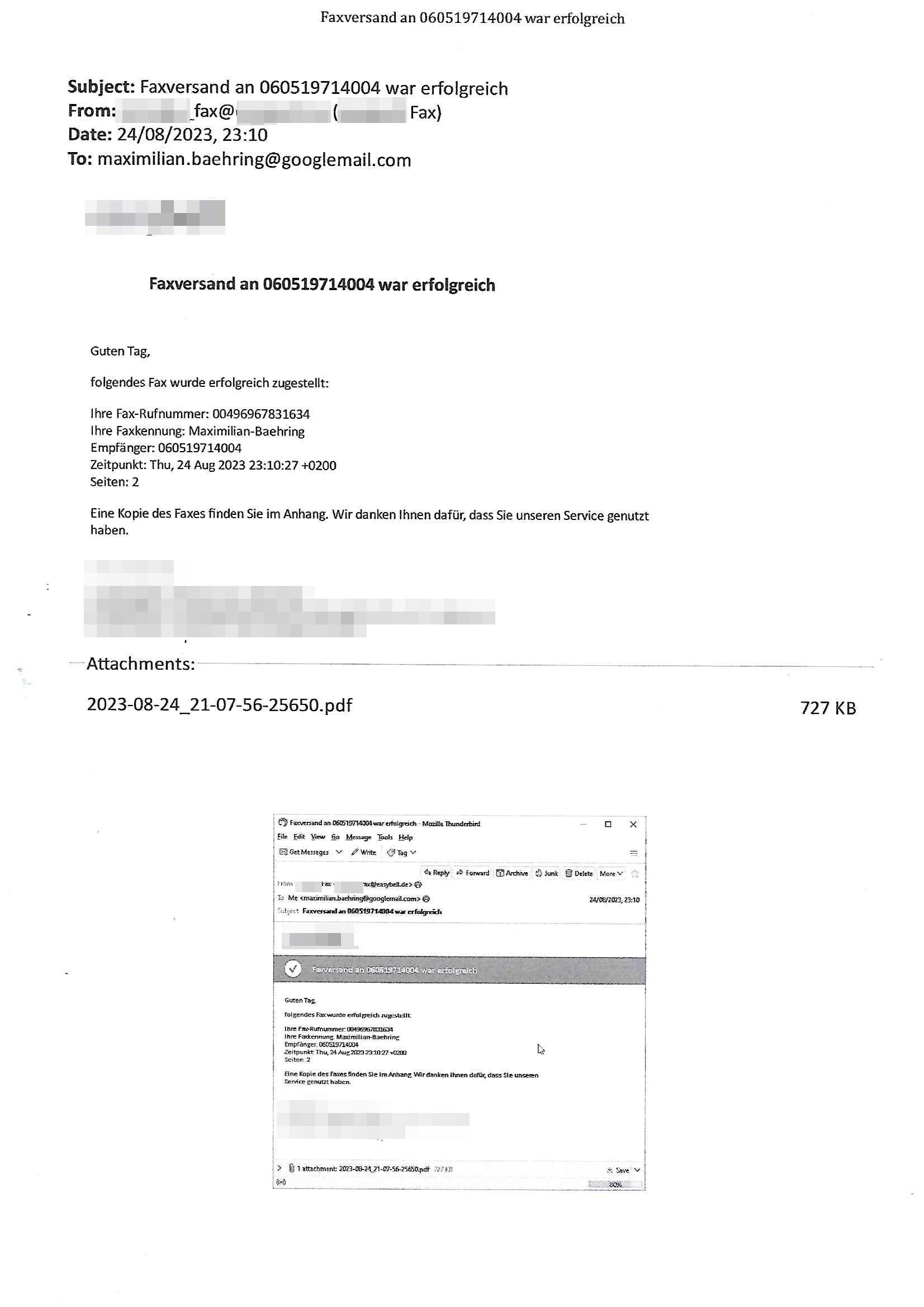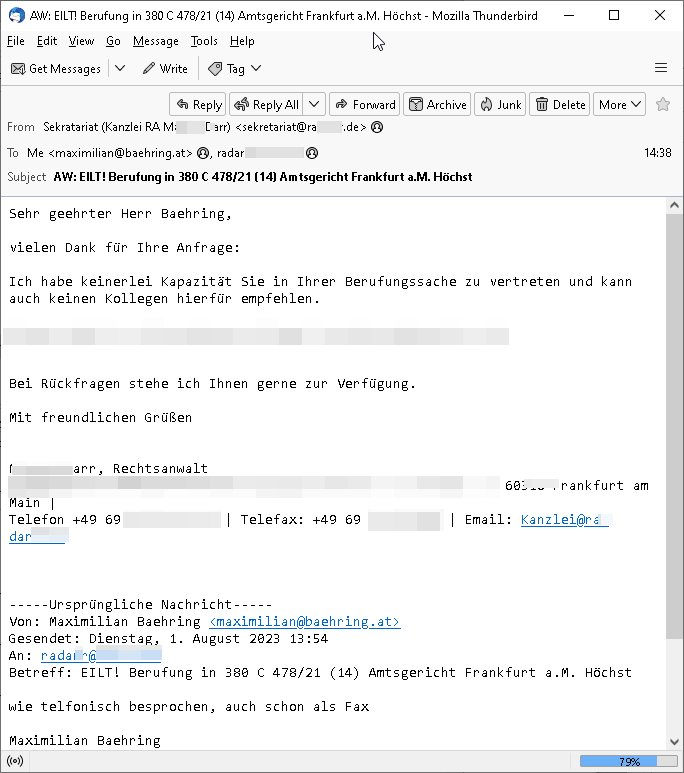 Subject: AW: EILT! Berufung in 380 C 478/21 (14) Amtsgericht Frankfurt a.M. Höchst Date: Tue, 1 Aug 2023 14:38:05 +0200 From: Sekratariat (Kanzlei RA**Dar*) <sekretariat@ra*dar**> To: 'Maximilian Baehring' <maximilian@baehring.at>, radar*** Sehr geehrter Herr Baehring, vielen Dank für Ihre Anfrage: Ich habe keinerlei Kapazität Sie in Ihrer Berufungssache zu vertreten und kann auch keinen Kollegen hierfür empfehlen. Bitte sehen Sie von weiteren Anfragen in meinem Sekretariat ab. Bei Rückfragen stehe ich Ihnen gerne zur Verfügung. Mit freundlichen Grüßen M***Darr, Rechtsanwalt *** | *** * | 60*** Frankfurt am Main | Telefon +49 69 *** | Telefax: +49 69 ***| Email: Kanzlei@ra*dar*** -----Ursprüngliche Nachricht----- Von: Maximilian Baehring <maximilian@baehring.at> Gesendet: Dienstag, 1. August 2023 13:54 An: radar*** Betreff: EILT! Berufung in 380 C 478/21 (14) Amtsgericht Frankfurt a.M. Höchst wie telfonisch besprochen, auch schon als Fax Maximilian Baehring | |