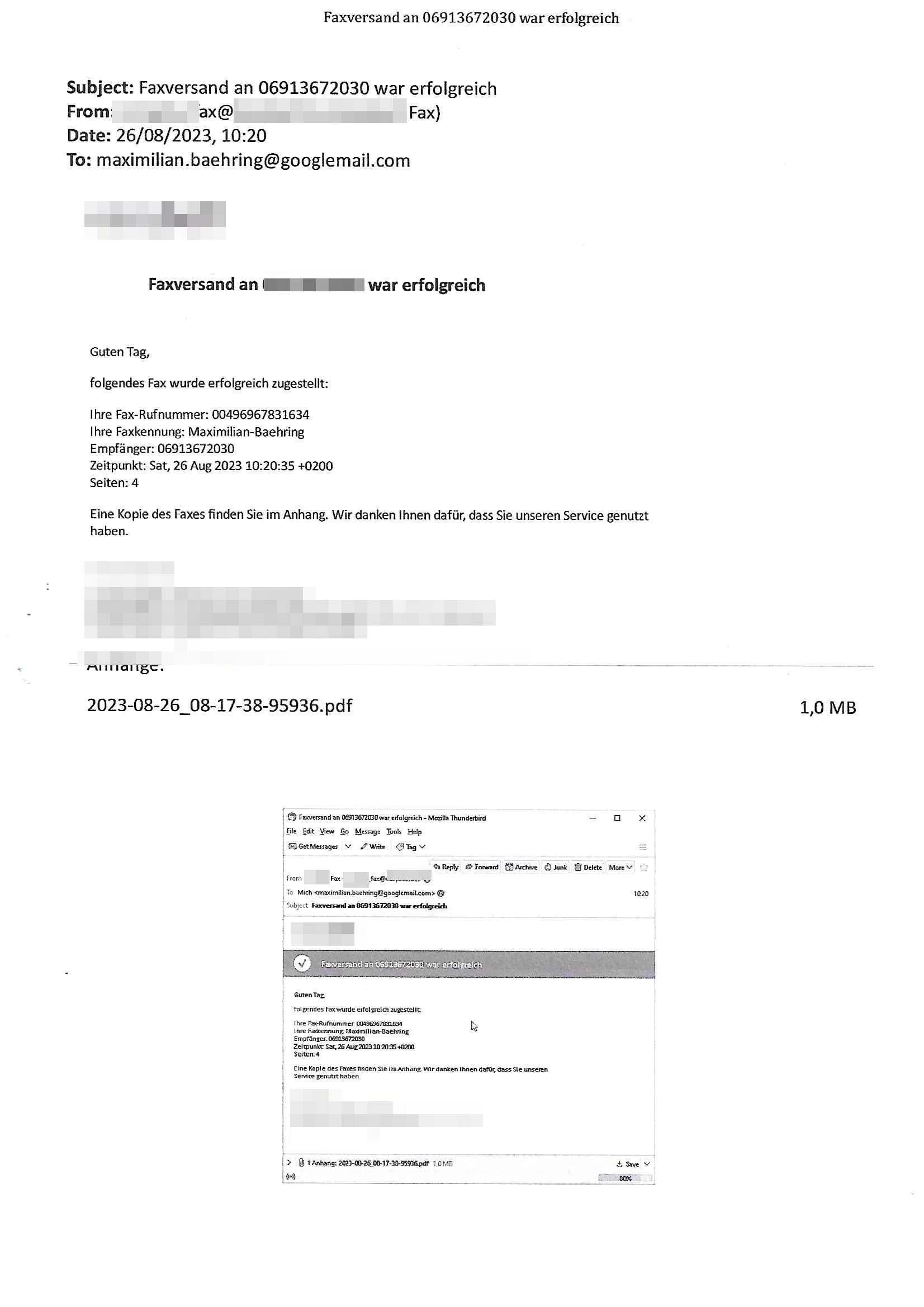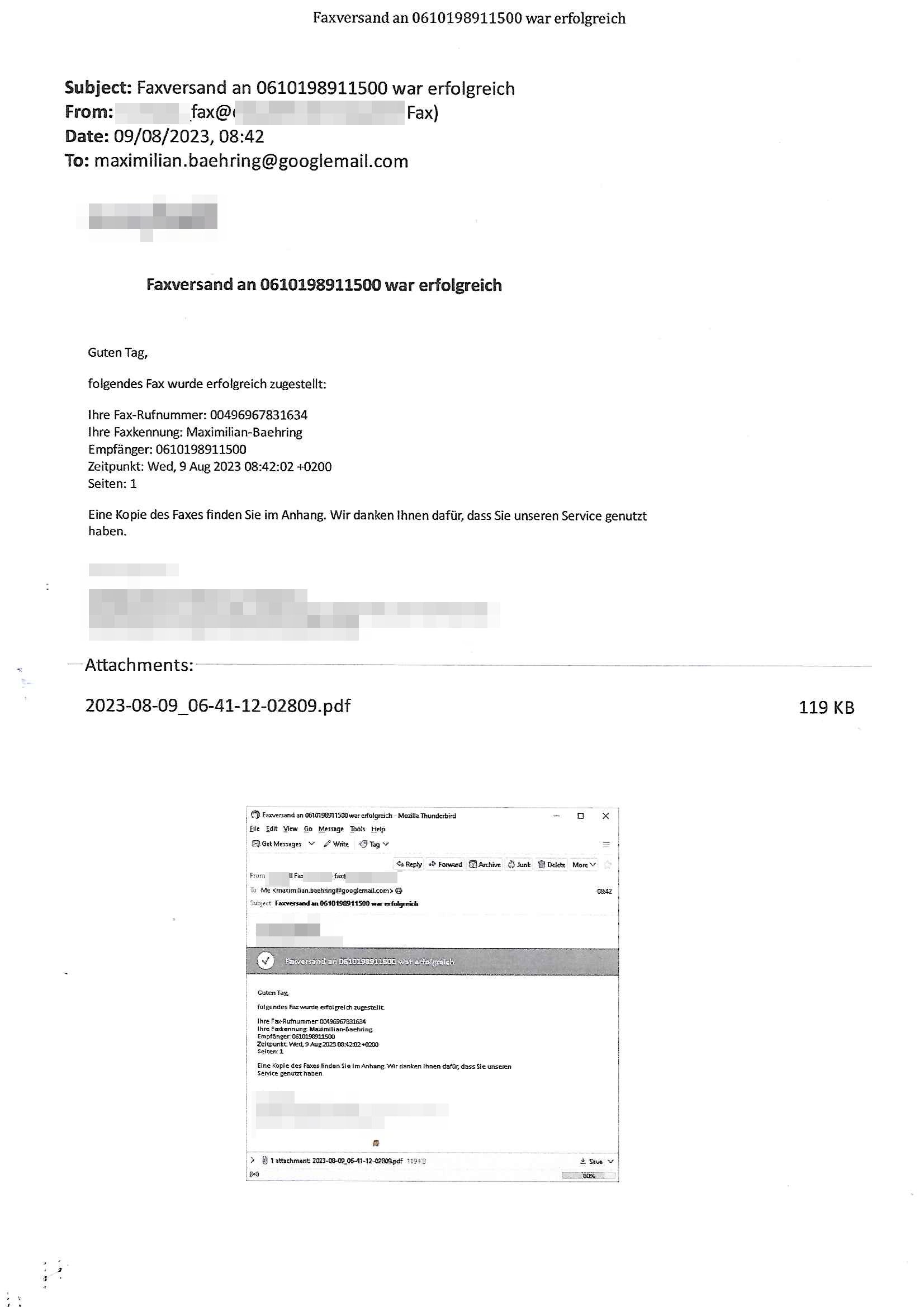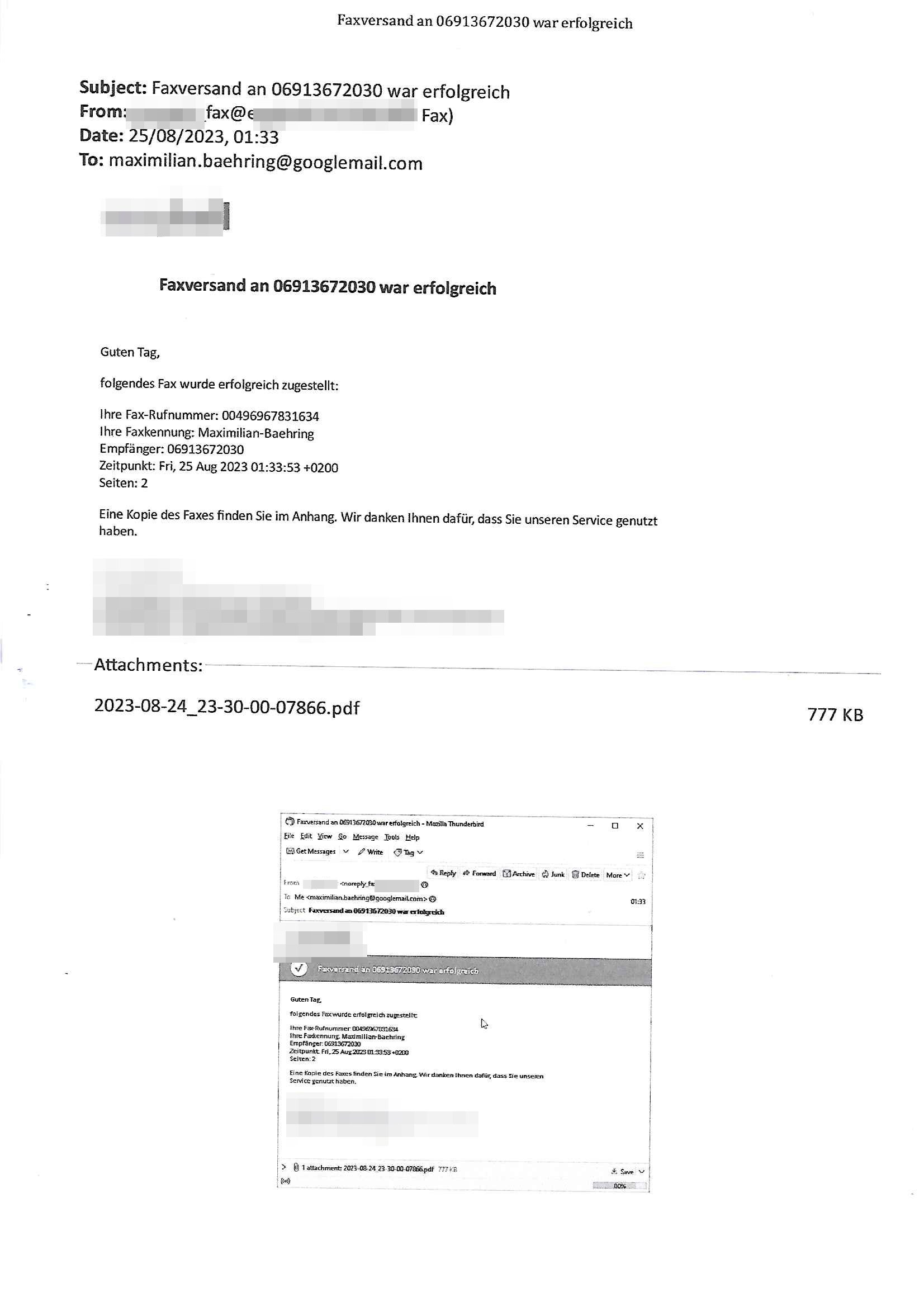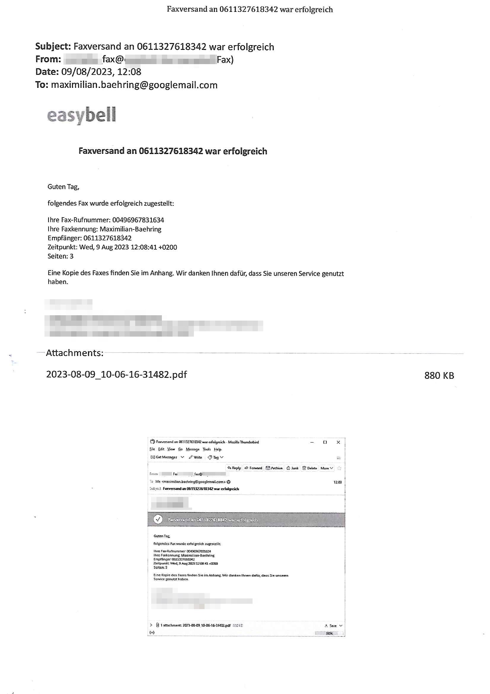Subject: AW: EILT! Berufung in 380 C 478/21 (14) Amtsgericht Frankfurt a.M. Höchst Date: Tue, 1 Aug 2023 14:38:05 +0200 From: Sekratariat (Kanzlei RA**Dar*) <sekretariat@ra*dar**> To: 'Maximilian Baehring' <maximilian@baehring.at>, radar*** Sehr geehrter Herr Baehring, vielen Dank für Ihre Anfrage: Ich habe keinerlei Kapazität Sie in Ihrer Berufungssache zu vertreten und kann auch keinen Kollegen hierfür empfehlen. Bitte sehen Sie von weiteren Anfragen in meinem Sekretariat ab. Bei Rückfragen stehe ich Ihnen gerne zur Verfügung. Mit freundlichen Grüßen M***Darr, Rechtsanwalt *** | *** * | 60*** Frankfurt am Main | Telefon +49 69 *** | Telefax: +49 69 ***| Email: Kanzlei@ra*dar*** -----Ursprüngliche Nachricht----- Von: Maximilian Baehring <maximilian@baehring.at> Gesendet: Dienstag, 1. August 2023 13:54 An: radar*** Betreff: EILT! Berufung in 380 C 478/21 (14) Amtsgericht Frankfurt a.M. Höchst wie telfonisch besprochen, auch schon als Fax Maximilian Baehring | |