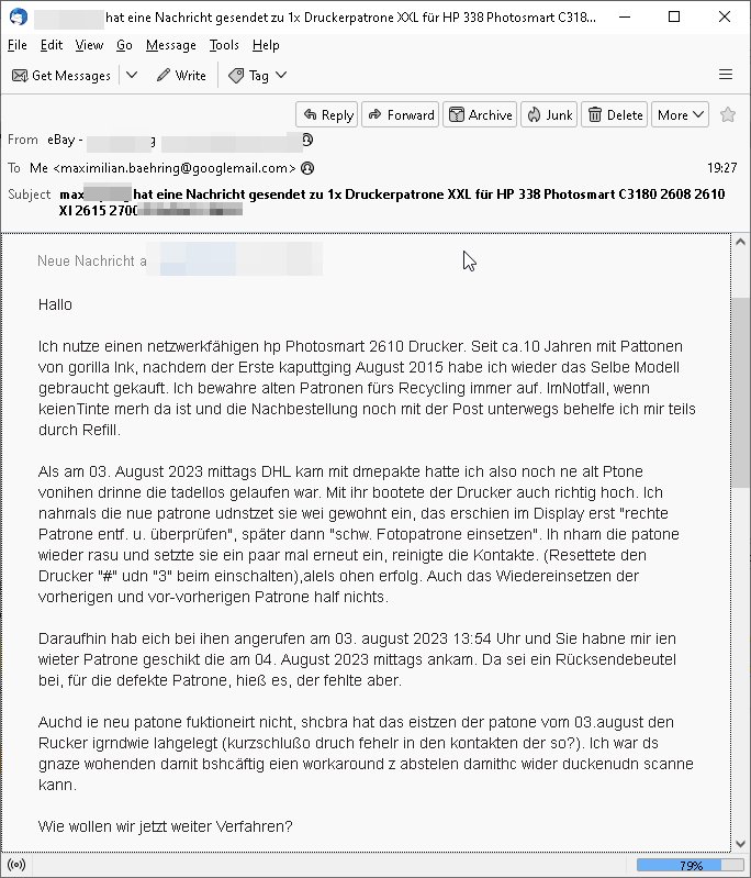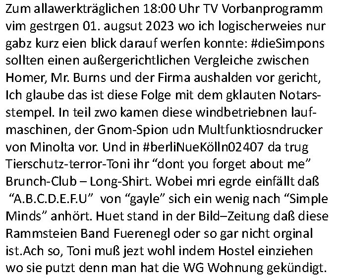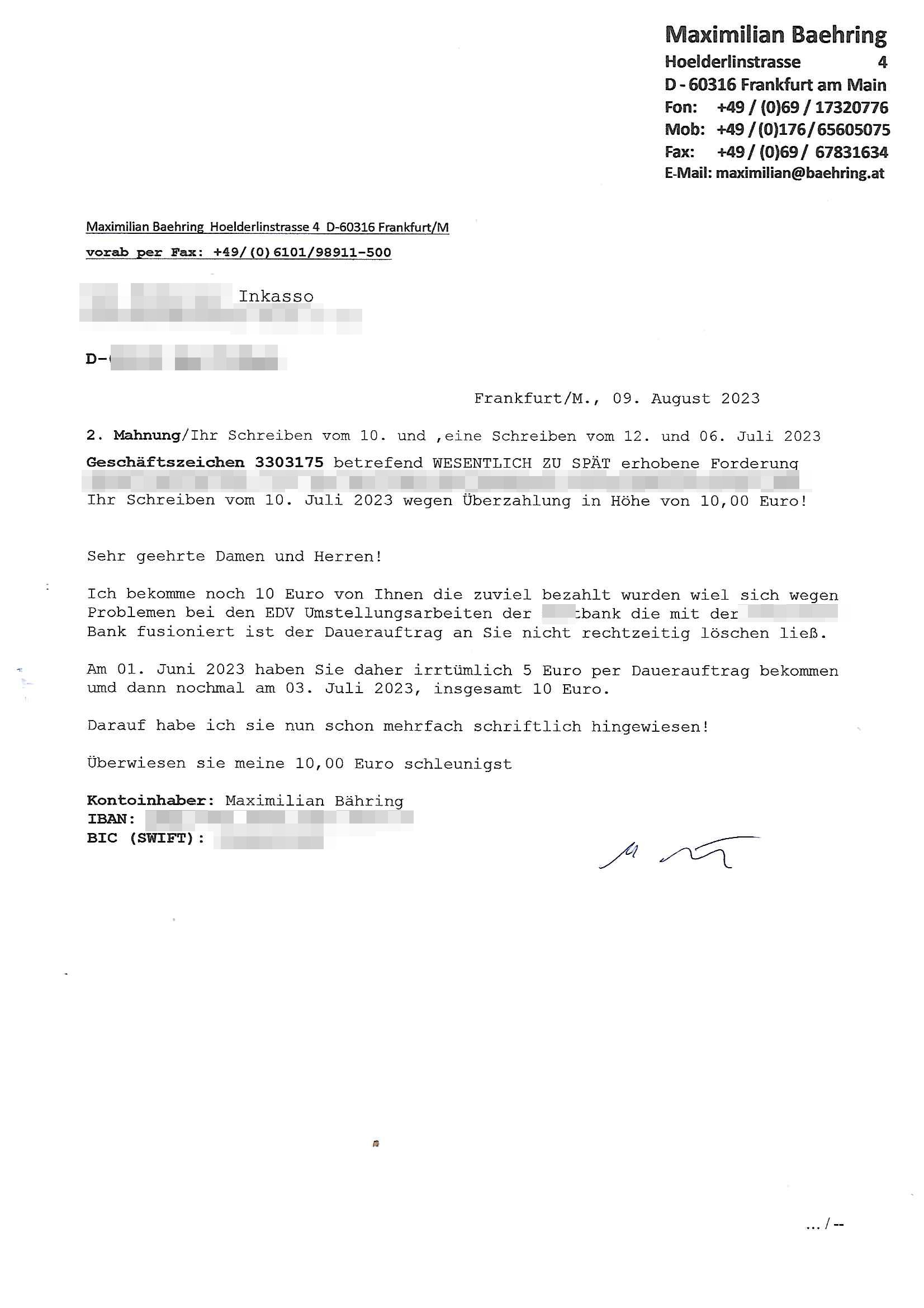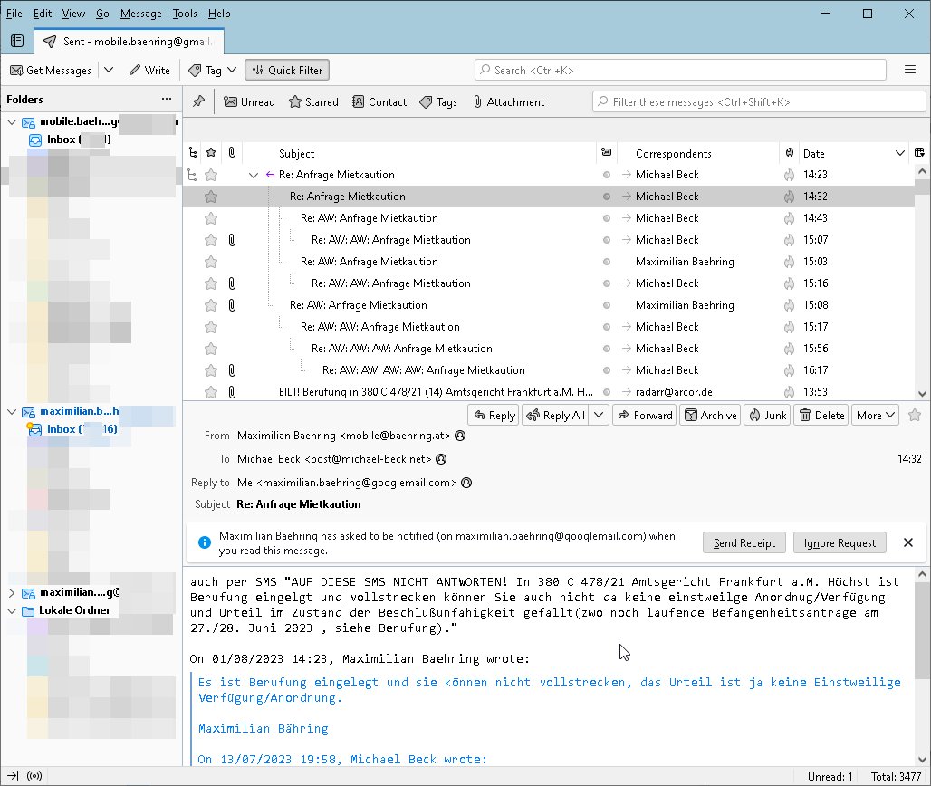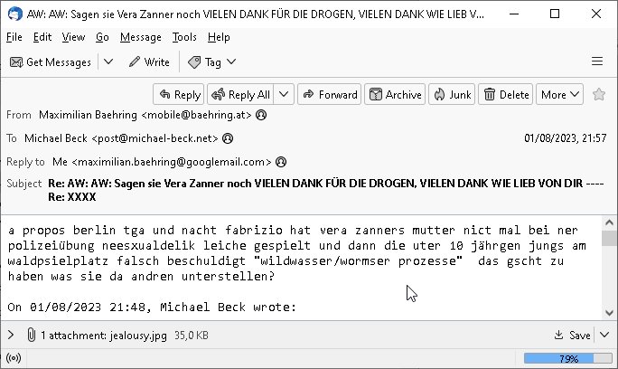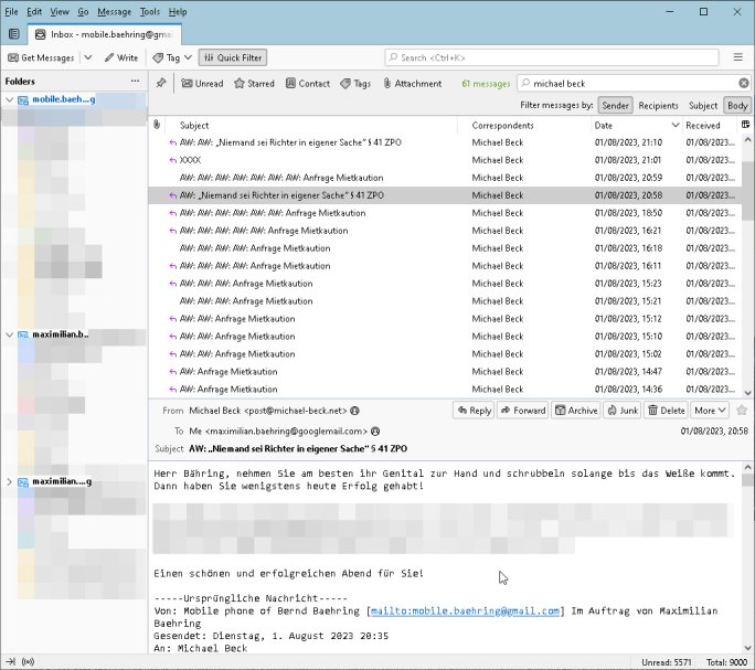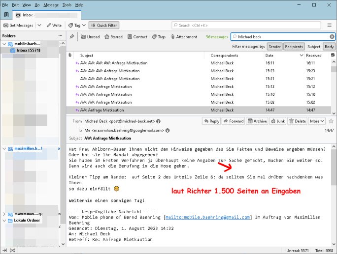 -------- Message -------- Subject: AW: Anfrage Mietkaution Date: Tue, 1 Aug 2023 14:47:41 +0200 From: Michael Beck <***> To: maximilian.baehring@googlemail.com Hat Frau A*lb**n-B***r Ihnen nicht den Hinweise gegeben das Sie Fakten und Beweise angeben müssen? Oder hat sie ihr Mandat abgegeben? Sie haben im Ersten Verfahren ja überhaupt keine Angaben zur Sache gemacht, machen Sie weiter so. Dann wird auch die Berufung in die Hose gehen. Kleiner Tipp am Rande: auf Seite 2 des Urteils Zeile 6: da sollten Sie mal drüber nachdenken was Ihnen so dazu einfällt :-) Weiterhin einen sonnigen Tag! -----Ursprüngliche Nachricht----- Von: *** Baehring [mailto:***.baehring@g***mail.com] Im Auftrag von Maximilian Baehring Gesendet: Dienstag, 1. August 2023 14:32 An: Michael Beck Betreff: Re: Anfrage Mietkaution auch per SMS "AUF DIESE SMS NICHT ANTWORTEN! In 380 C 478/21 Amtsgericht Frankfurt a.M. Höchst ist Berufung eingelgt und vollstrecken können Sie auch nicht da keine einstweilge Anordnug/Verfügung und Urteil im Zustand der Beschlußunfähigkeit gefällt(zwo noch laufende Befangenheitsanträge am 27./28. Juni 2023 , siehe Berufung)." On 01/08/2023 14:23, Maximilian Baehring wrote: > Es ist Berufung eingelegt und sie können nicht vollstrecken, das Urteil > ist ja keine Einstweilige Verfügung/Anordnung. > > Maximilian Bähring > > On 13/07/2023 19:58, Michael Beck wrote: ... | |
