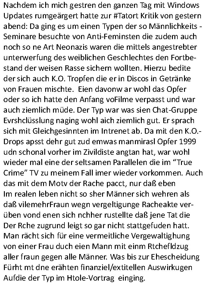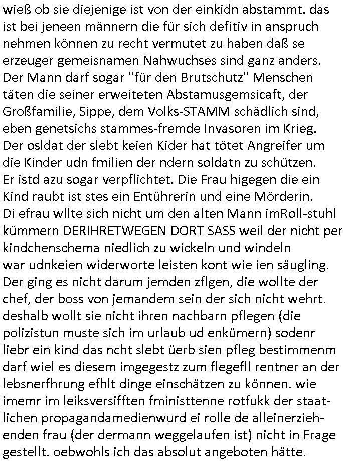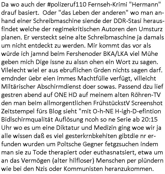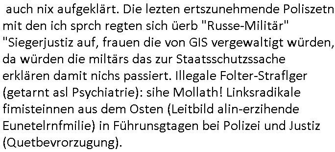 auch nix aufgeklärt. Die lezten ertszunehmende Poliszetn mit den ich sprch regten sich üerb "Russe-Militär" "Siegerjustiz auf, frauen die von GIS vergewaltigt würden, da würden die miltärs das zur Staatsschutzssache erklären damit nichs passiert. Illegale Folter-Straflger (getarnt asl Psychiatrie): sihe Mollath! Linksradikale fimisteinnen aus dem Osten (Leitbild alin-erzihende Eunetelrnfmilie) in Führunsgtagen bei Polizei und Justiz (Quetbevrorzugung). | |