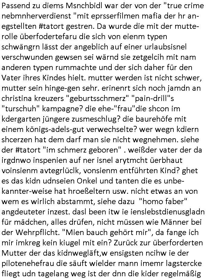 ausbüxten Kita Weingartenstraße. Der mit dem Darchen-steigensong "Steh auf" ("Rammstein"s "Till Lindemann") der dann Polzste wurde um Alkoholiker aus dem verkehr ziehen zu können - stellvertretend für seine Mutter! Also, der jungen Frau die inder gegnderumvögelete wurde das kind entführt udn der typ der dachte er sei der Erzeger dundder daher wegdem dem Kidne eine ebzihung zu ihr knüpfen wollte der wurd gegenüber der rpolzei als Stalker hingestellt. "er sie duchegderht aslöder dchet wer werde Water". Einnert mich alles an Ulrich rossmann udn zwogelisieg (mdiestens) Andrea Ressler. Entafürht dhtadas kidn aber jemdndrittes, einFrau den eigenes Kind gestorbenw ar daß sie erstzen wollte. ich fühlt mich ein weng an den Horrorfilem "die hand an der Wiege" erinenrt. Zu rhct nahm die komissarin von anfagn an an eine Frau mit ner kinderwunsch-Störung ienrpschsichscn sie dei Täterin. Was die die ja kein anrhct auf ein BRUSTCHUTZ istsinkt hat dannalels atat um das kidndas nicht vonrhe abstmmte zu "beschützen"ist ja auchalels tarafer, anders als wennein avter im kreg eien iavsoren urschießt um das ahsue seiner kleien famile zu beshützen vor de fremdn armee. Vertedigungdes grund-eiegtums gene en btügerbdne, das ist strafrfreies töten. Hier zhähl de BRUTSCHUTZINSTKINT. den auchder an-gebnliche Stlekr der von ich zu unrehct annimmt vater zu sin für sich inAspruch nehmrn, anders als die eine "mater semepr certa est" mutter die auch als leihmutter wieß ob sie diejenige ist von der einkidn abstammt. das ist bei jeneen männern die für sich defitiv in anspruch nehmen können zu recht vermutet zu haben daß se erzeuger gemeisnamen Nahwuchses sind ganz anders. Der Mann darf sogar "für den Brutschutz" Menschen täen die seiner erweiteten Abstamusgemsicaft, der Großfamilie, Sippe, dem Volks-STAMM schädlich sind, eben genetsichs stammes-fremde Invasoren im Krieg. Der osldat der slebt keien Kider hat tötet Angreifer um die Kinder udn fmilien der ndern soldatn zu schützen. Er istd azu sogar verpflichtet. Die Frau higegen die ein Kind raubt ist stes ein Entührerin und eine Mörderin. Di efrau wllte sich nicht um den alten Mann imRoll-stuhl kümmern DERIHRETWEGEN DORT SASS weil der nicht per kindchenschema niedlich zu wickeln und windeln war udnkeien widerworte leisten kont wie ien säugling. Der ging es nicht darum jemden zflgen, die wollte der chef, der boss von jemandem sein der sich nicht wehrt. deshalb wollt sie nicht ihren nachbarn pflegen (die polizistun muste sich im urlaub ud enkümern) sodenr liebr ein kind das ncht slebt üerb sien pfleg bestimmenm darf wiel es diesem imgegestz zum flegefll rentner an der lebsnerfhrung efhlt dinge einschätzen zu können. wie imemr im leiksversifften fministtenne rotfukk der staat-lichen propagandamedienwurd ei rolle de alleinerzieh-enden frau (der dermann weggelaufen ist) nicht in Frage gestellt. oebwohls ich das absolut angeboten hätte. https://www.tvinfo.de/fernsehprogramm/1733450176-polizeiruf-110 | |
