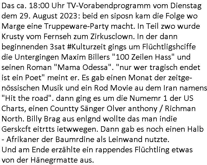https://www.tvinfo.de/fernsehprogramm/1747166060-die-simpsons https://www.tvinfo.de/fernsehprogramm/1747166070-die-simpsons https://www.tvinfo.de/fernsehprogramm/1731158744-kulturzeit | |