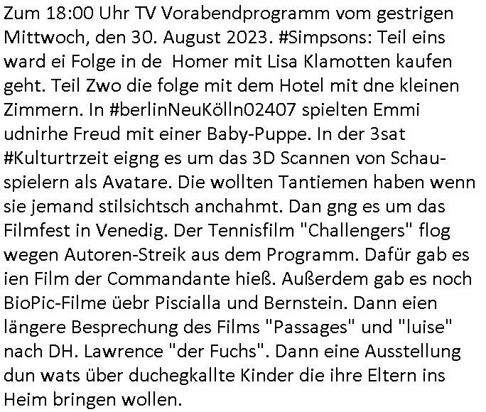 Vorabendprogramm vom gestrigen Mittwoch, den 30. August 2023.