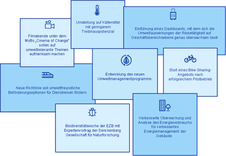 Ein ausführlicherer Überblick über sämtliche Umweltziele und -maßnahmen findet sich in Kapitel 5 – der CO2-Fußabdruck der EZB sowie in Kapitel 6 – Umweltaspekte und -auswirkungen der EZB-Aktivitäten.