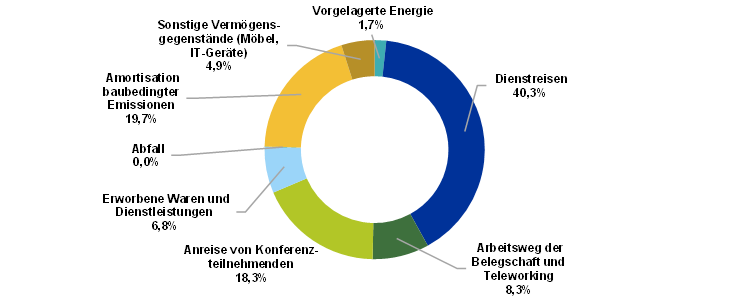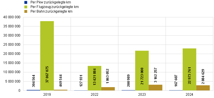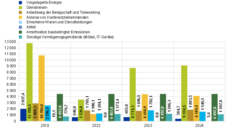 2024 war das zweite Jahr, in dem der Betrieb der EZB wieder komplett ohne pandemiebedingte Einschränkungen ablief. In den Jahren 2020 bis 2022 waren diese Einschränkungen deutlich zu spüren: Dienstreisen waren zu der Zeit nur sehr begrenzt möglich, und auch die Präsenzarbeit in den EZB-Bürogebäuden war eingeschränkt. 2023 wurden die Einschränkungen aufgehoben und die EZB kehrte zum normalen Geschäftsbetrieb zurück. Infolgedessen vergrößerte sich ihr CO2-Fußabdruck wieder, insbesondere wegen des Anstiegs der Emissionen aus Dienstreisen. Diese Emissionsart legte 2024 leicht um 5 % zu, während die Emissionen aus Reisen wegen Konferenzteilnahme um 6 % gegenüber dem Vorjahr abnahmen. Diese beiden Emissionsquellen bleiben wichtige Arbeitsschwerpunkte für die EZB bei den Anstrengungen zur weiteren Verringerung ihrer Klimaauswirkungen (siehe Kapitel 5.2 – Indirekte Emissionen).