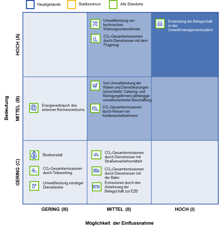 Die Weiterentwicklung des Umweltmanagementsystems der EZB wird nach wie vor maßgeblich davon abhängen, wie sich das Umfeld der Organisation verändert. Dabei spielt auch eine Rolle, welche neuen Chancen und Risiken sich ergeben und wie sich die Erwartungen der Interessenträger entwickeln. Wesentliche Risiken, vor allem physische Risiken und Übergangsrisiken, die den internen Geschäftsbetrieb potenziell betreffen, müssen im Zuge der jährlichen Prozesse des Umweltmanagementsystems bewertet werden.