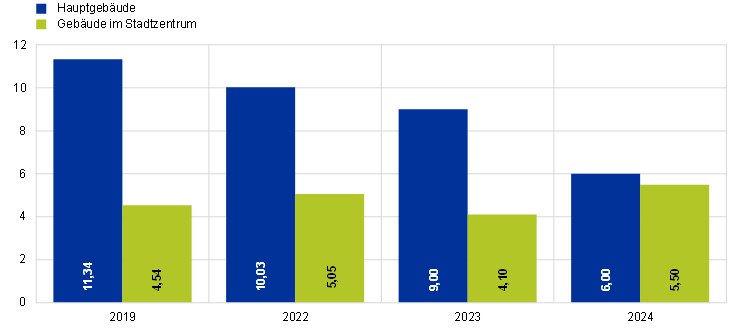 Die Umwelterklärung 2025 der EZB liefert wie gesagt Umweltdaten zu den drei im Umweltmanagementsystem erfassten Gebäuden der EZB. Dabei handelt es sich um das EZB-eigene Hauptgebäude sowie den Eurotower und das Japan Center. Letztere befinden sich im Stadtzentrum von Frankfurt am Main und werden von der EZB angemietet. Die Daten für das Hauptgebäude werden separat von den aggregierten Daten für den Eurotower und das Japan Center ausgewiesen. Die EZB belegt in allen drei Gebäuden jeweils die gesamte Bürofläche.
