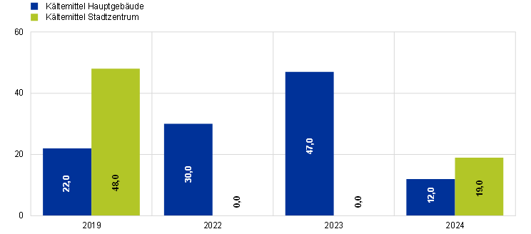 2024 wurde 0,7 % (46,6 Megawattstunden) des Heiz- und Kühlenergieverbrauchs des EZB-Hauptgebäudes mit Erdwärme gedeckt.