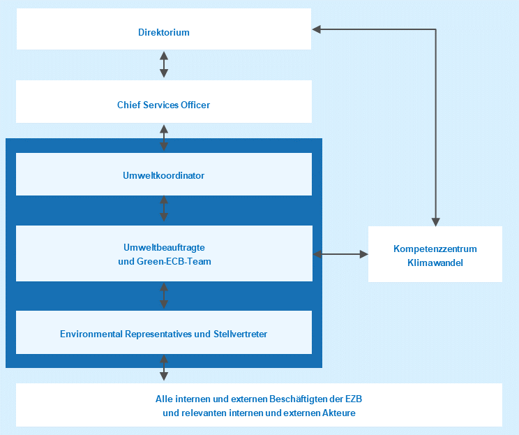 Das Green-ECB-Team ist für alle Elemente des Umweltmanagementsystems zuständig und koordiniert die damit verbundenen Aktivitäten gemeinsam mit diversen Interessenträgern. Geleitet wird das Team von einem Umweltkoordinator und einem Umweltbeauftragten. Diese Personen werden vom EZB-Direktorium ernannt und von Umweltexperten unterstützt. Damit das Umweltmanagementsystem überall in der EZB wirkungsvoll umgesetzt wird, ernennen die höheren Führungskräfte Environmental Representatives für ihren jeweiligen Geschäftsbereich. Über den Chief Services Officer berichten Umweltkoordinator und Umweltbeauftragter dem Direktorium über Themen, die mit dem Umweltmanagementsystem und seiner Leistungsfähigkeit zusammenhängen.