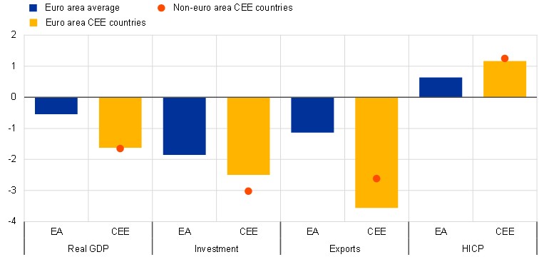 Unlike in the euro area as a whole, geopolitical shocks in CEE countries had a bigger impact on exports than on investment. This is largely due to their strong connections to global trade and supply chains, their reliance on external demand and their pre-war economic ties with Russia. As many of these connections have been disrupted by the war in Ukraine, the export sectors in CEE countries are particularly sensitive to these geopolitical challenges.