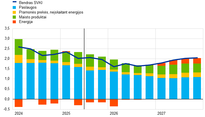 Infliacijos perspektyva atitinka infliacijos stabilizavimosi ties vidutinio laikotarpio tiksliniu 2 % lygiu prognozę. Numatoma, kad bendroji infliacija, vertinama pagal suderintą vartotojų kainų indeksą (SVKI), artimiausiu laikotarpiu iš esmės nesikeis ir kitą 2025 m. dalį bus apie 2 %, bet 2026 m. sumažės iki 1,7 %, o 2027 m. vėl padidės iki 1,9 %. Sumažėjimas 2026 m. susijęs su toliau laipsniškai švelnėjančiomis ne energetikos dedamosiomis, o energijos kainų kilimas turėtų toliau būti nepastovus, bet prognozių laikotarpiu padidėti iš dalies dėl to, kad 2027 m. pradės veikti naujoji ES apyvartinių taršos leidimų prekybos sistema (ATLPS2). Numatoma, kad iš pradžių maisto produktų kainos toliau kils dėl uždelsto anksčiau kilusių tarptautinių maisto žaliavų kainų poveikio, bet 2026 ir 2027 m. kilimas sumažės ir bus šiek tiek didesnis nei 2 %. Infliacija pagal SVKI, neįskaitant energijos ir maisto produktų, turėtų sumažėti, nes slopsta spaudimas darbo užmokesčiui ir lėtėja paslaugų kainų kilimas, o euro pabrangimas veikia kainų nustatymo grandinę ir varžo prekių kainų kilimą. Numatoma, kad, lėčiau kylant darbo užmokesčiui, nes jau kompensuotas ankstesnis realiojo darbo užmokesčio mažėjimas, ir kartu atsigaunant našumui, gerokai lėčiau didės vienetinės darbo sąnaudos. Palyginti su 2025 m. birželio mėn. prognozėmis, bendrosios infliacijos pagal SVKI prognozė 2025 ir 2026 m. padidinta 0,1 procentinio punkto dėl didesnių numatomų energijos žaliavų kainų bei prielaidų, taip pat dėl uždelsto didesnių tarptautinių maisto žaliavų kainų poveikio, kuris su kaupu atsveria euro pabrangimą. Numatoma, kad visus 2027 m. bus juntamas uždelstas euro pabrangimo poveikis, todėl tų metų prognozė sumažinta 0,1 procentinio punkto.
