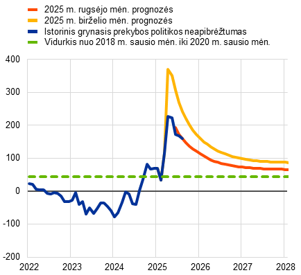 Pastabos: a grafike parodytas „grynasis“ prekybos politikos neapibrėžtumo matas (žr. 5 išnašą). Paskutiniai duomenys – 2025 m. liepos mėn. B grafike į įverčius neįtrauktas muitų poveikis techninėms prielaidoms (pvz., dėl valiutos kurso).