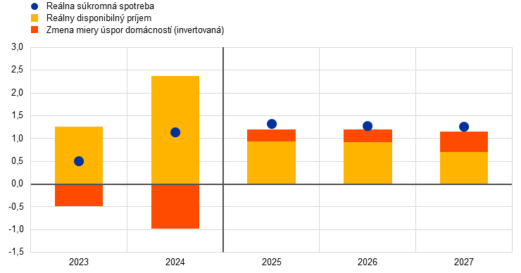 Hybnou silou rastu reálneho HDP by mala byť aj naďalej súkromná spotreba. Z hľadiska výdavkov (graf 2, panel a) sa počas sledovaného obdobia predpokladá výrazný rast súkromnej spotreby, ktorá by mala k rastu reálneho HDP prispieť najviac. Okrem toho by sa v rokoch 2025 až 2027 mala každoročne zvyšovať spotreba verejnej správy a celkové investície, pričom súkromné investície by mali kompenzovať očakávaný silný skokový efekt vo verejných investíciách v roku 2027 v dôsledku ukončenia financovania z grantov NGEU. Naopak, príspevok čistého vývozu k rastu reálneho HDP by mal byť v rokoch 2025 a 2026 záporný, pričom príspevok dovozu (-1,2 percentuálneho bodu a -0,9 percentuálneho bodu) má prevýšiť príspevok vývozu (0,6 percentuálneho bodu, resp. 0,5 percentuálneho bodu). Tento vplyv je však čiastočne vykompenzovaný kladným príspevkom zmien zásob v roku 2025 (graf 2, panel b). Vysoko volatilné zmeny zásob v priebehu roka 2025 súvisia s hromadením a znižovaním zásob v kontexte účinkov predzásobovania a ich ústupu.