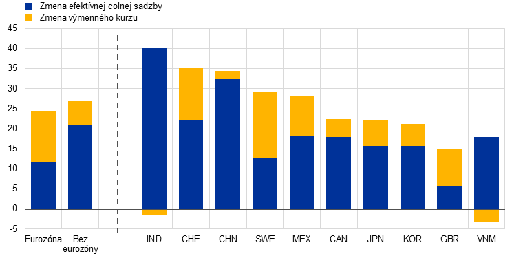 V dôsledku obchodnej dohody medzi USA a EÚ a iných oznámení sú efektívne colné sadzby na dovoz USA z eurozóny a všetkých jej obchodných partnerov v porovnaní s projekciami z júna 2025 vyššie. Projekcie odborníkov ECB zohľadňujú colné sadzby, odklady a výnimky platné v čase uzávierky projekcií (28. augusta) a predpokladajú, že zostanú na rovnakej úrovni počas celého sledovaného obdobia.