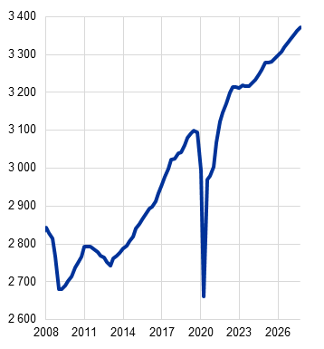 Poznámky: Údaje sú očistené od sezónnych vplyvov a rozdielov v počte pracovných dní. Historické údaje sa môžu líšiť od najnovších publikácií Eurostatu vydaných po uzávierke projekcií. Zvislá čiara označuje začiatok projektovaného obdobia. Revízie sa počítajú na základe nezaokrúhlených hodnôt.