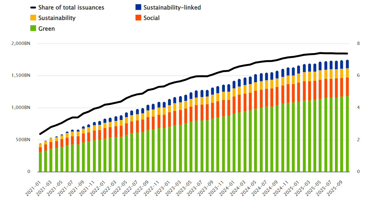 The outstanding amount of sustainable debt securities issued in the euro area has nearly quadrupled in the last four years, rising from EUR 453 billion in January 2021 to EUR 1.74 trillion in September 2025. However, more recently, the growth rate has slowed, as the total euro area issuances of sustainable debt securities increased by 10% over the past 12 months, compared with 20% the year before. Similar trends are observed for holdings of sustainable debt securities in the euro area. Total holdings continue to grow, reaching EUR 1.96 trillion in June 2025, 14% higher than in June 2024, while the growth rate the year before was 20%.