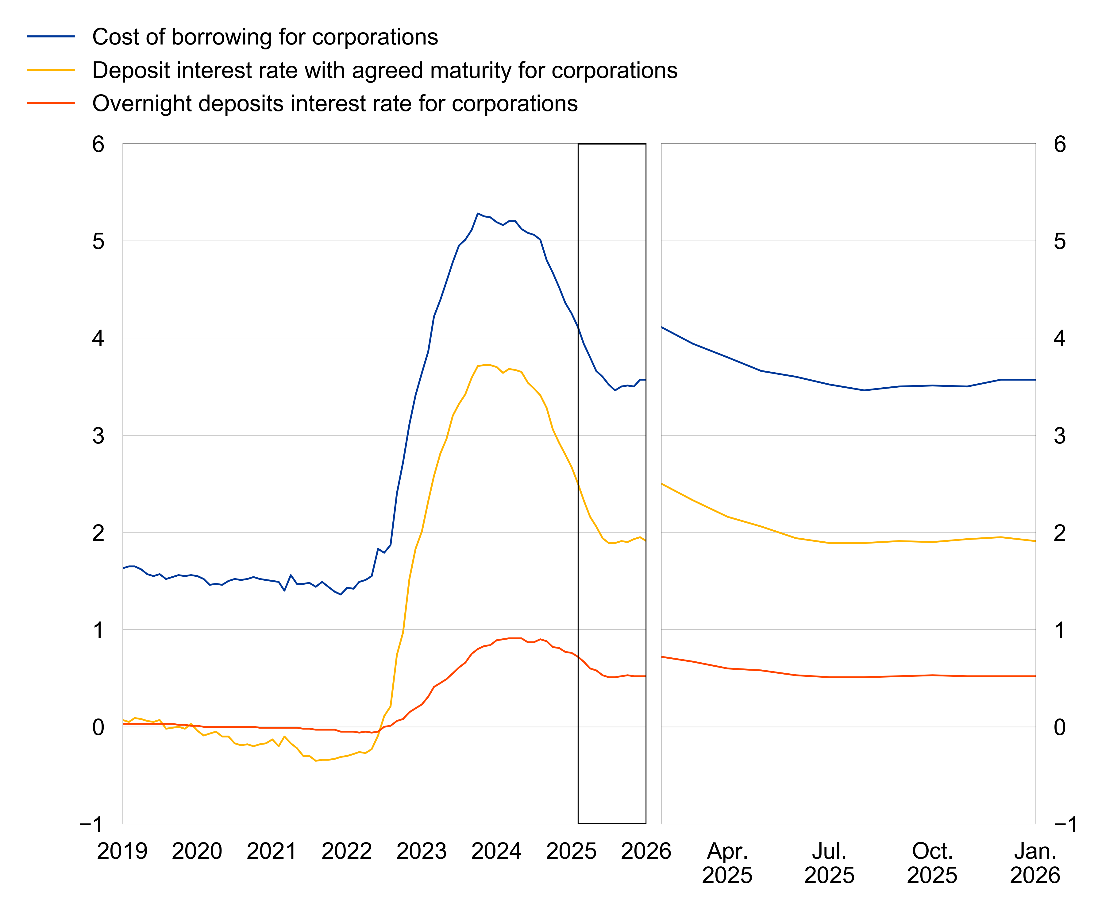 The composite cost-of-borrowing indicator, which combines interest rates on all loans to corporations, showed no change in January 2026. The interest rate on new loans of over €1 million with a floating rate and an initial rate fixation period of up to three months remained broadly unchanged at 3.29%. The rate on new loans of the same size with an initial rate fixation period of over three months and up to one year fell by 9 basis points to 3.45%, driven by both the interest rate and the weight effects. The interest rate on new loans of over €1 million with an initial rate fixation period of over ten years decreased by 12 basis points to 3.53%. In the case of new loans of up to €250,000 with a floating rate and an initial rate fixation period of up to three months, the average rate charged fell by 6 basis points to 3.59%.