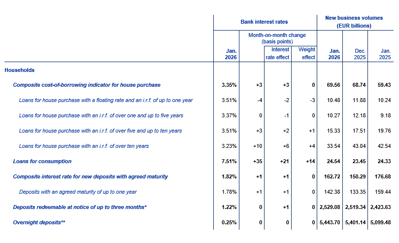 The composite cost-of-borrowing indicator, which combines interest rates on all loans to households for house purchase, remained broadly unchanged in January 2026. The interest rate on loans for house purchase with a floating rate and an initial rate fixation period of up to one year decreased by 4 basis points to 3.51%, driven by both the interest rate and the weight effects. The rate on housing loans with an initial rate fixation period of over one and up to five years stayed constant at 3.37%. The interest rate on loans for house purchase with an initial rate fixation period of over five and up to ten years remained broadly unchanged at 3.51%. The rate on housing loans with an initial rate fixation period of over ten years rose by 10 basis points to 3.23%, driven by both the interest rate and the weight effects. In the same period the interest rate on new loans to households for consumption increased by 35 basis points to 7.51%.