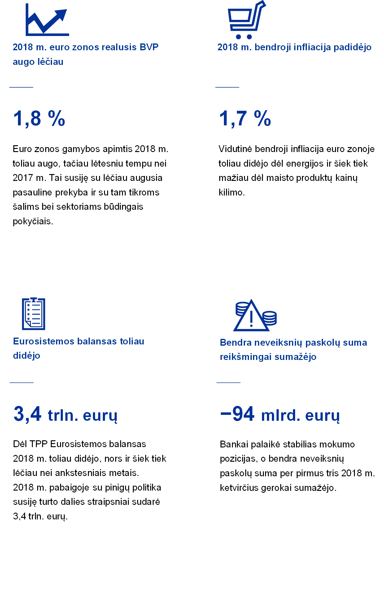 2018 m. euro zonos ekonomika toliau augo, tačiau lėtesniu tempu. Augimas, 2017 m. sudaręs 2,5 %, 2018 m. sumažėjo iki 1,8 % dėl įvairių tais metais pasireiškusių nepalankių veiksnių. Gerokai sumažėjusi pasaulinė prekyba ir tam tikri veiksniai, būdingi atskiroms šalims bei sektoriams, darė neigiamą įtaką visų pirma išorės sektoriui ir gamybai.