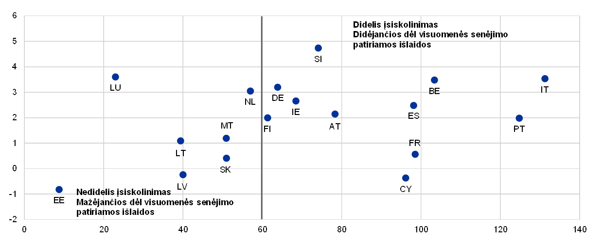 Pastaba: Graikija neįtraukta, nes 2017 m. šios valstybės skolos rodiklis sudarė 176,1 % BVP, o bendrosios dėl visuomenės senėjimo patiriamos išlaidos sumažėjo 4,6 % BVP.
