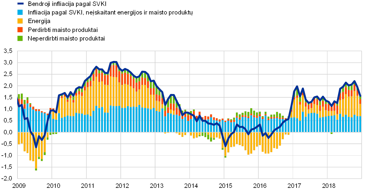 2017 m. augusi ypač sparčiu tempu, euro zonos ekonomika augo ir 2018 m., nors ir šiek tiek lėčiau, nes išorės paklausa sumažėjo, o kai kurie atskiroms šalims bei sektoriams būdingi veiksniai slopino augimą. Be to, išliko vidaus paklausą lemiantys veiksniai. Toliau gerėjančios sąlygos darbo rinkose skatino privatų vartojimą, o verslo investicijoms ir toliau teigiamą įtaką darė palankios finansavimo sąlygos ir gerėjantys balansai. Vidaus sąnaudų spaudimas tebestiprėjo ir apėmė vis daugiau sektorių dėl tebesitęsiančio ekonomikos augimo ir didėjančios įtampos darbo rinkose. Grynosios infliacijos rodikliai iš esmės tebėra nedideli. Tačiau, vertinant ateities perspektyvas, pažymėtina, kad grynoji infliacija, skatinama ECB pinigų politikos priemonių, tebesitęsiančio ekonomikos augimo ir kylančio darbo užmokesčio, vidutiniu laikotarpiu turėtų didėti.