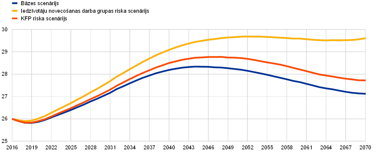 Piezīmes. KFP riska scenārijs paredz virzību uz zemāku KFP pieauguma tempu līdz 2070. gadam (t.i., 0.8%, nevis 1%). Iedzīvotāju novecošanas darba grupas riska scenārijs paredz, ka būs lielāka ienākumu elastība attiecībā uz veselības aprūpes izdevumiem (jo tiks vairāk lietotas dārgas medicīnas tehnoloģijas) un augstākas ilgtermiņa aprūpes izmaksas (jo palielināsies ilgtermiņa aprūpes saņēmēju skaits un uzlabosies reālais dzīves līmenis).