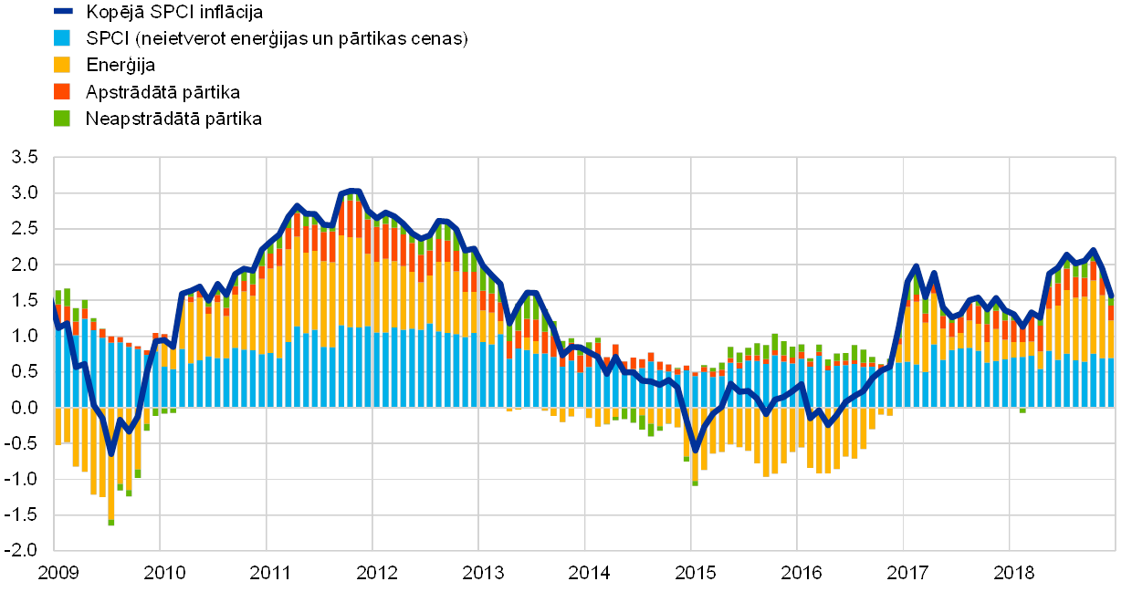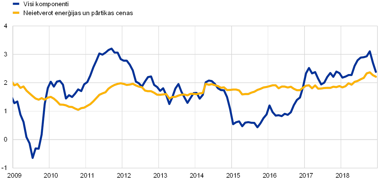 Kopējā inflācija salīdzinājumā ar iepriekšējo gadu pieauga (2018. gadā vidēji – 1.7%), lai gan tas galvenokārt atspoguļoja augstākas enerģijas cenas. Pamatinflācijas rādītāju dinamika visu gadu kopumā bija horizontāla. Taču iekšzemes pieprasījuma, darba tirgus un darba samaksas perspektīva radīja pamatu pārliecībai, ka inflācija vidējā termiņā turpinās tuvināties mūsu mērķim atbilstošam līmenim.