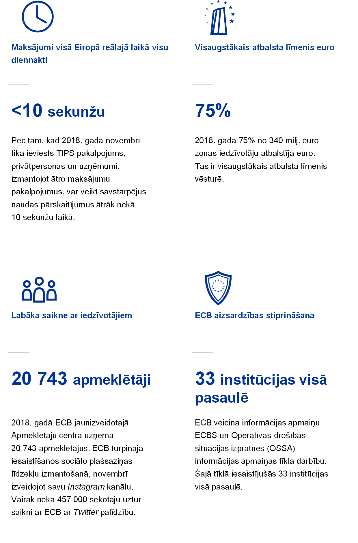 Nozīmīga dinamika 2018. gadā bija vērojama arī euro maksājumu jomā. Novembrī Eurosistēma ieviesa TARGET ātro maksājumu norēķinu (TIPS) pakalpojumu, kas ļauj veikt ātros maksājumus visu diennakti ātrāk nekā 10 sekunžu laikā.