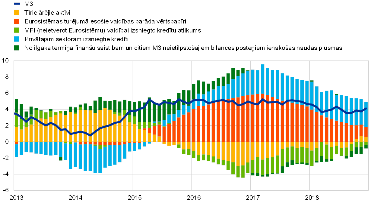Pēc 2017. gadā vērotās īpaši spēcīgās izaugsmes dinamikas euro zonas ekonomiskais kāpums turpinājās arī 2018. gadā, tomēr pieauguma temps bija mērenāks. To noteica ārējā pieprasījuma pavājināšanās un daži atsevišķām valstīm un sektoriem raksturīgi izaugsmi mazinoši faktori. Vienlaikus iekšzemes pieprasījuma kāpuma pamatā esošie faktori saglabājās. Turpmāki uzlabojumi darba tirgos veicināja privāto patēriņu, bet ieguldījumus uzņēmējdarbībā joprojām pozitīvi ietekmēja labvēlīgi finansēšanas nosacījumi un bilanču uzlabošanās. Darba tirgu paplašināšanās un arvien ierobežotāks darbaspēka piedāvājums arī noteica turpmāku iekšzemes cenu spiediena pastiprināšanos un paplašināšanos. Vienlaikus pamatinflācijas rādītāju pieaugums kopumā joprojām bija neliels. Tomēr nākotnē gaidāms, ka pamatinflācija vidējā termiņā pakāpeniski palielināsies. To veicinās ECB monetārās politikas pasākumi, turpmāka ekonomiskā izaugsme un straujāks darba samaksas kāpums.