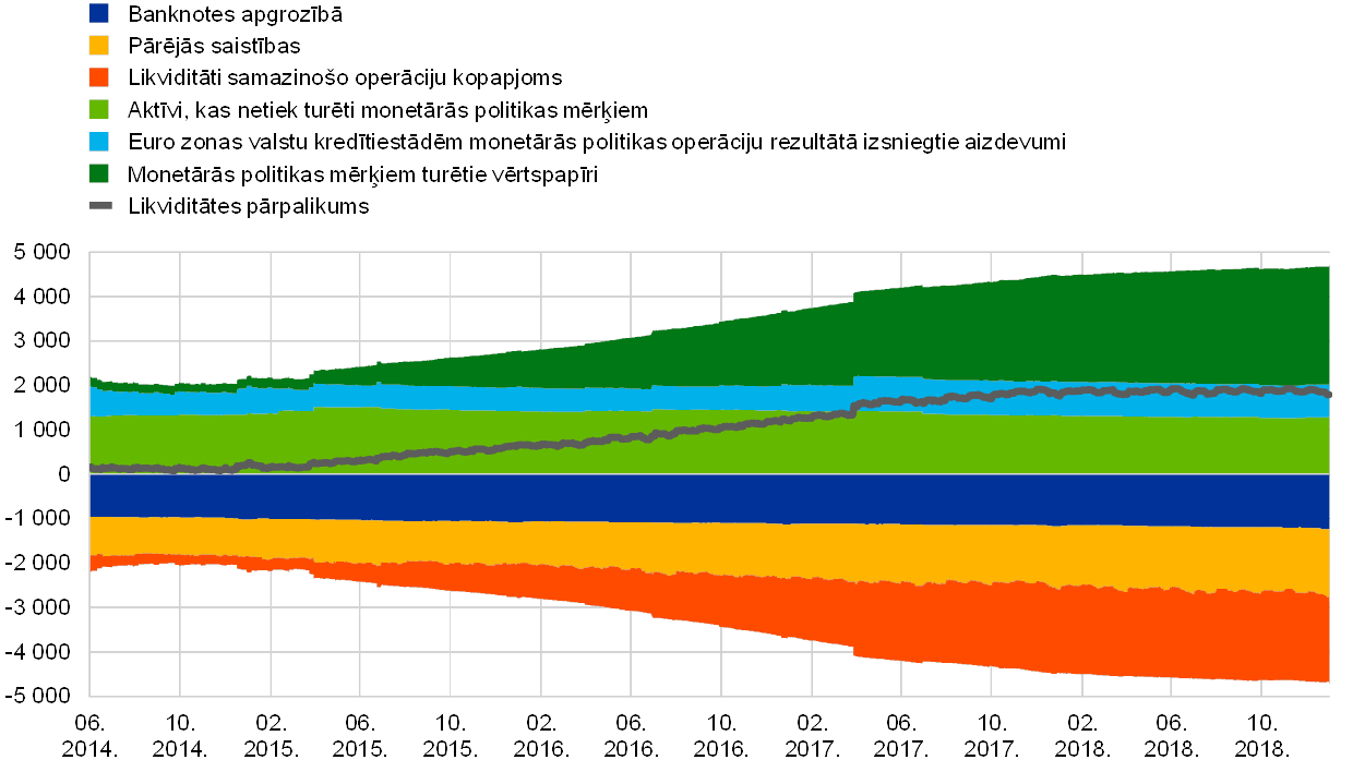 Tāpēc Padome 2018. gada jūnijā paredzēja ar septembri samazināt aktīvu iegādes programmas (AIP) ietvaros veikto neto aktīvu iegāžu mēneša apjomu līdz 15 mljrd. euro un pēc tam decembrī – ja saņemtie dati joprojām apstiprinās tās vidējā termiņa inflācijas perspektīvu – neto iegādes pārtraukt. Vienlaikus Padome paziņoja, ka paredz galveno ECB procentu likmju saglabāšanos pašreizējā līmenī vismaz līdz 2019. gada vasarai[1] un jebkurā gadījumā tik ilgi, cik tas būs nepieciešams, lai nodrošinātu inflācijas līmeņa attīstības turpmāku atbilstību noturīgas inflācijas līmeņa korekcijas gaidām.