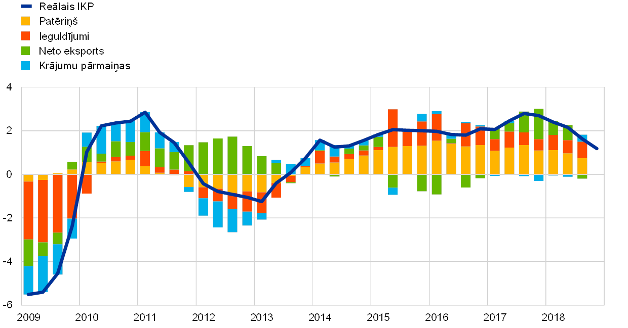 Pēc īpaši spēcīgas izaugsmes dinamikas 2017. gadā euro zonas reālā IKP pieaugums 2018. gadā kļuva mērenāks, sarūkot līdz 1.8% (sk. 4. att.). Lai gan tempa samazināšanos galvenokārt noteica pasaules tirdzniecības izaugsmes pavājināšanās, nozīme bija arī citiem īslaicīgāka rakstura faktoriem. 2018. gada 1. pusgadā vairākās valstīs produkcijas izlaidi ietekmēja ar laikapstākļiem saistīti ražošanas pārrāvumi un protesta akcijas, īpaši transporta nozarē. 2. pusgadā un īpaši 3. ceturksnī pasaules mēroga saskaņotās vieglo transportlīdzekļu pārbaudes procedūras ieviešana ar 1. septembri izraisīja būtisku pārrāvumu automobiļu ražošanā. Turklāt izaugsmes sarukumu, iespējams, pastiprināja politiskās nenoteiktības pieaugums, īpaši saistībā ar iespējamo protekcionisma kāpumu.